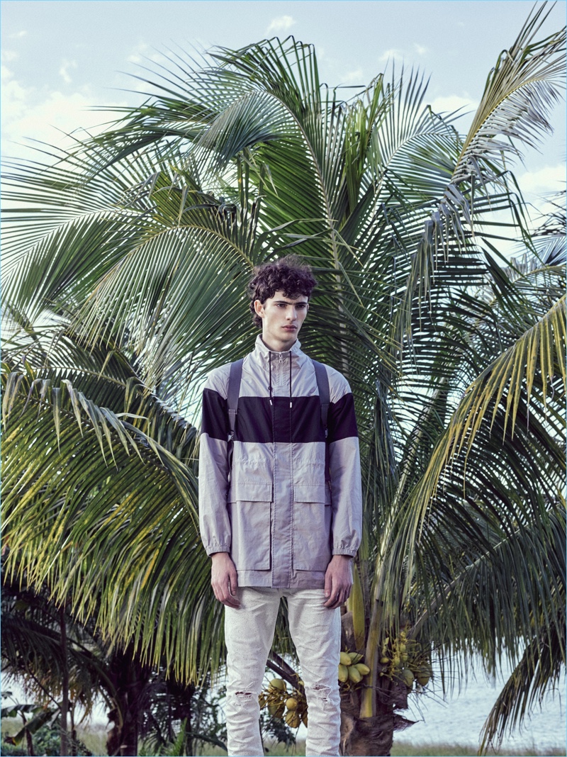 Embracing a sporty style moment, Piero Mendez wears a pullover windbreaker from John Elliott.