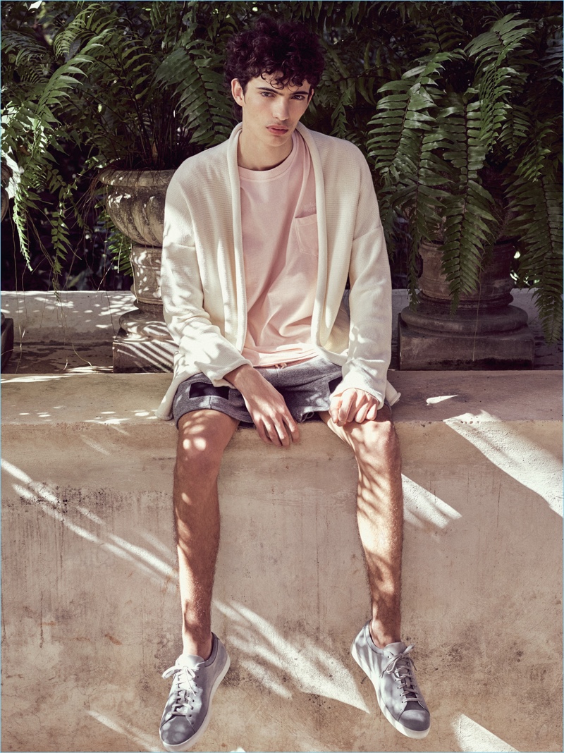 Piero Mendez dons a pale pink pocket tee with a cardigan and shorts by John Elliott.