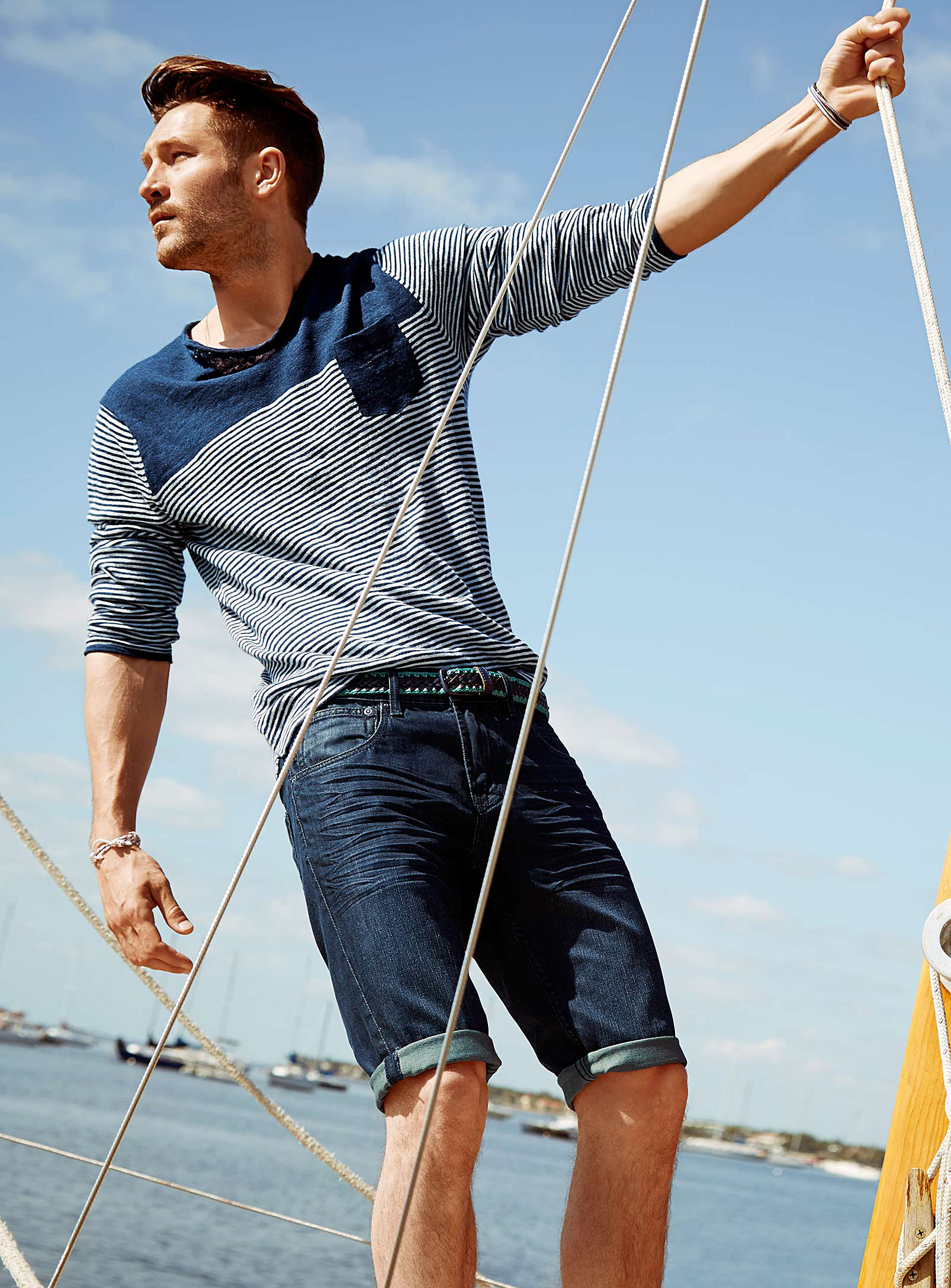 Easily donning a textured cardigan and sporty jersey Bermuda or wearing the classic striped sailor sweater, John gets ready to sail with a new and updated wardrobe.