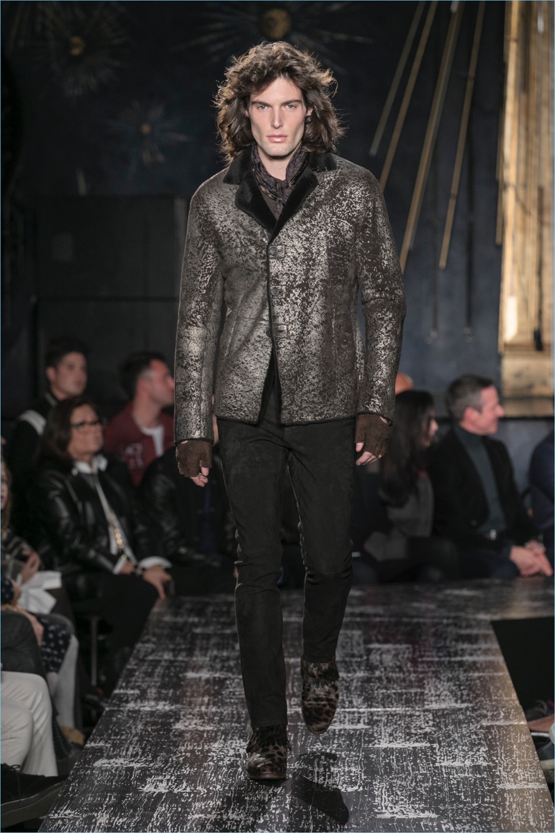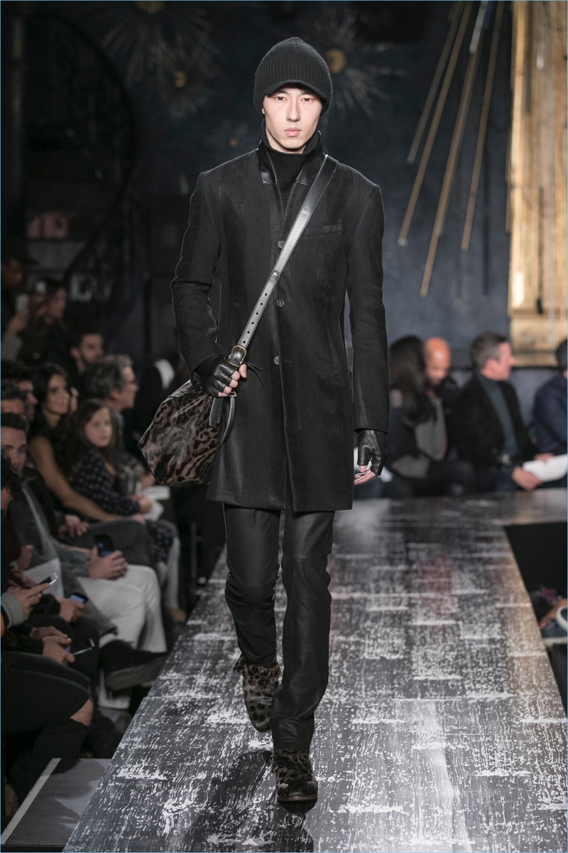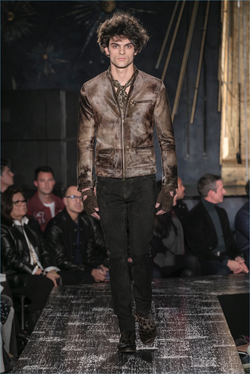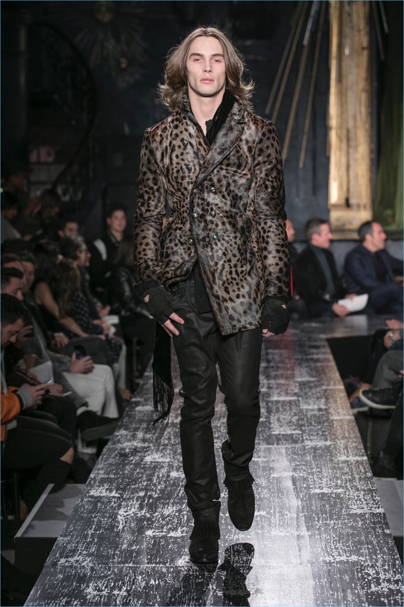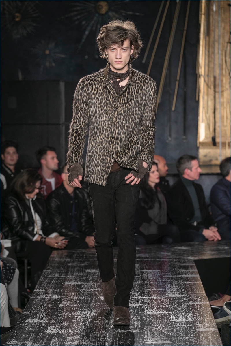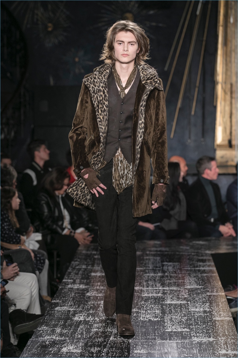 John Varvatos presents his fall-winter 2017 collection, Wild at Heart. The range takes on a romantic vision of urban life with the designer’s signature downtown cool. Offering a spin on the rebellious with exquisite tailoring, Varvatos delivers hand-painted treatments, animal finishes, washed velvets, and hand-burnished leathers. Juxtaposed with leopard prints, a somber sea of black and neutrals lends itself to simple but impactful ensembles. Here, slouchy knits, trim overcoats, slim-fit trousers, leather jackets, smart waistcoats, and sharp blazers come together for a stunning fall.