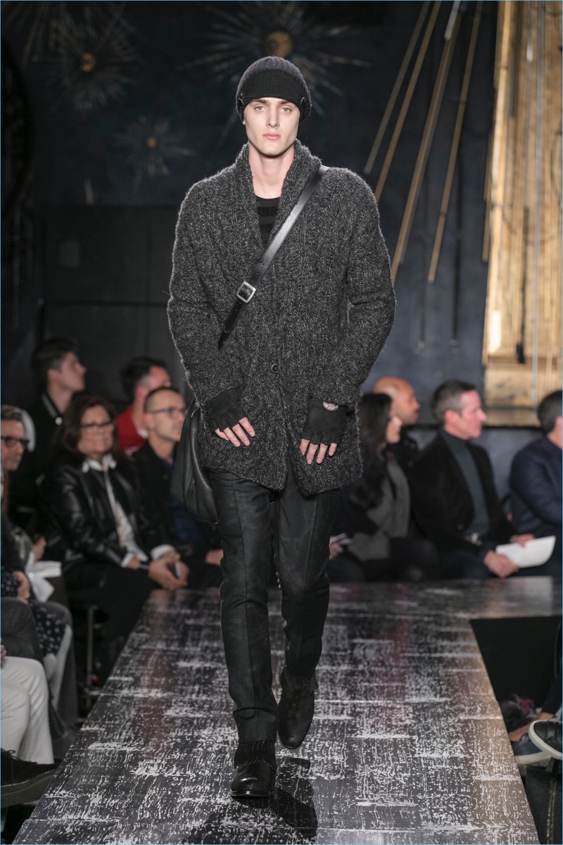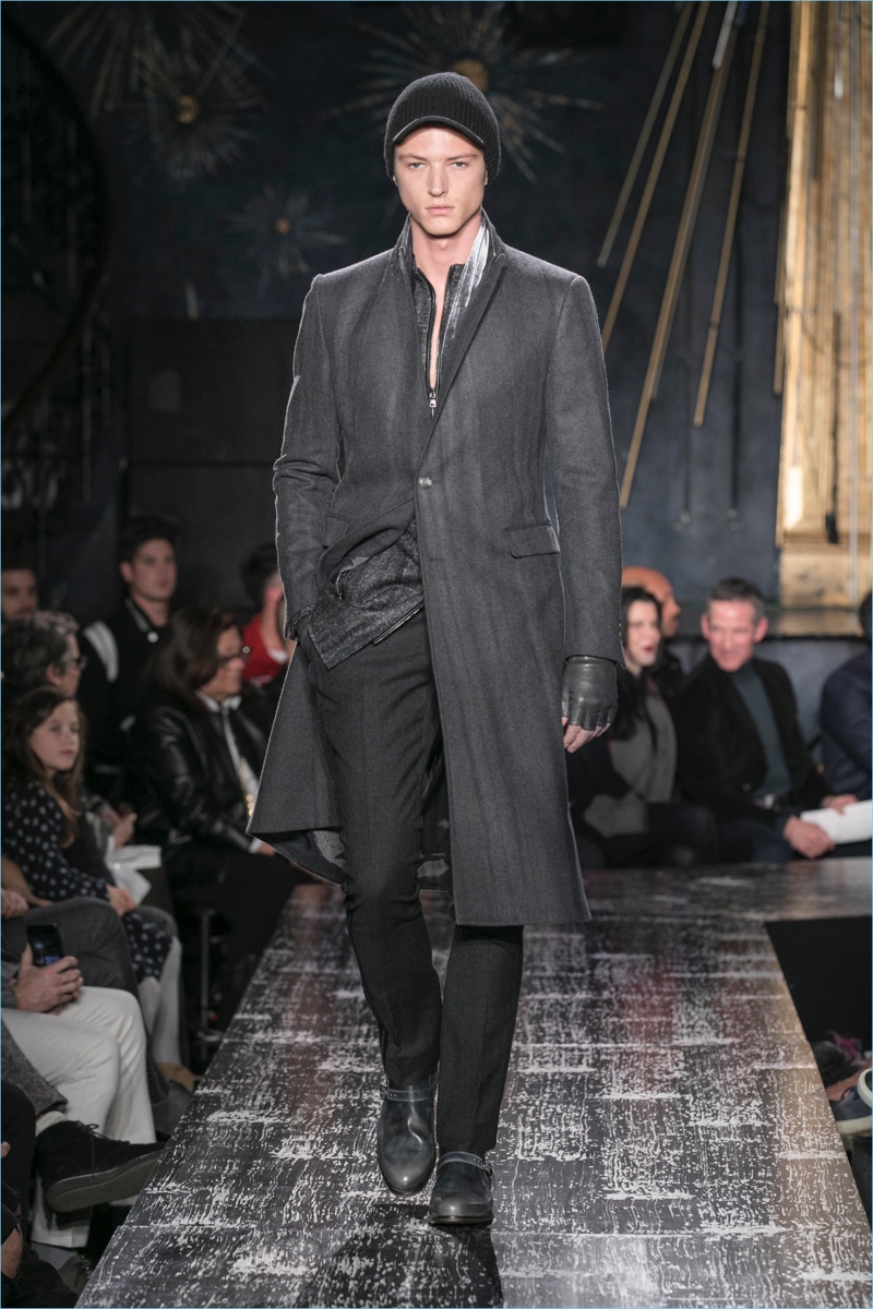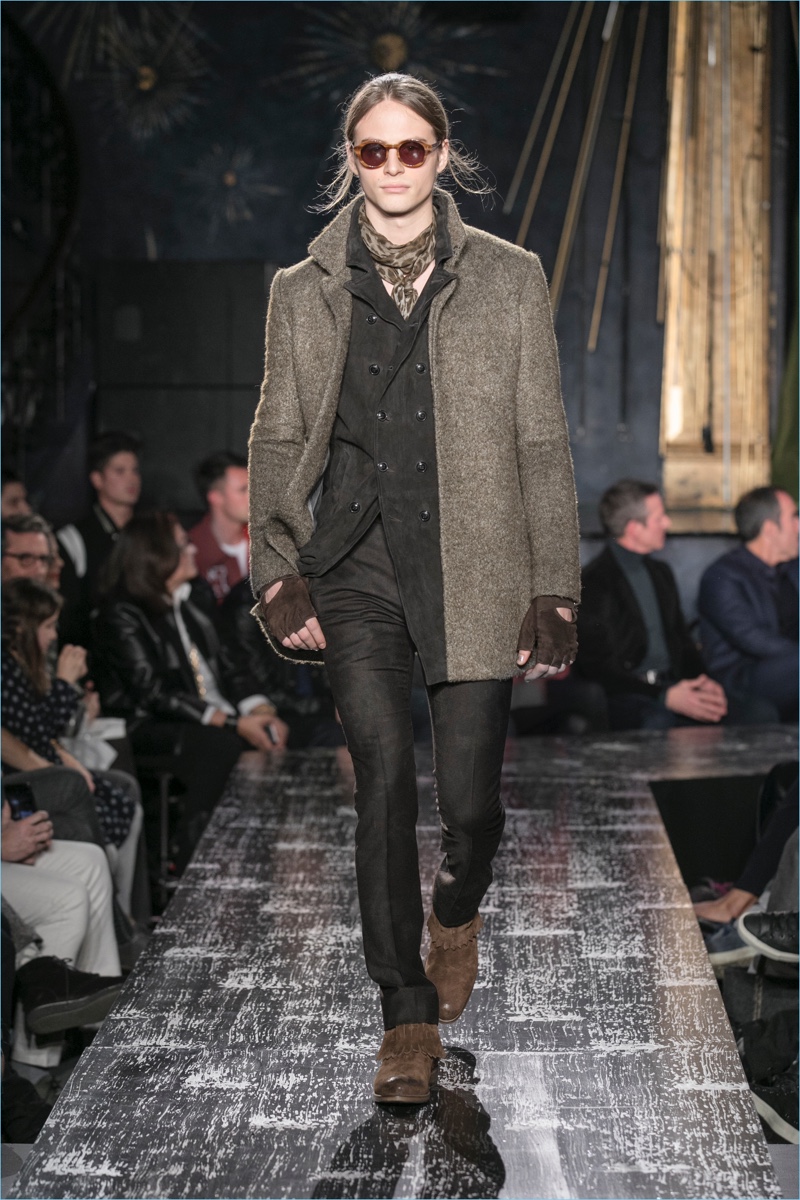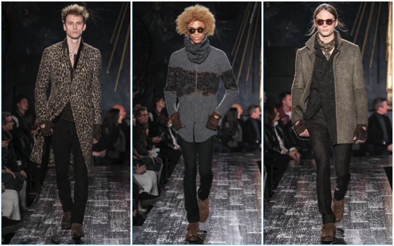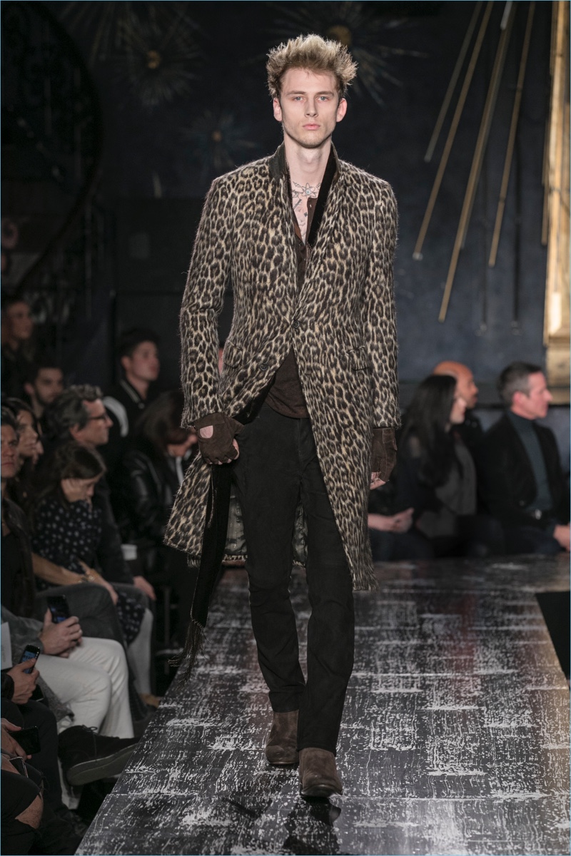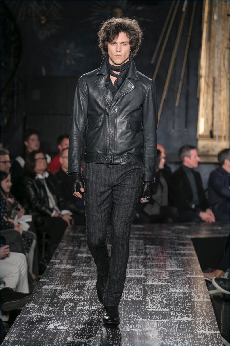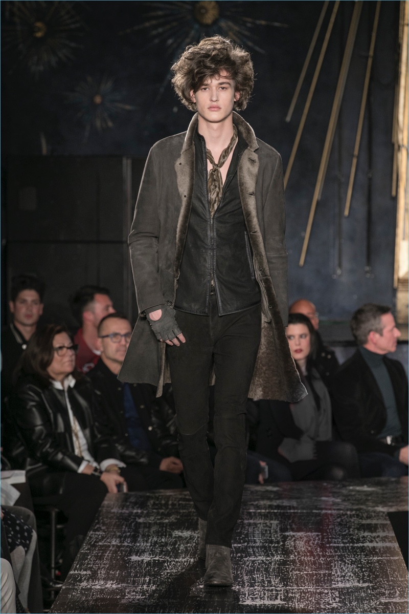John Varvatos presents his fall-winter 2017 collection, Wild at Heart. The range takes on a romantic vision of urban life with the designer’s signature downtown cool. Offering a spin on the rebellious with exquisite tailoring, Varvatos delivers hand-painted treatments, animal finishes, washed velvets, and hand-burnished leathers. Juxtaposed with leopard prints, a somber sea of black and neutrals lends itself to simple but impactful ensembles. Here, slouchy knits, trim overcoats, slim-fit trousers, leather jackets, smart waistcoats, and sharp blazers come together for a stunning fall.