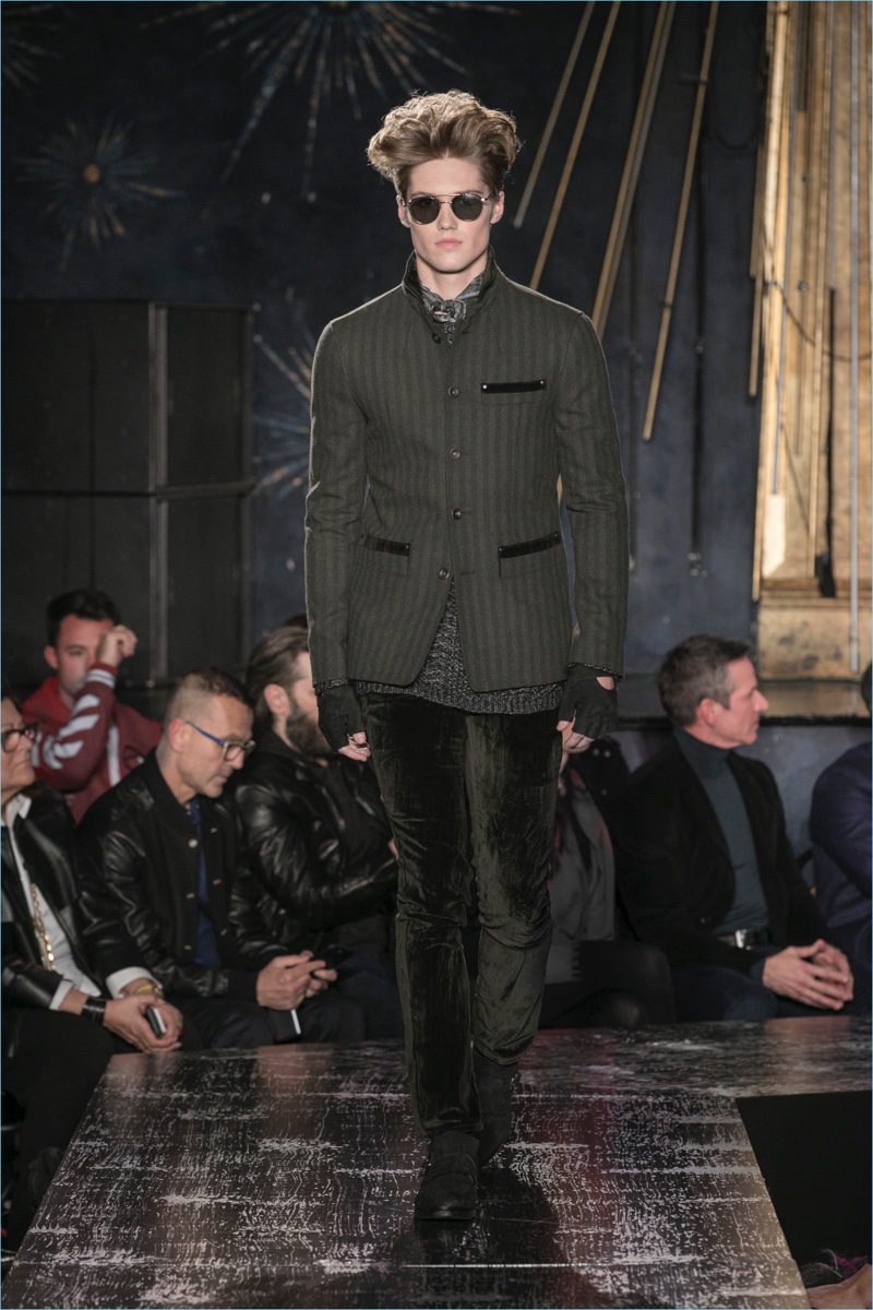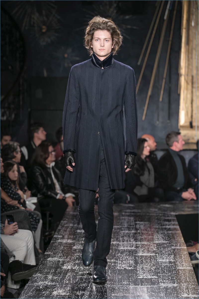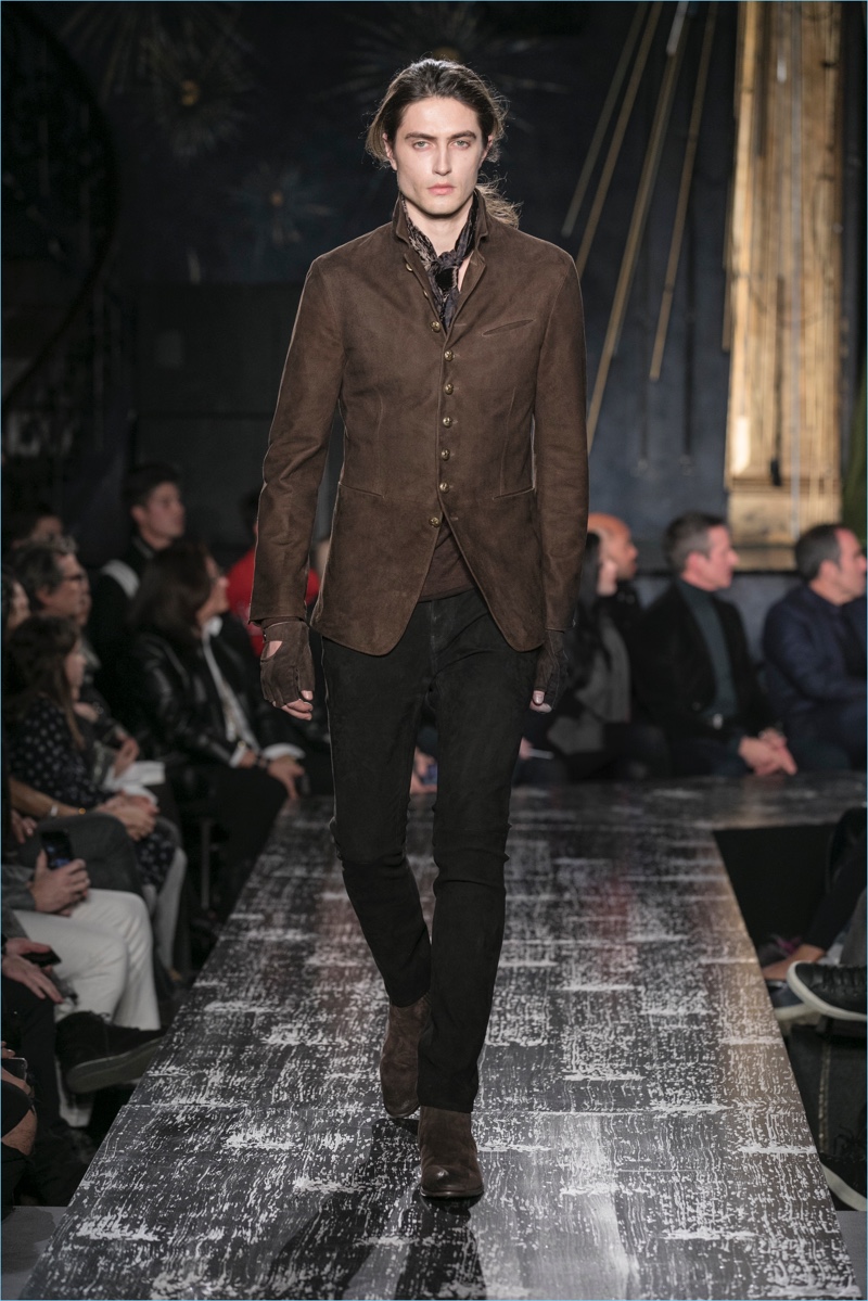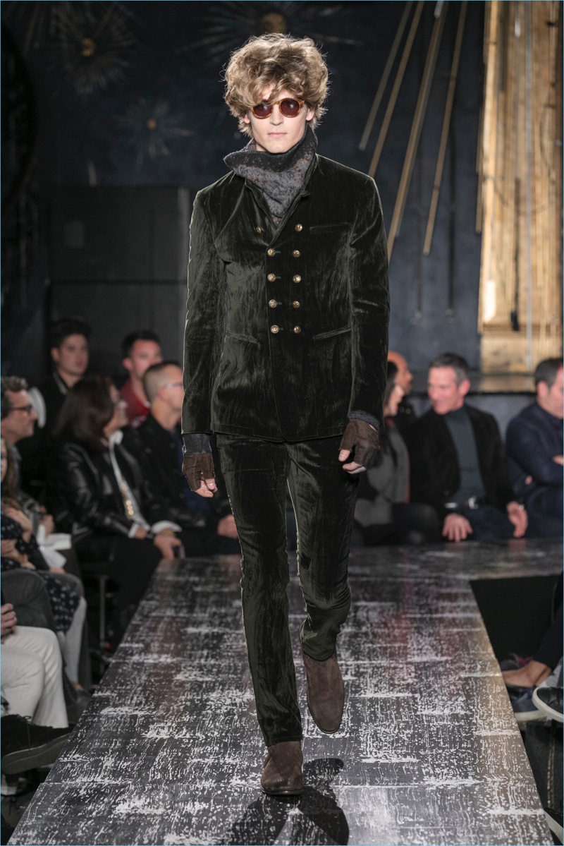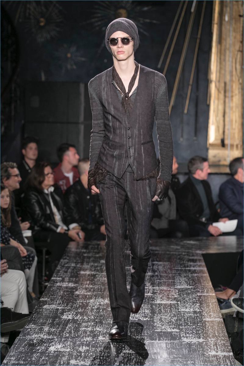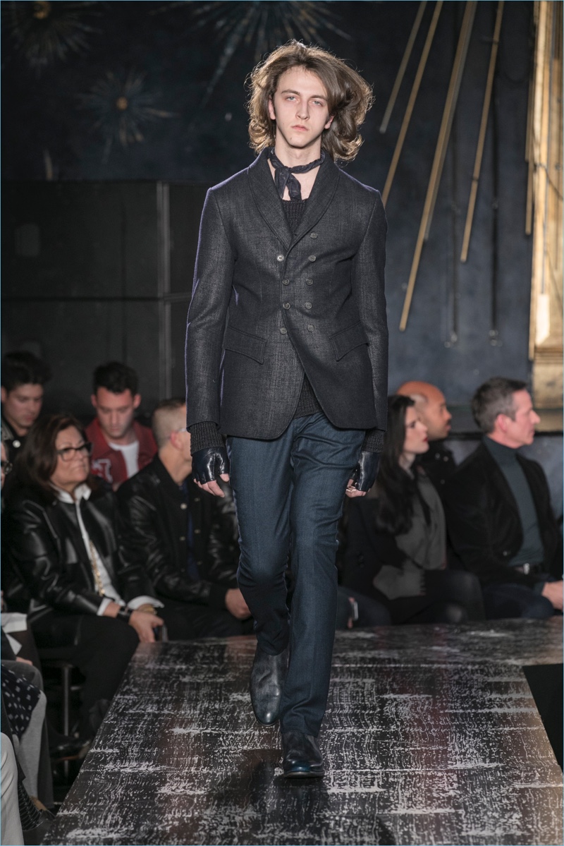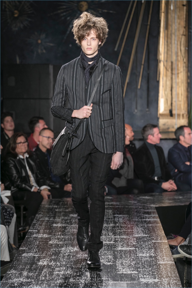 John Varvatos presents his fall-winter 2017 collection, Wild at Heart. The range takes on a romantic vision of urban life with the designer’s signature downtown cool. Offering a spin on the rebellious with exquisite tailoring, Varvatos delivers hand-painted treatments, animal finishes, washed velvets, and hand-burnished leathers. Juxtaposed with leopard prints, a somber sea of black and neutrals lends itself to simple but impactful ensembles. Here, slouchy knits, trim overcoats, slim-fit trousers, leather jackets, smart waistcoats, and sharp blazers come together for a stunning fall.