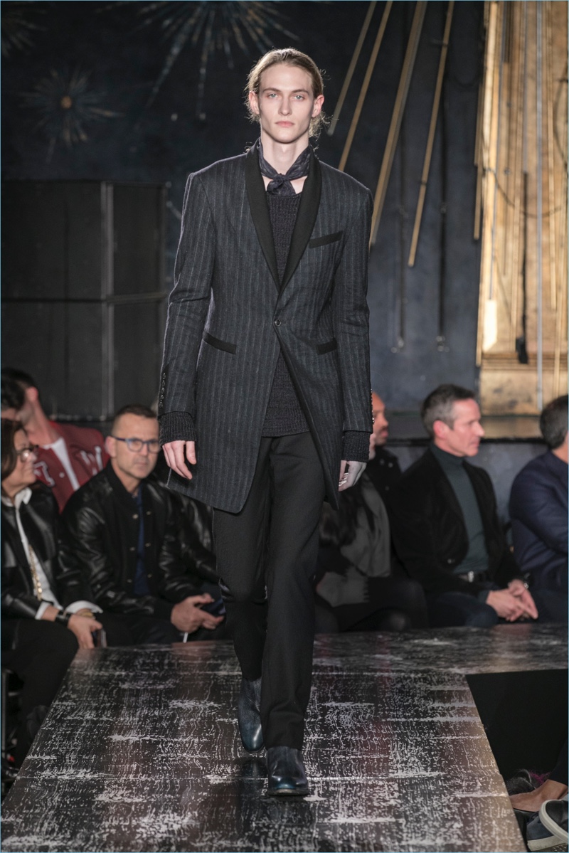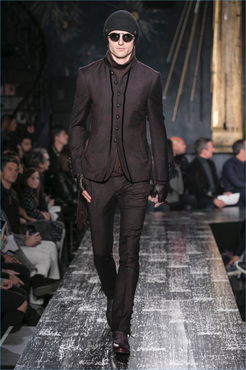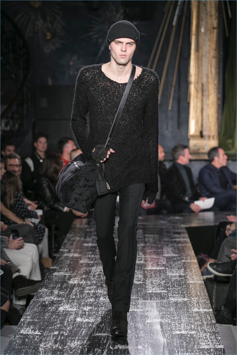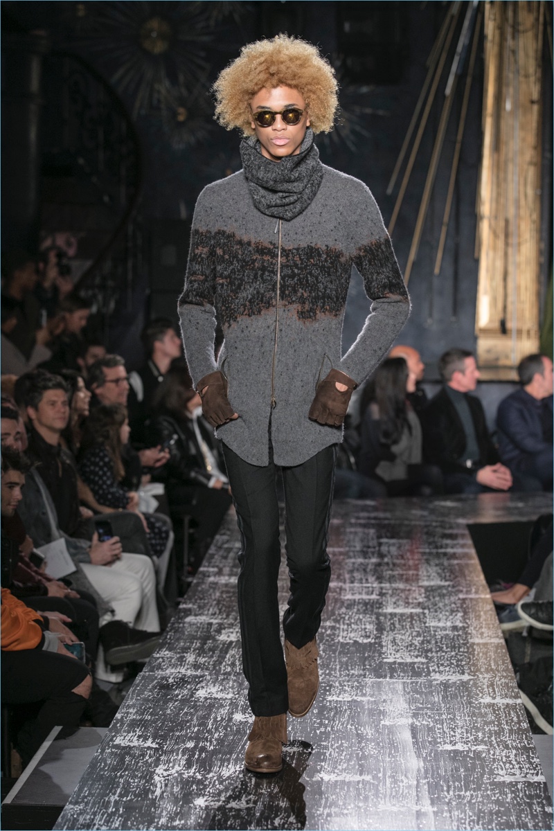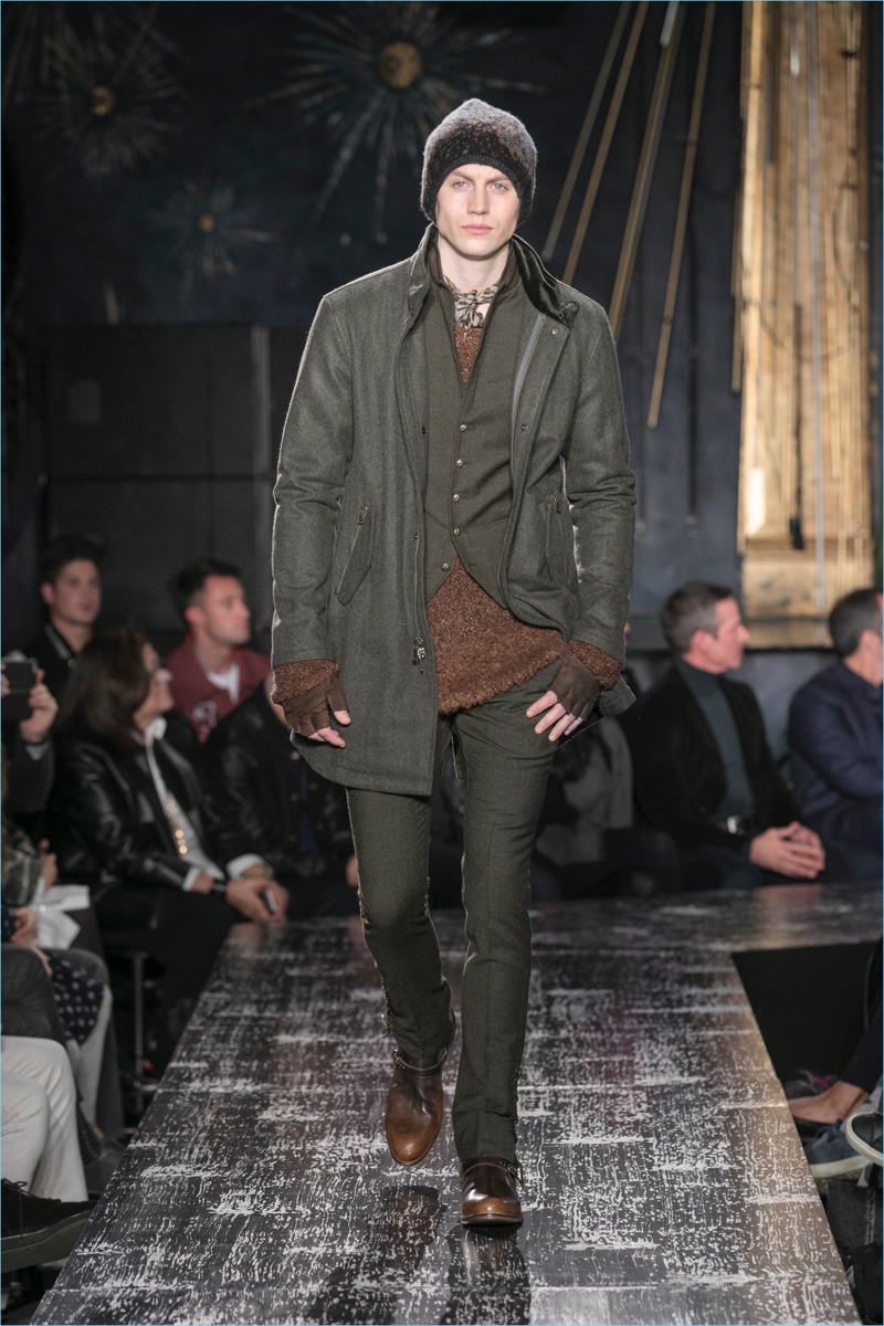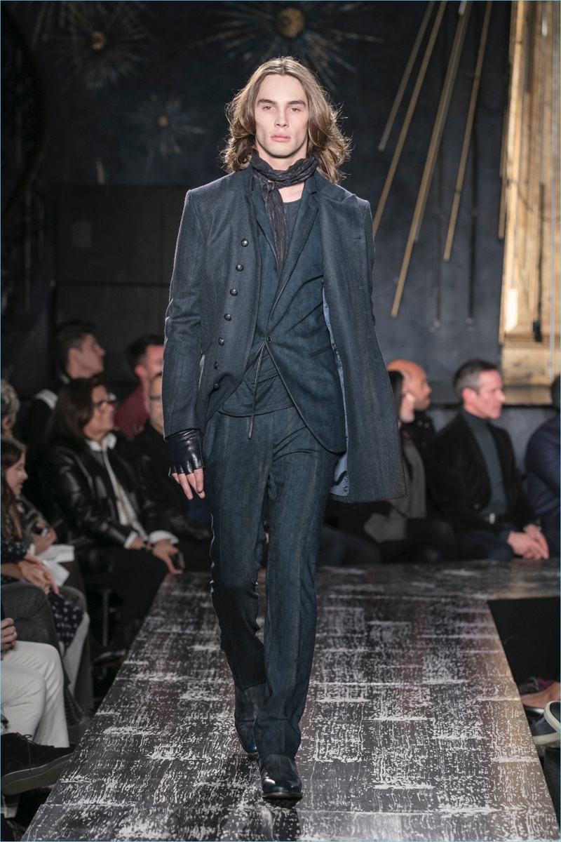 John Varvatos presents his fall-winter 2017 collection, Wild at Heart. The range takes on a romantic vision of urban life with the designer’s signature downtown cool. Offering a spin on the rebellious with exquisite tailoring, Varvatos delivers hand-painted treatments, animal finishes, washed velvets, and hand-burnished leathers. Juxtaposed with leopard prints, a somber sea of black and neutrals lends itself to simple but impactful ensembles. Here, slouchy knits, trim overcoats, slim-fit trousers, leather jackets, smart waistcoats, and sharp blazers come together for a stunning fall.