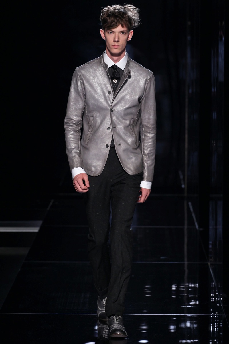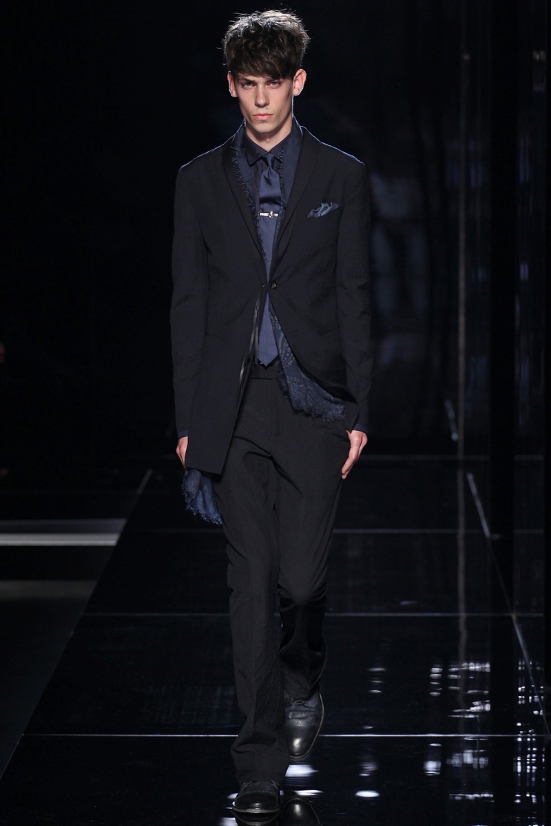 Rock On–With the American designer looking up to bands like The Rolling Stones with singers such as Mick Jagger, it’s easy to see John Varvatos’ inspiration for the spring/summer 2014 season. Painting a stark pictures with navy, black and gray, the suit juxtaposed with sportswear is the starting point for the collection. Here, jackets are lengthened, ties clipped into place, prints applied to cardigans and scarves used to accessorize for Varvatos’ free spirit. Incorporating leather and suede for a rich but cool option, outerwear is fitted while trousers are cut slim and pleated. After a splash of red and white for a color uplift, the sergeant jacket is enlisted for a nostalgic rock moment and strong season finish.