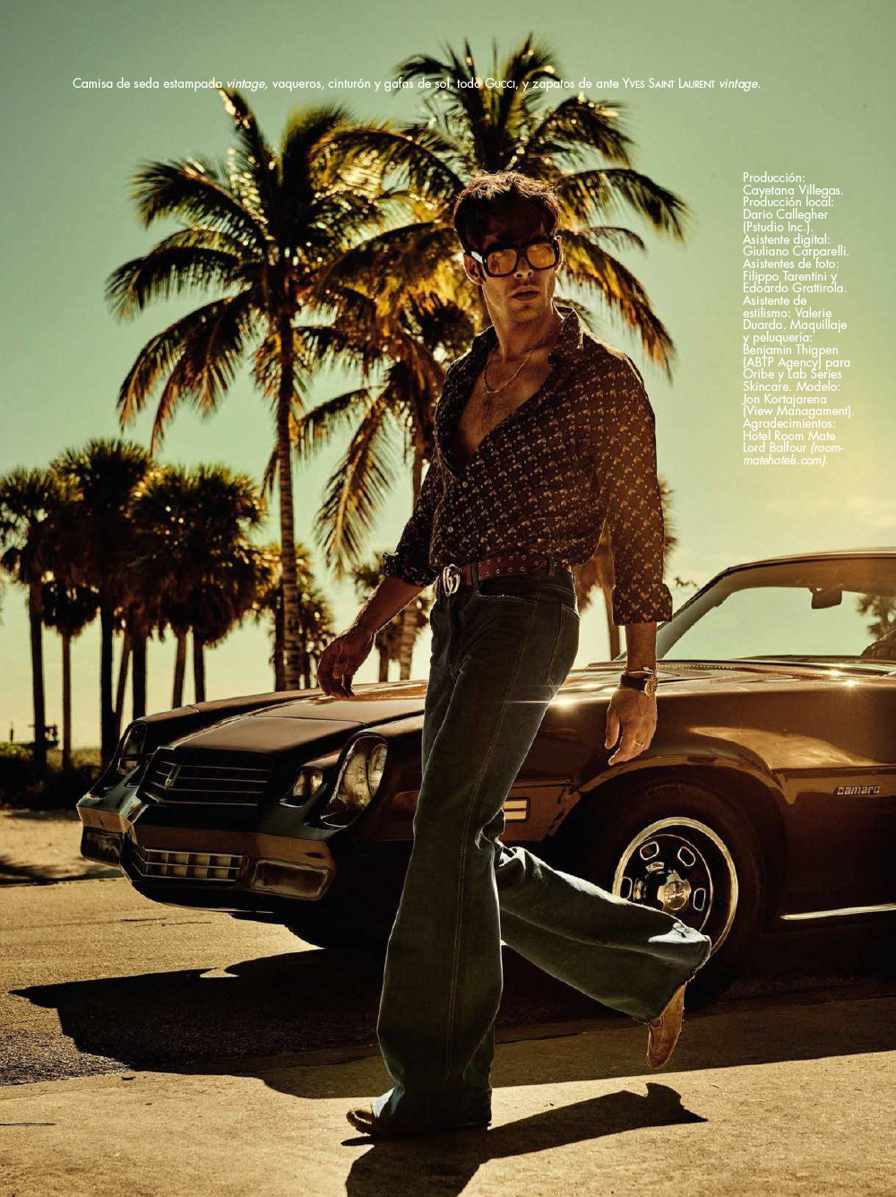 Photographer Giampaolo Sgura and stylist Miguel Arnau come together once again, capturing the spirit of a retro infused summer for the pages of GQ España. Featured in the magazine’s May 2016 issue, Jon Kortajarena is front and center in warm images that exude the essence of the season’s 1970s style trend. Outfitted by Arnau, the leading Spanish model soaks in the sun, donning a wardrobe of brands such as Gucci, Dsquared2 and Prada. Inspiring a certain nostalgia, Jon is pictured in standout pieces like Canali’s safarji jacket and Salvatore Ferragamo’s brightly hued short-sleeve shirt.