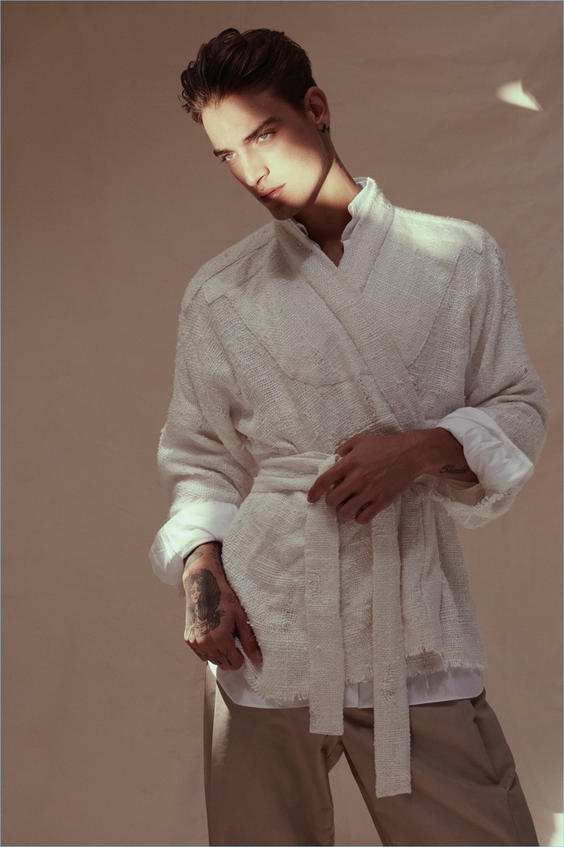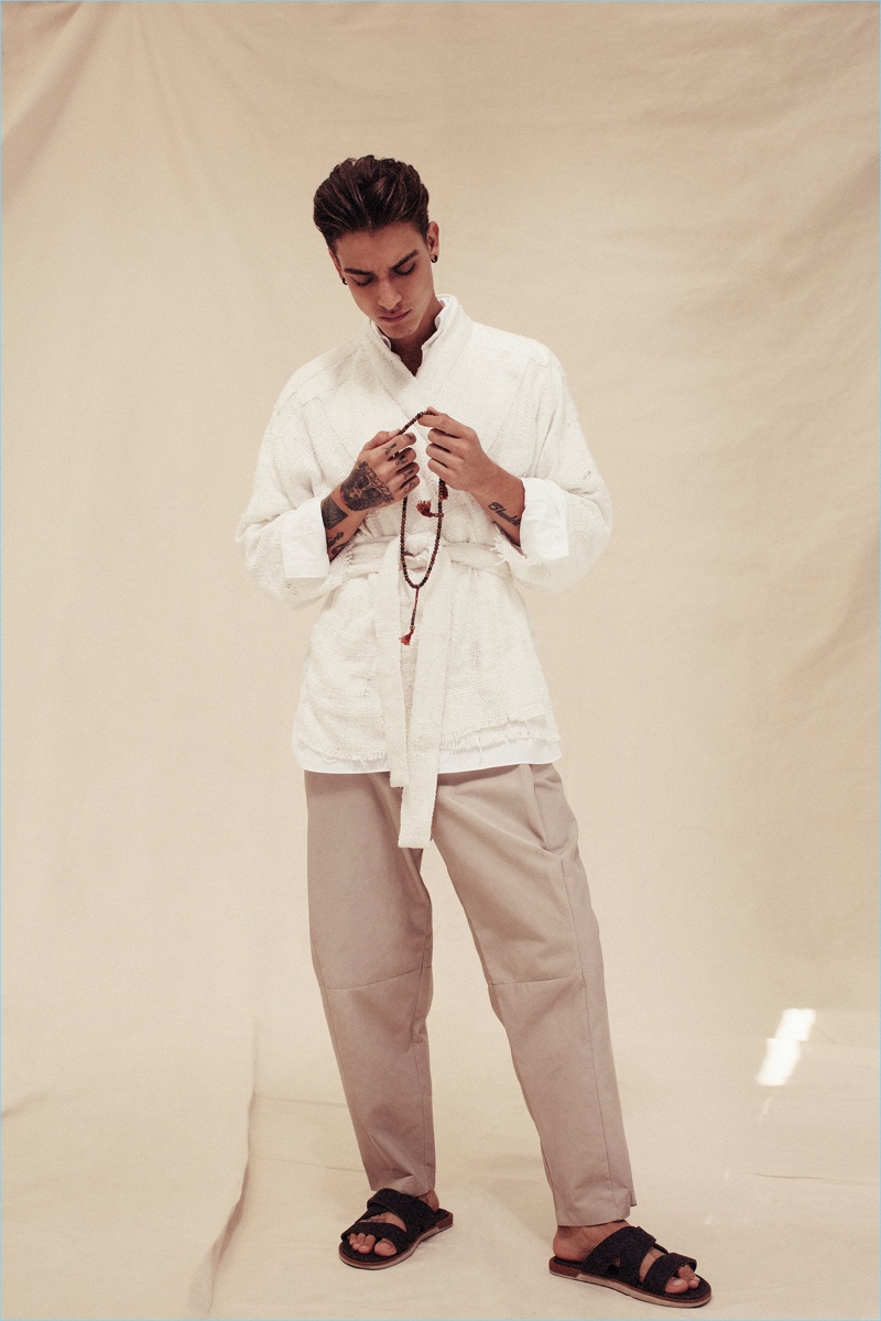 PinBrazilian model Jonathan Bellini wears an Osklen kimono style jacket with an Ermenegildo Zegna shirt, Emporio Armani pants, and Cartago sandals.