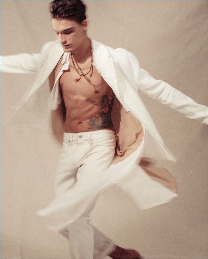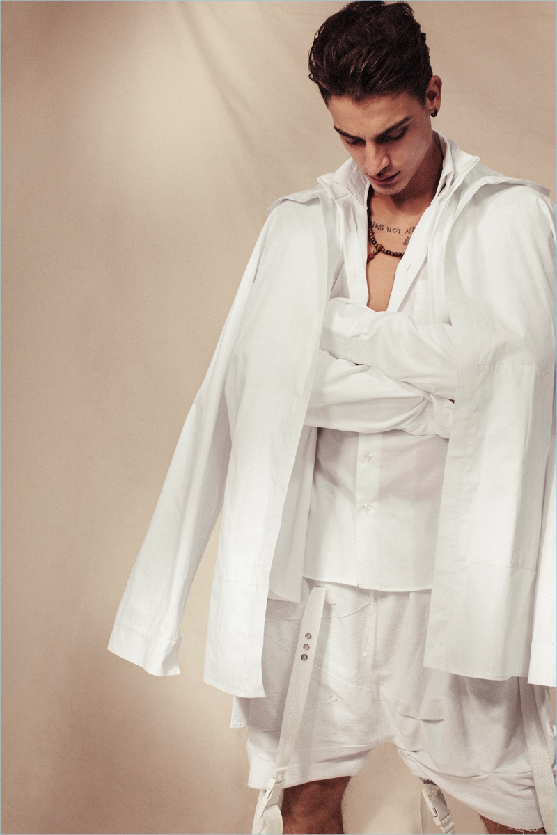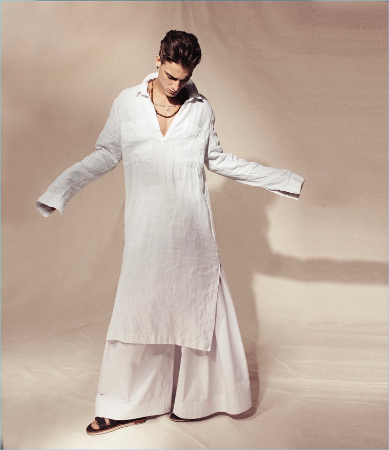 GQ Brasil takes inspiration from Lawrence of Arabia for an editorial in its December 2016 issue. The magazine collaborates with photographer Karine Basílio and fashion editor Sylvain Justus for the spring outing. Here, model Jonathan Bellini steps into the studio showcasing a beautiful wardrobe. Stylist Giovanni Grasson outfits the Brazilian model in a mix of local and international fashion brands. Embracing long silhouettes and lightweight fabrics, Jonathan inspires in neutral hues. / Grooming by Jayme Vasconcellos.