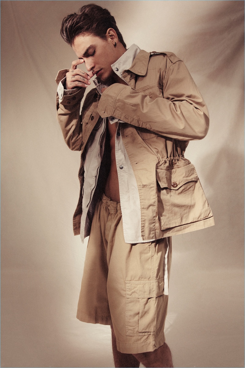 PinEmbracing oversized proportions, Jonathan Bellini dons an Osklen tunic, Lab pants, and Cartago sandals.PinModel Jonathan Bellini rocks a Polo Ralph Lauren field jacket with a Siberian jacket, and Hering shorts.