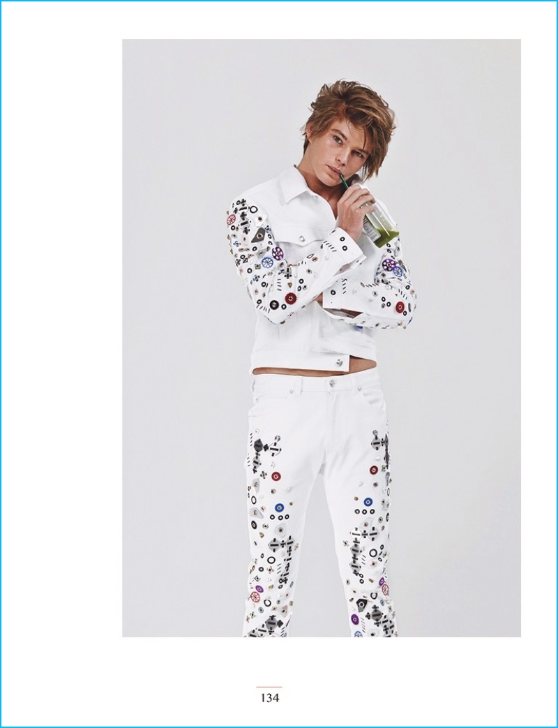 Jordan Barrett wears a flashy white look from Versace for Narcisse magazine.