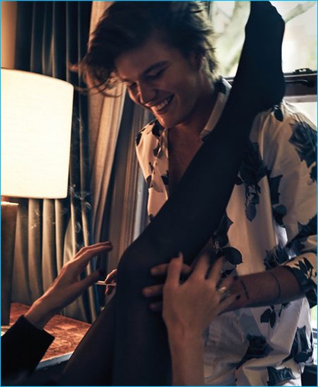 Jordan Barrett also covers the fall-winter 2016 edition of CR Men’s Book. Flirting with the idea of a younger man and older woman, Jordan is photographed by Sebastian Faena for the fashion spread. Styled by Carine Roitfeld, Jordan poses for playful images, embracing current designer separates.