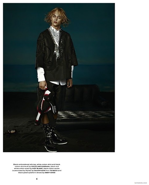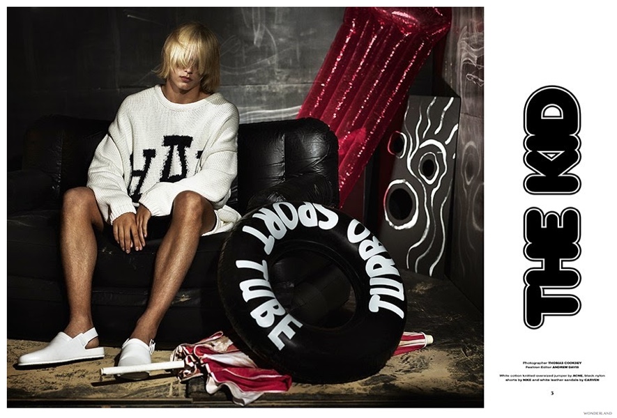 After connecting with Hercules magazine for a look at Alexander Wang’s collection for H&M, blond model Jordan Sorbom links up with photographer Thomas Cooksey for the November/December 2014 cover of British magazine Wonderland. Sporting a Diesel Black Gold leather jacket for the cover, Jordan is styled by Andrew Davis. Offering a playful, sporty attitude, Jordan dons eclectic styles for the accompanying fashion spread.