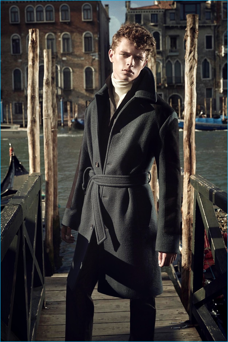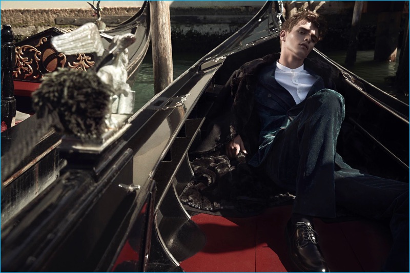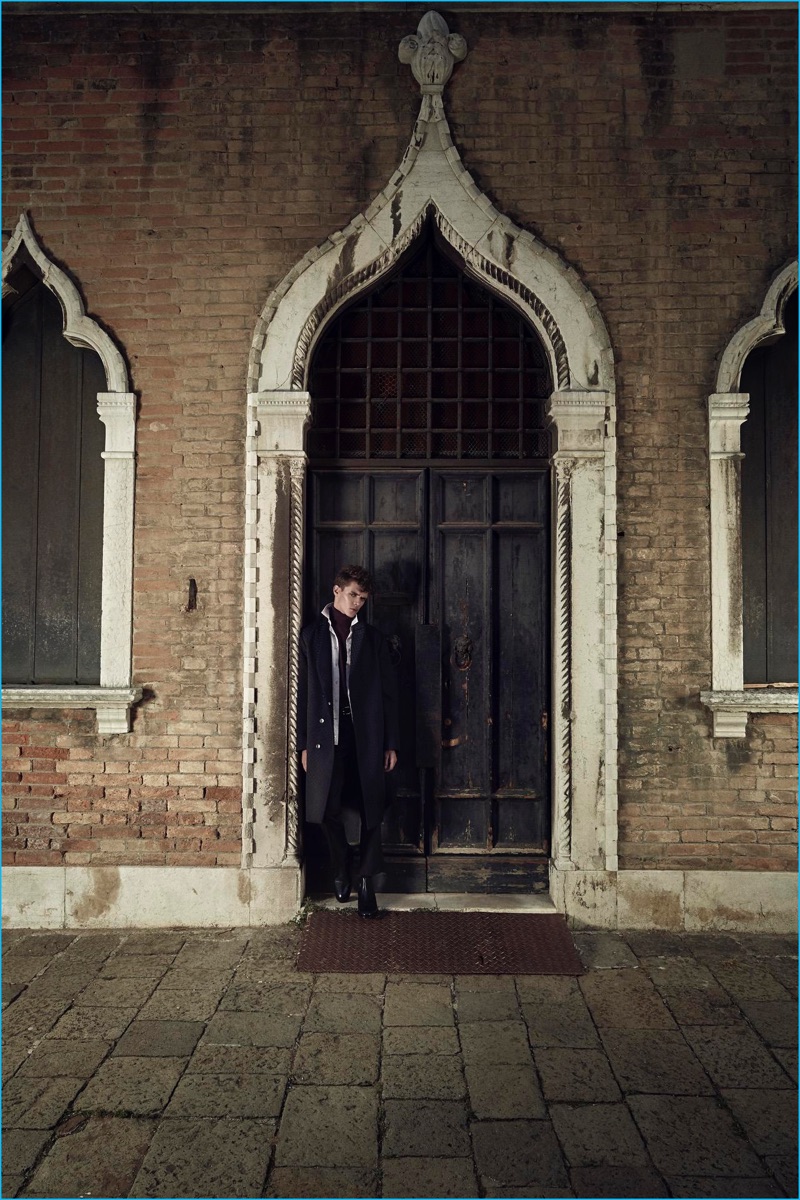 Fashion photographer Giovanni Squatriti delivers a stunning fashion editorial for the most recent issue of Gentleman Italia. Model Jordy Baan travels to Venice for the fall story. Taking in the storied sights, Jordy dons dashing ensembles from top menswear brands that include Salvatore Ferragamo, Giorgio Armani and Versace. Stylist Gioia Carozzi brings a dramatic flair to the wardrobe with embellished coats and oversized capes.