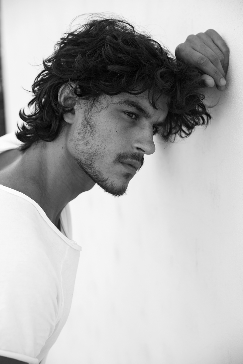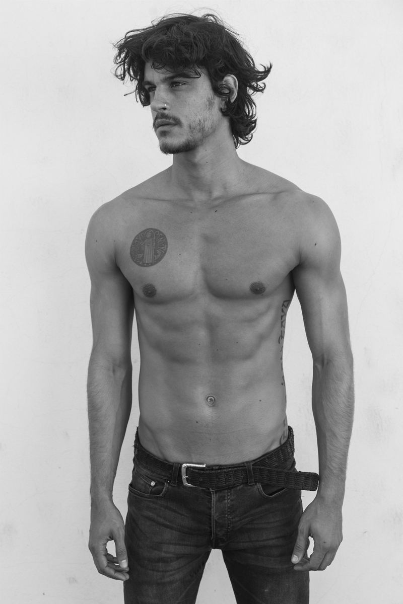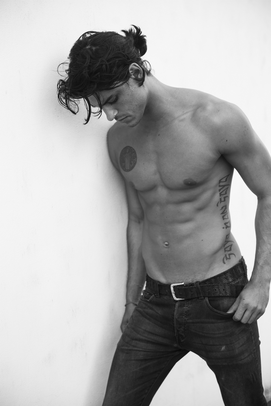 Photographed by Fernando Machado, Jorge Alano (Way Model Management) is front and center for a round of black & white images. Posing for casual images, Jorge wears an essential go-see look, consisting of a white tee and slim-fit denim jeans. Going shirtless, Jorge strips down to his Emporio Armani underwear.