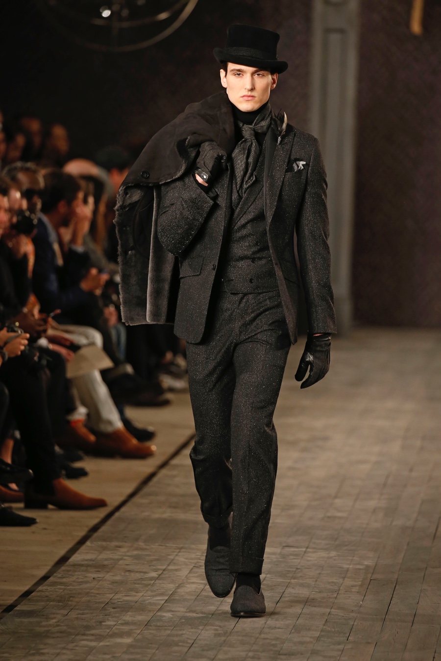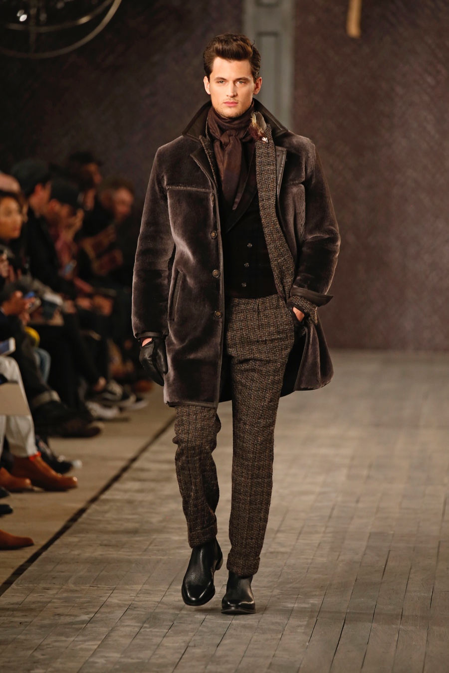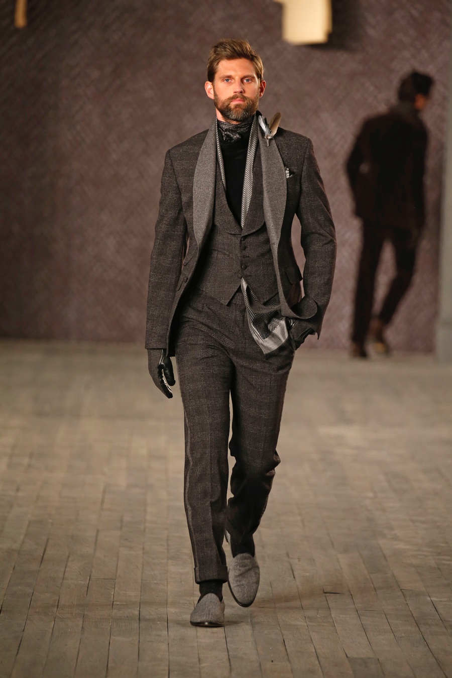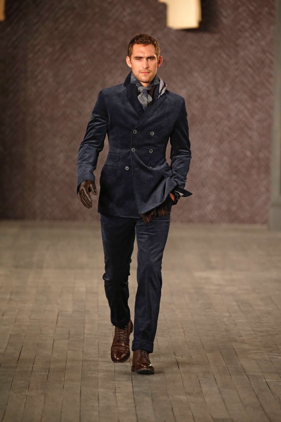 Showcasing sharp tailoring made in the United States at Joseph Abboud Manufacturing Corp. in New Bedford, Massachusetts, the fall presentation also featured collaborations with local artisans. Among impressive numbers from Joseph Abboud, Rawlings produced bags, Albertus Swanepoel contributed hats, Barbara Blank served up ties, Kobold watches, Aston Leathers shearling outerwear and Allen Edmonds, footwear.
