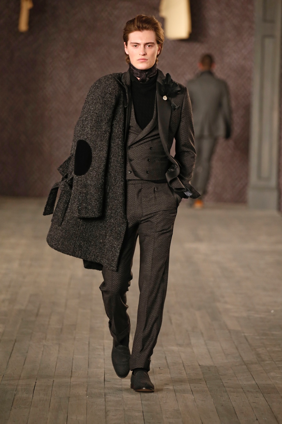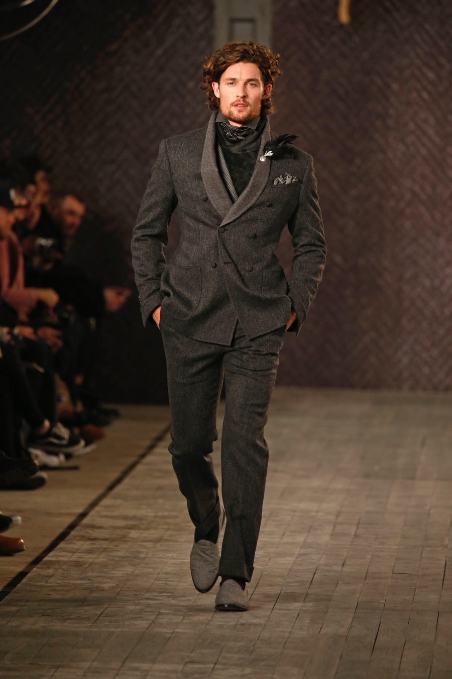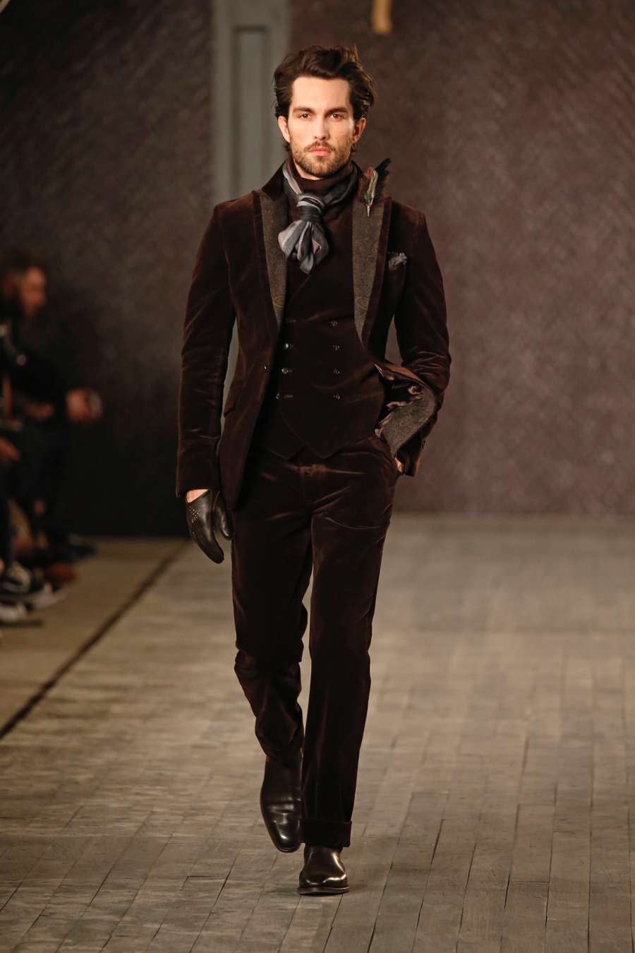 Among the dandy ensembles, the label unveiled bespoke details, intricate patterns and luxurious fabrics. Embracing an autumnal color palette, washed velvets and Biella cashmeres came together with distressed wools and Harris Tweeds for quite the collection.