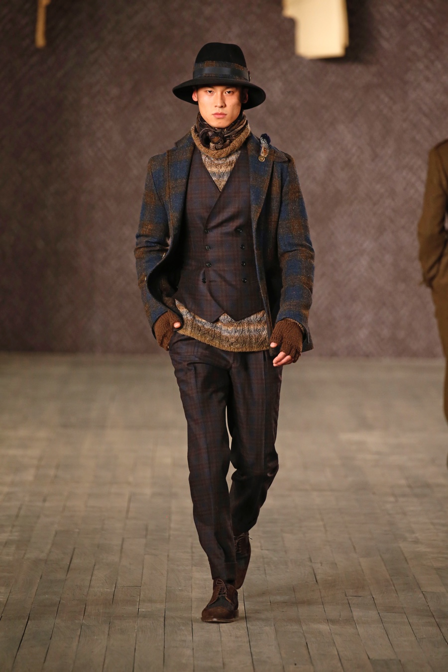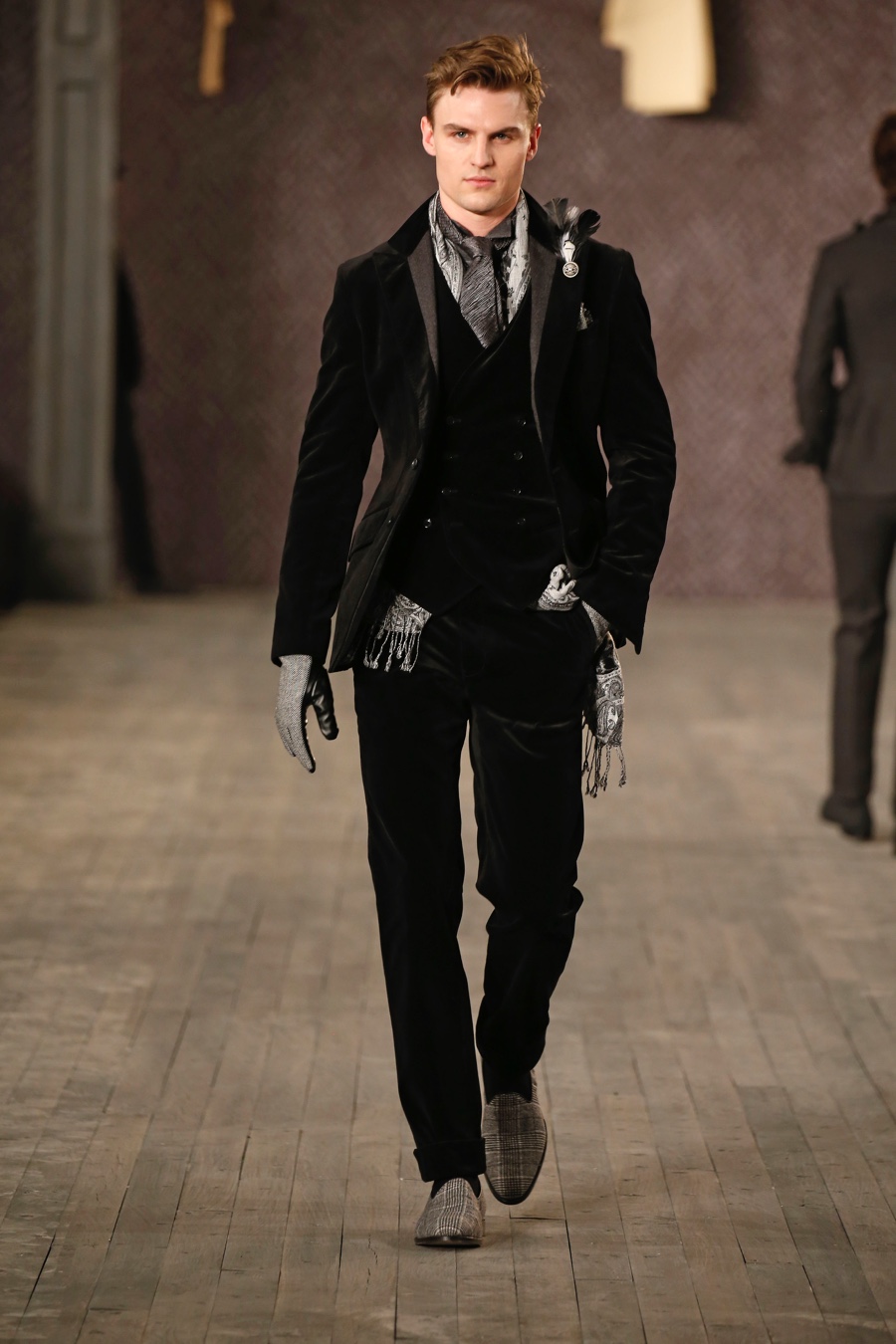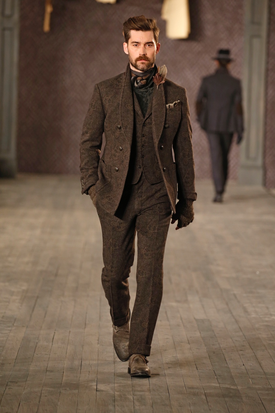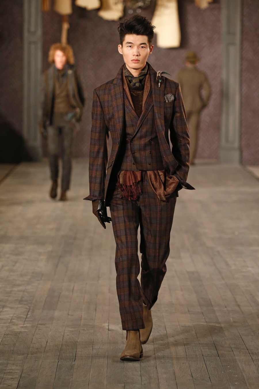 Among the dandy ensembles, the label unveiled bespoke details, intricate patterns and luxurious fabrics. Embracing an autumnal color palette, washed velvets and Biella cashmeres came together with distressed wools and Harris Tweeds for quite the collection.