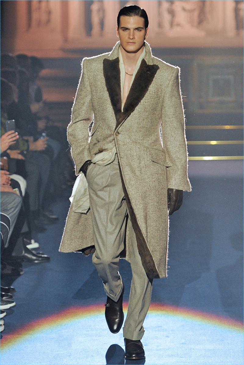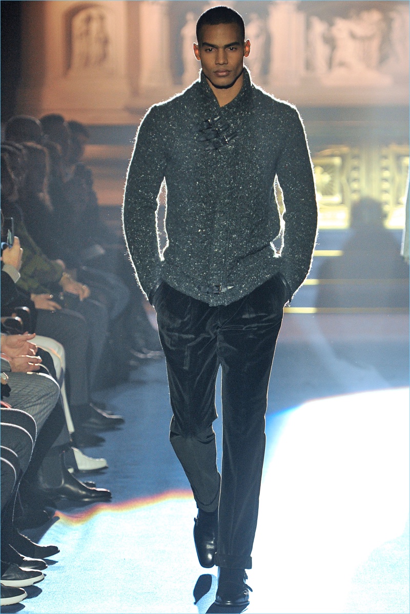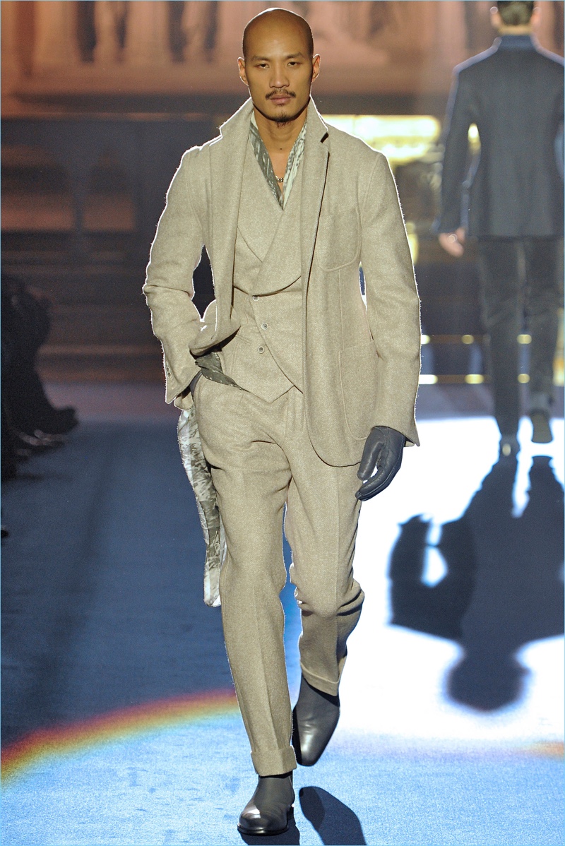 Adding a soft touch to tailoring, pinched silhouettes coincide with patterned suits, belted velvet overcoats, fur trimmed jackets, and asymmetrically fastened coats. Abboud’s latest creations also touch on the dandy, contrasting brocades with herringbone and tweed.