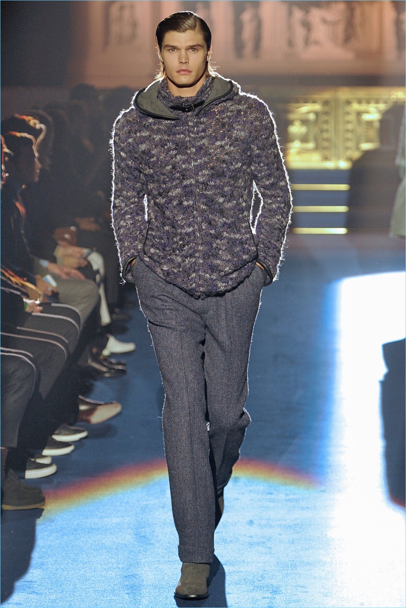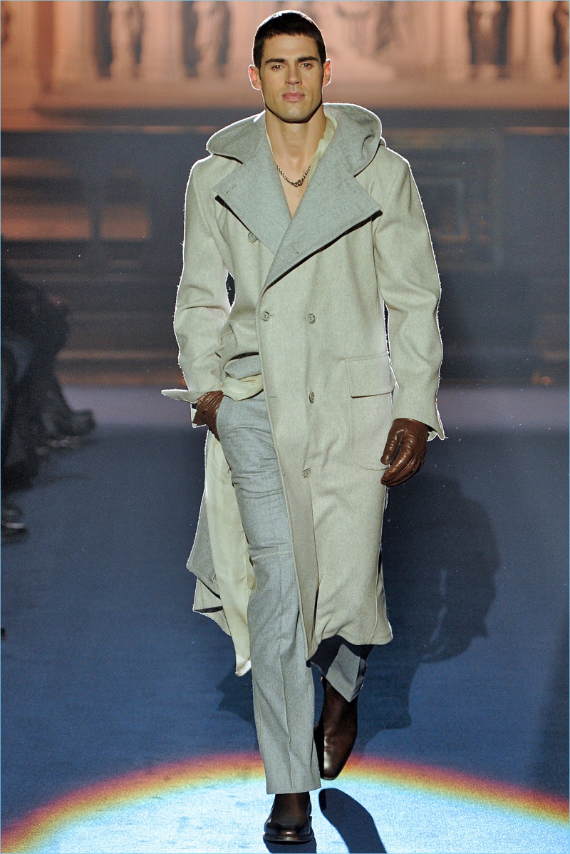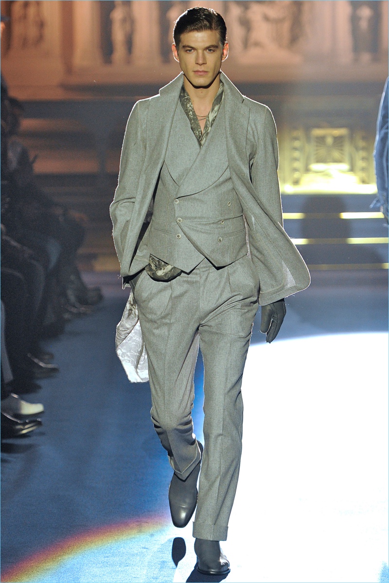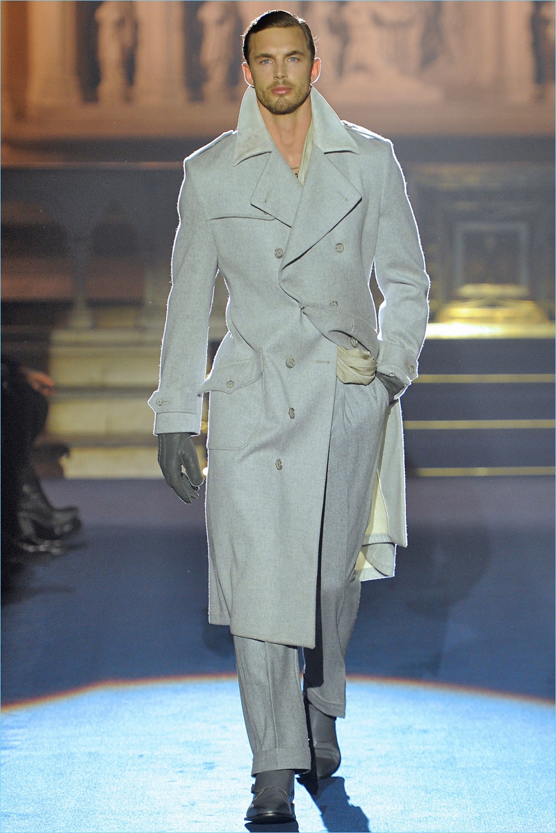 Adding a soft touch to tailoring, pinched silhouettes coincide with patterned suits, belted velvet overcoats, fur trimmed jackets, and asymmetrically fastened coats. Abboud’s latest creations also touch on the dandy, contrasting brocades with herringbone and tweed.