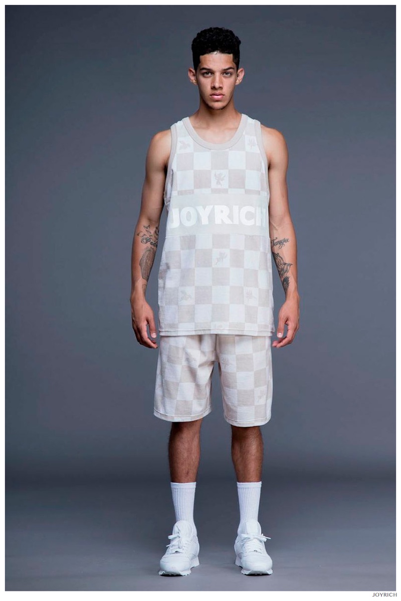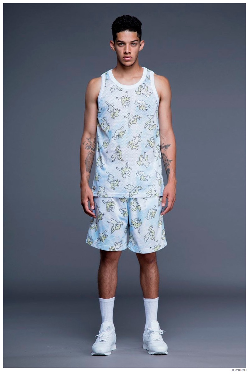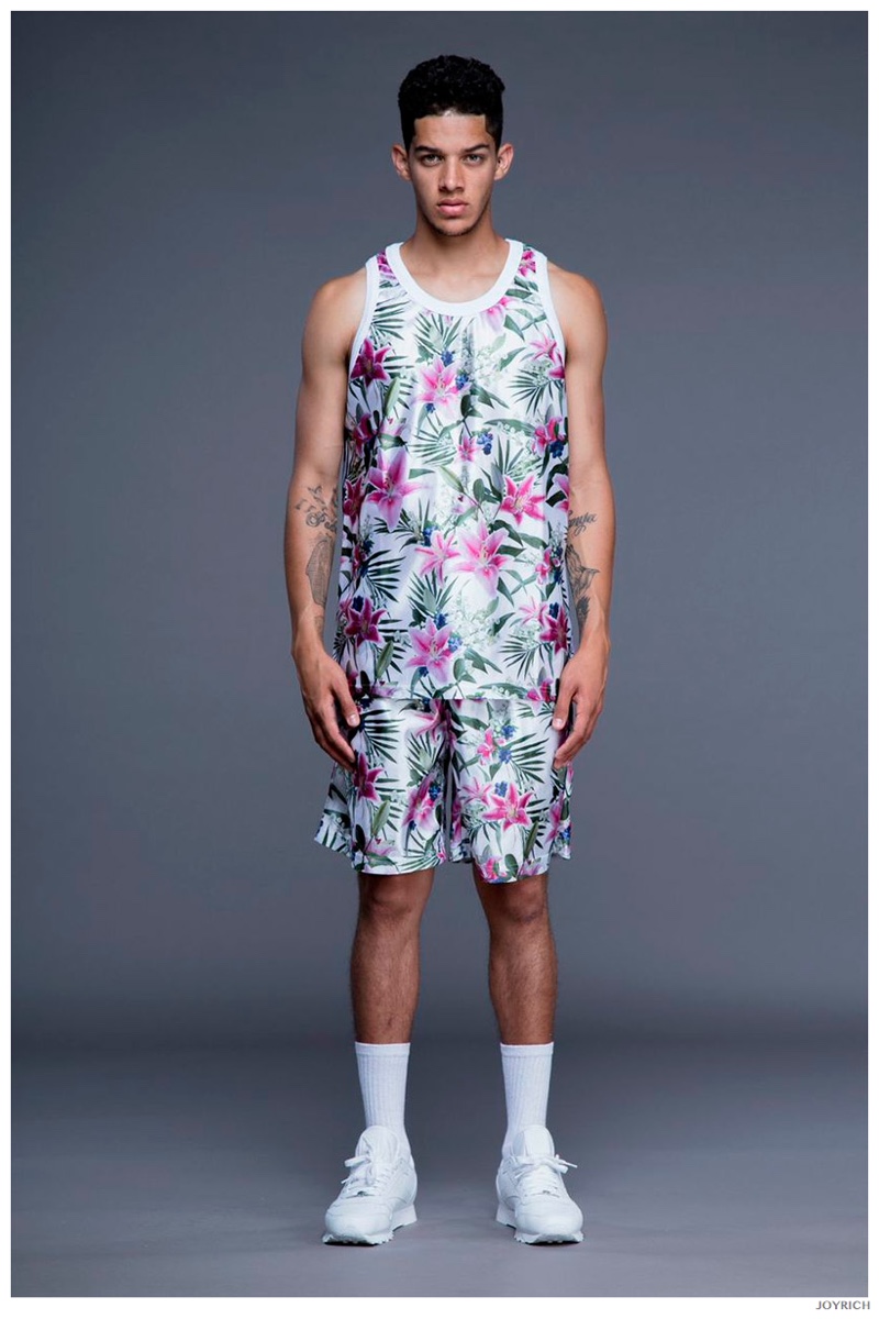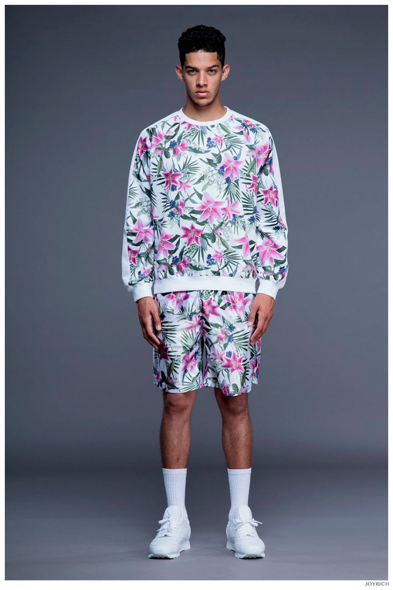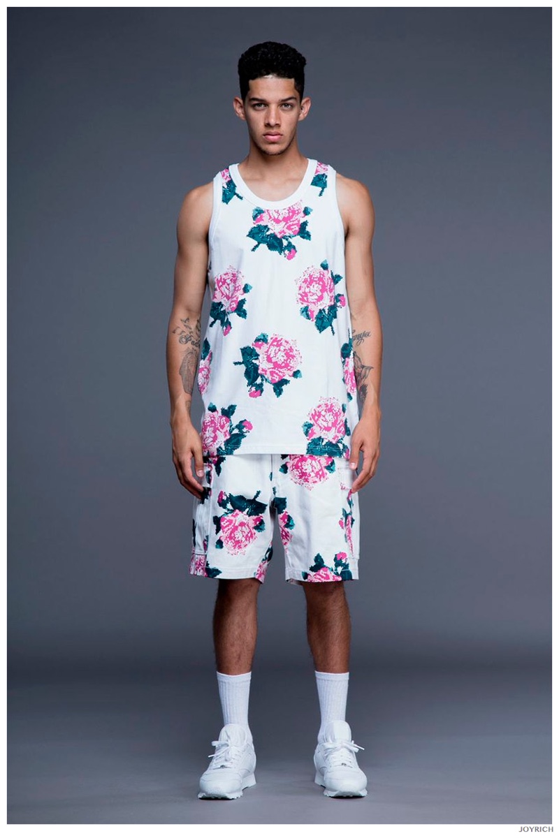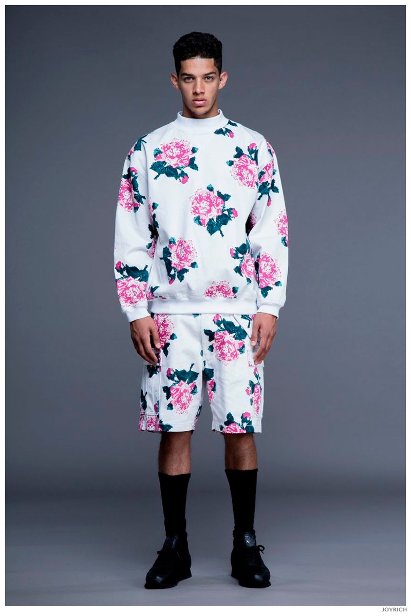 Model DJ James hits the photo studio for the new spring-summer 2015 lookbook of Los Angeles-based fashion label Joyrich. Combining the casual attitude of streetwear with a bold use of graphic prints, Joyrich delivers relaxed silhouettes for spring. From floral print dressed tanks and sweatshirts to gingham pullovers and cherub coordinated looks, Joyrich serves up a cheeky season with its signature spin on fun fashions.
