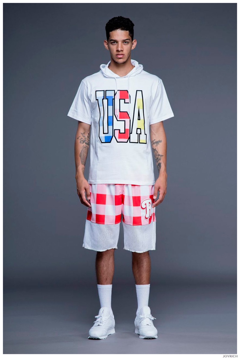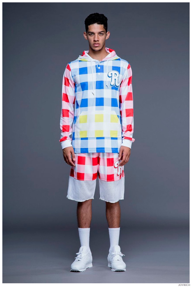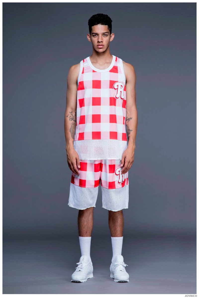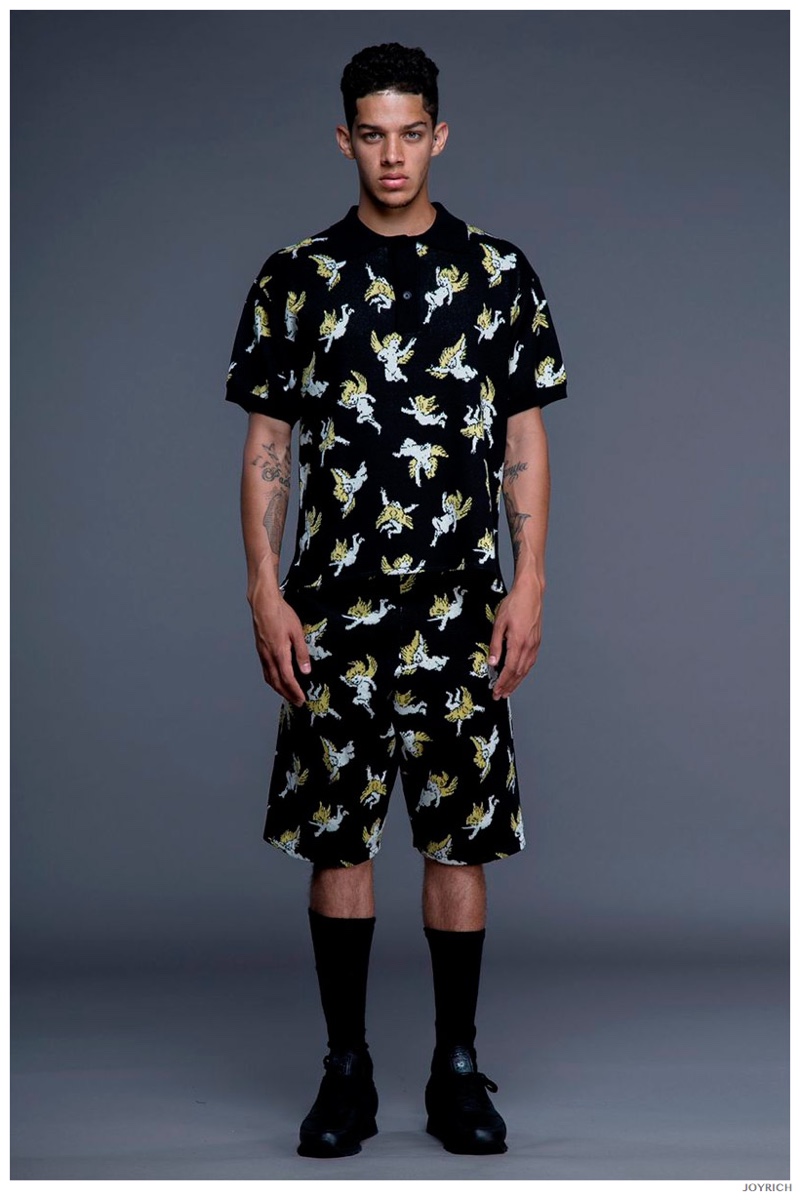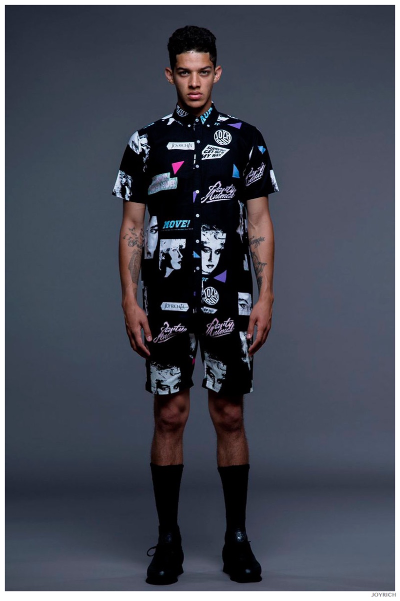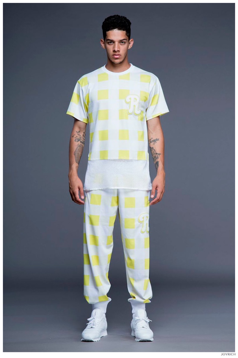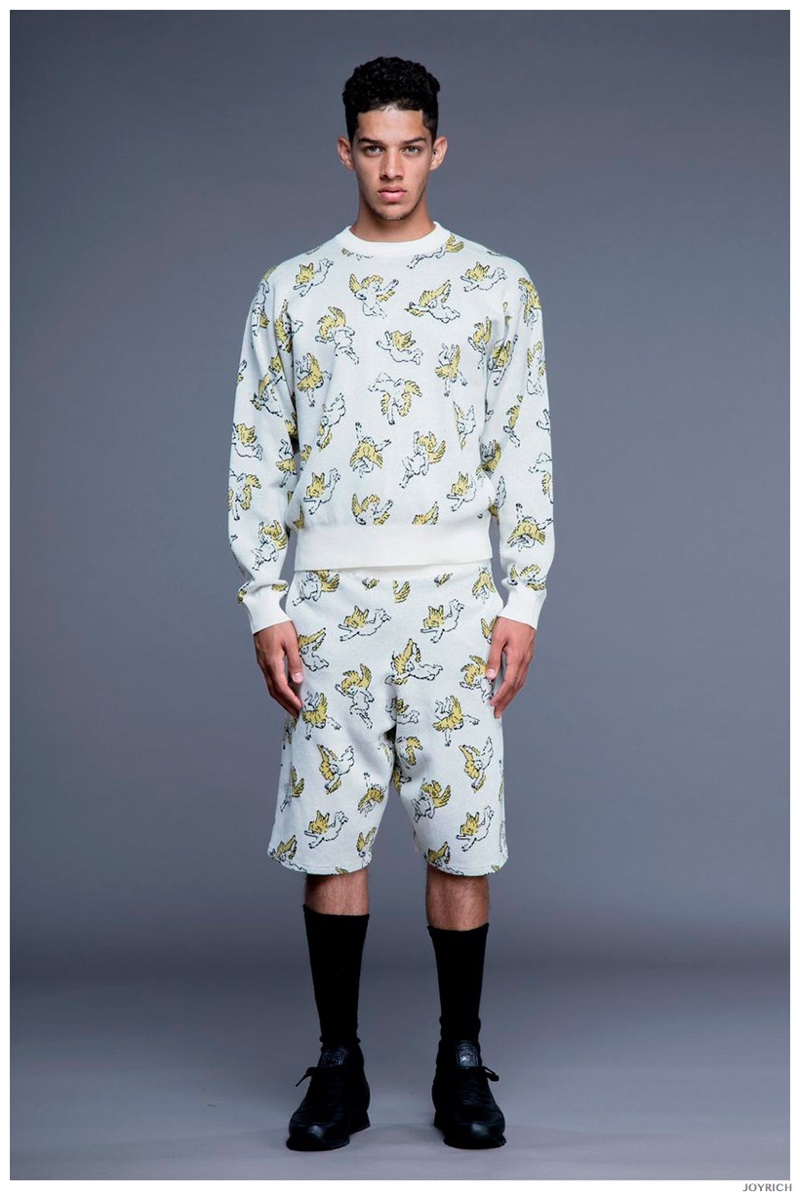Model DJ James hits the photo studio for the new spring-summer 2015 lookbook of Los Angeles-based fashion label Joyrich. Combining the casual attitude of streetwear with a bold use of graphic prints, Joyrich delivers relaxed silhouettes for spring. From floral print dressed tanks and sweatshirts to gingham pullovers and cherub coordinated looks, Joyrich serves up a cheeky season with its signature spin on fun fashions.