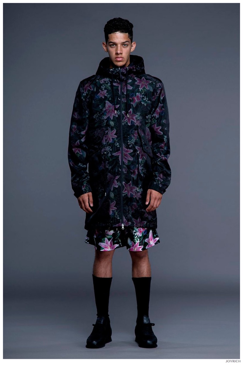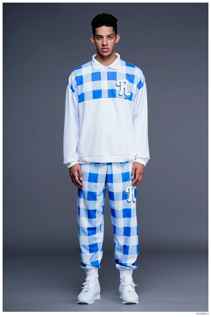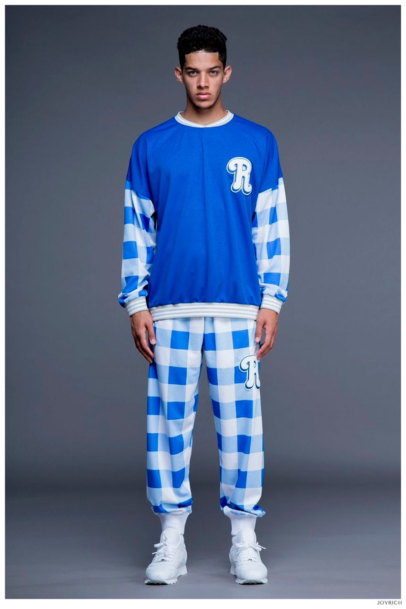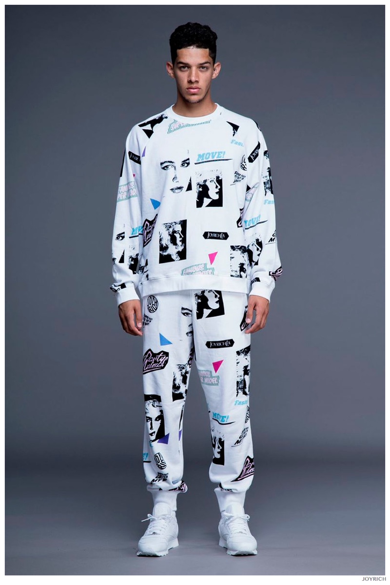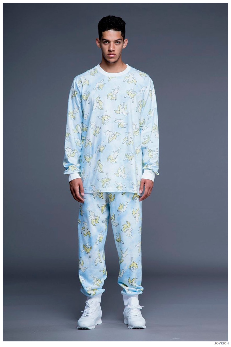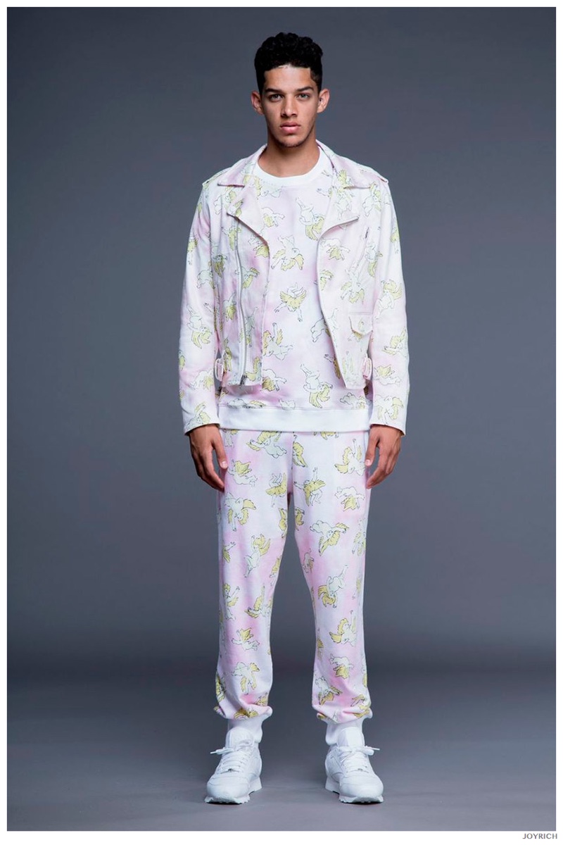 Model DJ James hits the photo studio for the new spring-summer 2015 lookbook of Los Angeles-based fashion label Joyrich. Combining the casual attitude of streetwear with a bold use of graphic prints, Joyrich delivers relaxed silhouettes for spring. From floral print dressed tanks and sweatshirts to gingham pullovers and cherub coordinated looks, Joyrich serves up a cheeky season with its signature spin on fun fashions.