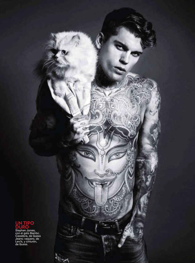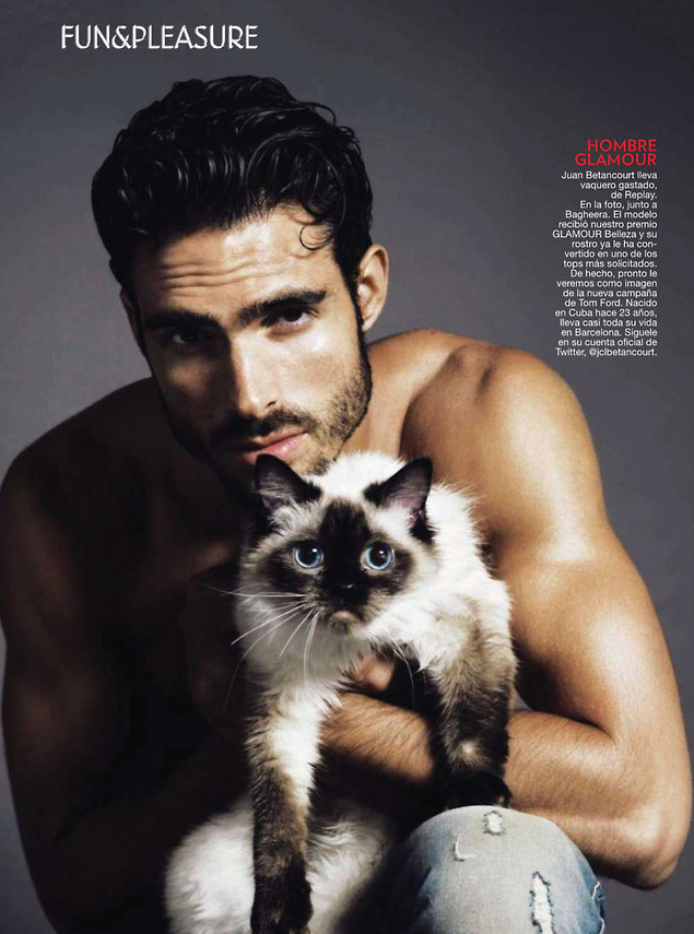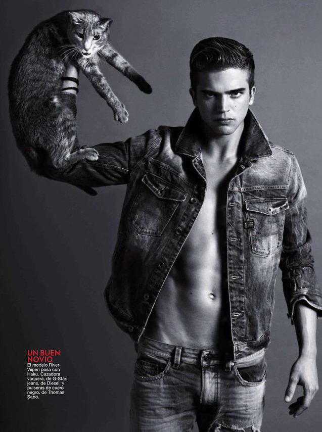 Models & Cats–Captured by photographer Sergi Pons for the July issue of Spanish Glamour, models Juan Betancourt, River Viiperi and Stephen James are in good company, sharing the spotlight with cats. With a story that explores the relationship between men and cats, the models pose for studio portraits, styled by Miriam Arruga in the timeless simplicity of denim. Delivering their favorite poses, Juan, River and Stephen also share their thoughts about cats and love, proving that masculine strength isn’t only about force. /Photo assistance by Anne Yarza. Hair & makeup by José Sequi.