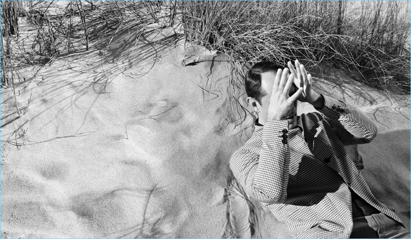 After a striking advertisement featuring Eddie Redmayne, Prada looks to Jude Law as its latest celebrity face. The Young Pope star connects with photographer Willy Vanderperre for the fashion house’s spring-summer 2017 campaign. Law takes to a beach for a gloomy black and white photo series. Stylist Olivier Rizzo outfits the actor in slim tailoring from Prada’s collection, which was inspired by the global traveler.