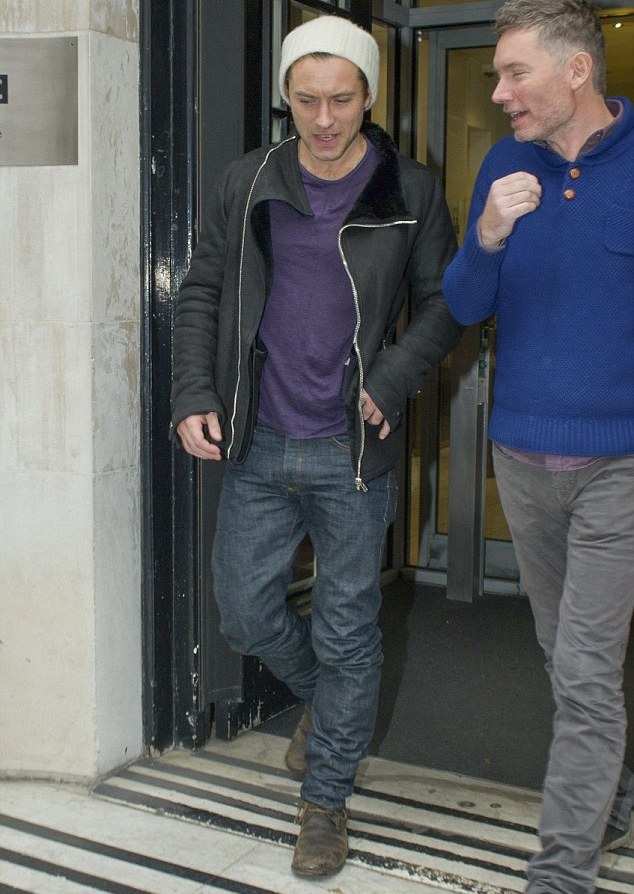 Spotted out and about London as he left BBC Radio 1 Studios, actor Jude Law kept his style casual with essential denim jeans, brown leather boots, a knit beanie and a relaxed t-shirt. Finishing his candid style, Law turned to Rick Owens with a modern leather shearling jacket.Pin