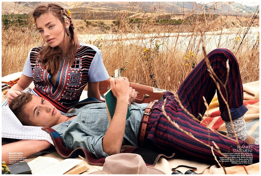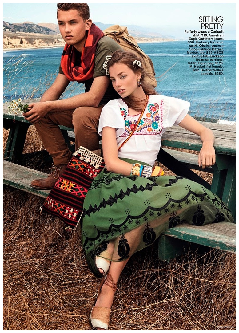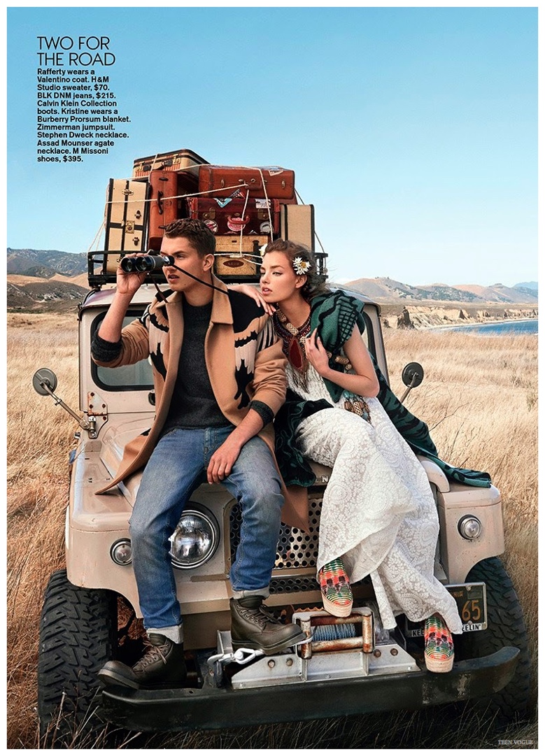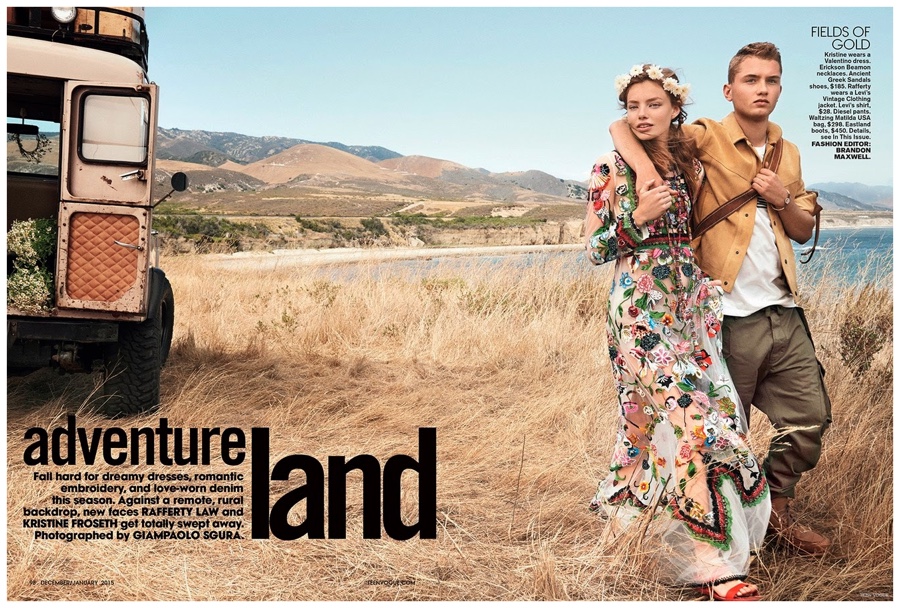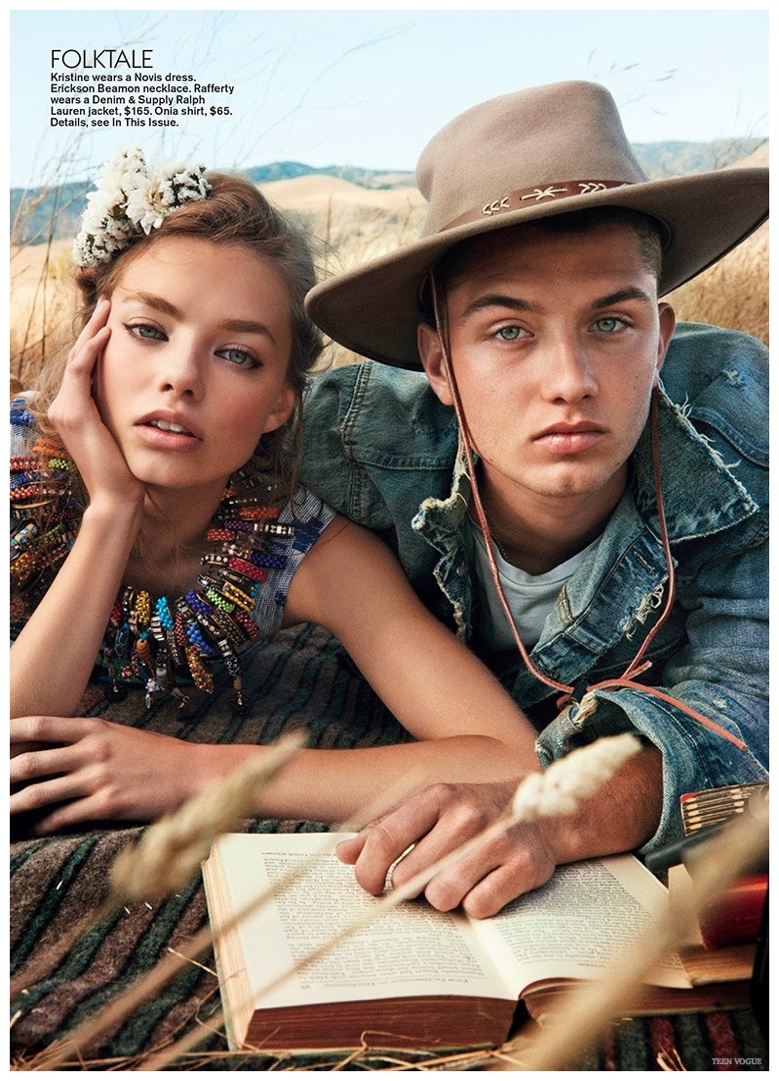 After making his catwalk debut last year for DKNY during London Collections: Men, Jude Law’s son Rafferty takes his modeling to the next step with a fashion editorial in Teen Vogue. Photographed by Giampaolo Sgura, Rafferty Law heads outdoors for a shoot with model Kristine Froseth. Wearing casual fashions with a rural flair, Rafferty is styled by Brandon Maxwell in picture-perfect denim jackets, relaxed t-shirts, worn-in jeans and boots.