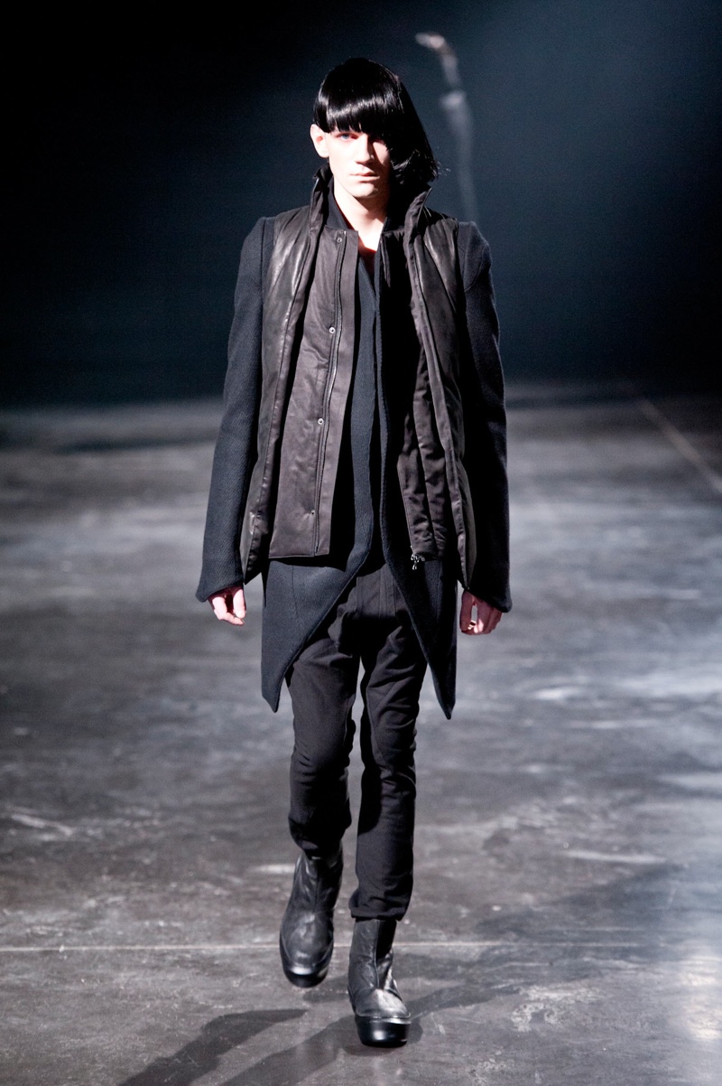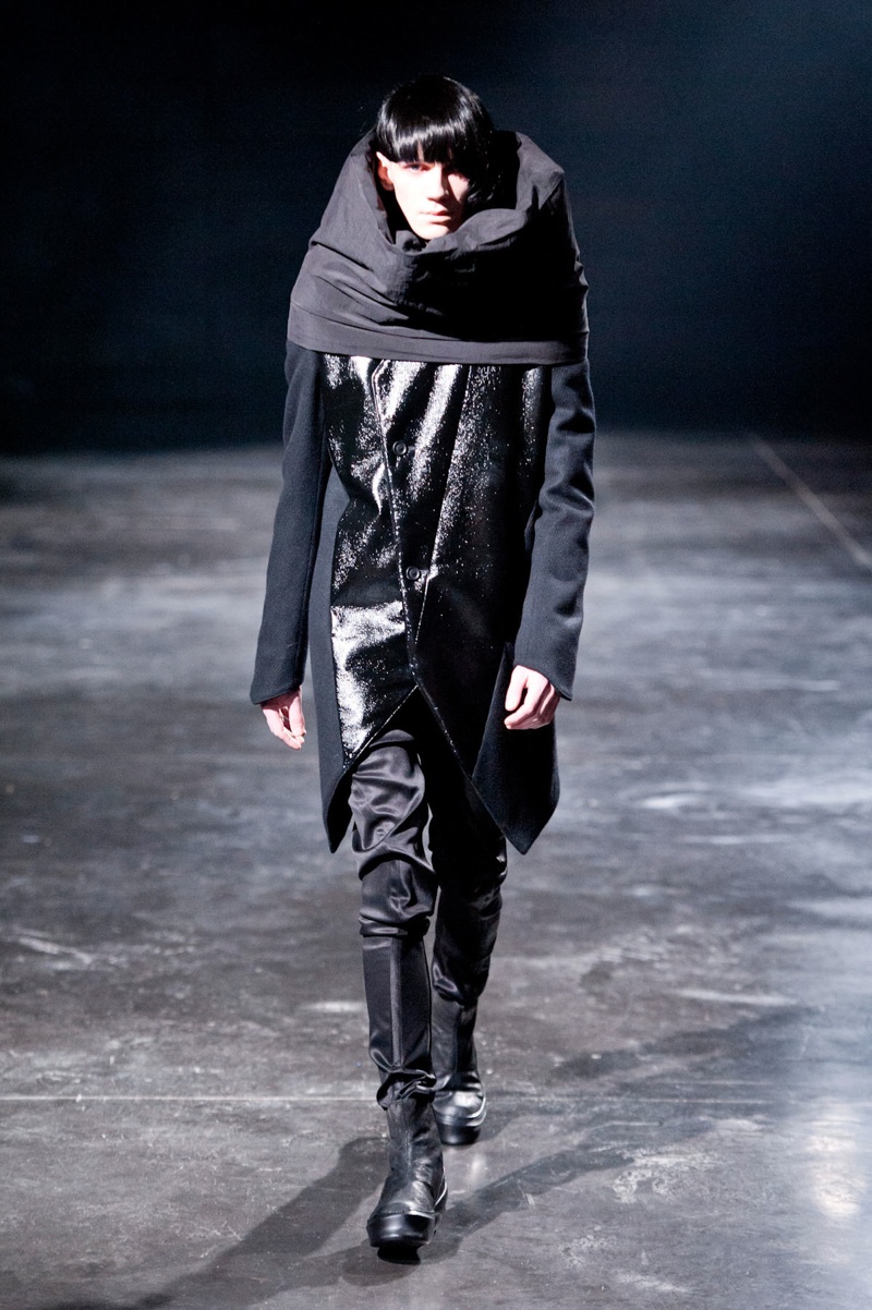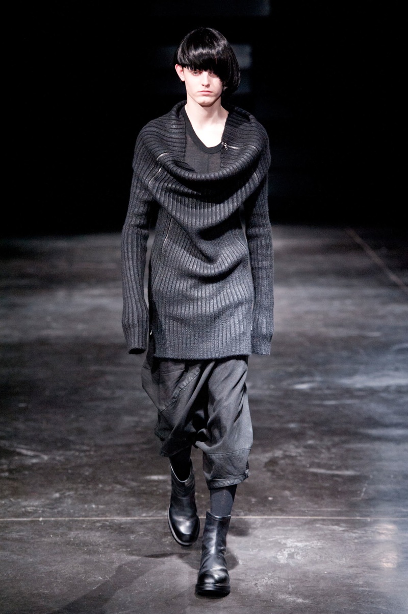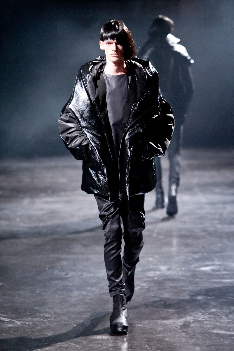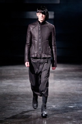 Julius Fall/Winter 2014–Rocking asymmetrical wigs, the men of Julius hit the catwalk for fall/winter 2014 with the label’s signature color palette dressing a mix of tailored and draped garments. Built to best accentuate svelte figures, garments, regardless of proportions were kept relatively slim. In one standout look, a giant textured knit featured a collapsed oversized cowl neck. Illustrating the collection’s simple styling choices, the knit was worn a pair of baggy shorts and a lightweight long-sleeve tee. Meanwhile, jackets enlisted clean lines or a refined take on quilting that mirrored the comfort of premium down. Rounding out the collection with slick finishes, Julius presented a constrained lineup of modern essentials.