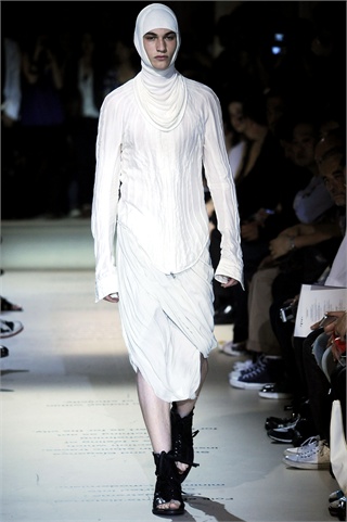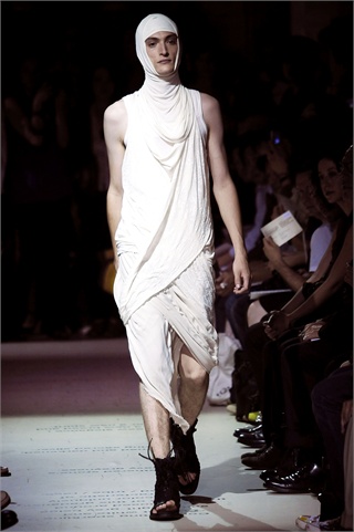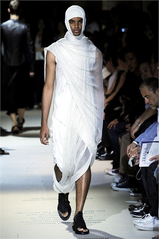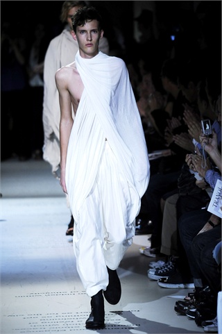 Primarily interested in art and less with the whims of the fashion world, it is no surprise that Julius designer Tatsuro Horikawa had no hesitation to wrap the Julius man head to toe this season in a mummy-like manner. Sheer, light and layered, the collection bears a predominantly white color palette with the exception of Korikawa’s dependence on black and the sporadic use of mustard yellow and gray. Overall, Horikawa turns up the ante with his use of draping, but stays true to the Julius aesthetic with deconstructed tops, buttery soft leather jackets and trousers, both billowing and form fitted.