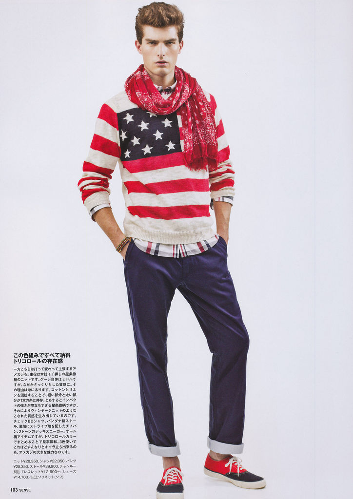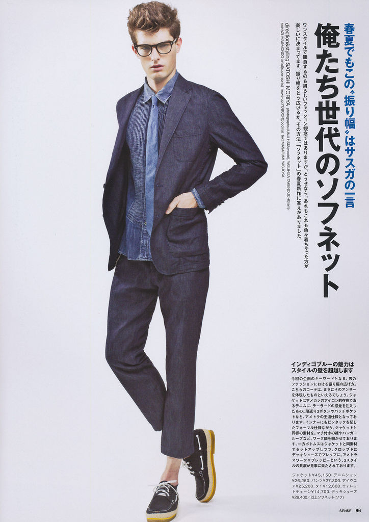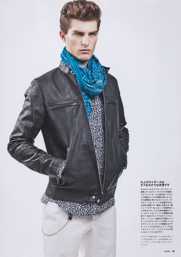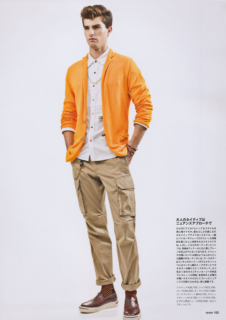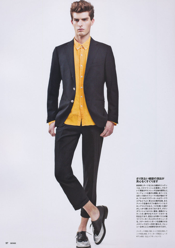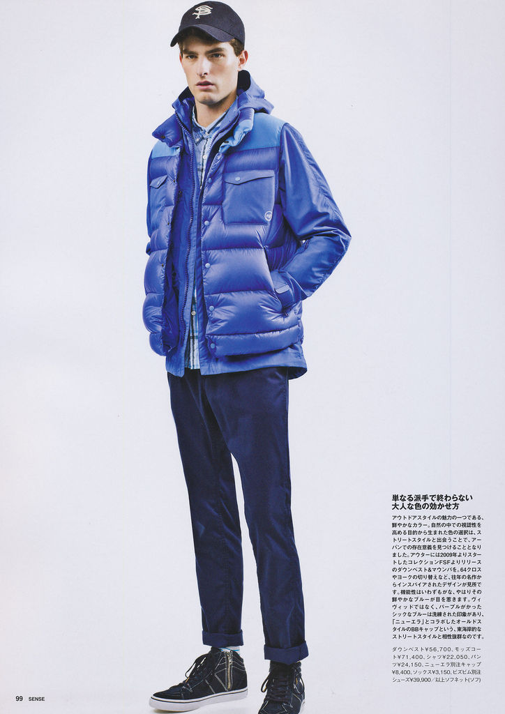 Multifunctional Wardrobe–Model Paolo Anchisi stars in a story published in the February 2013 issue of Sense magazine. The American model poses for Junji Hata’s lens, with styling by Satoshi Moriya, who assembled modern designs, for an updated wardrobe that plays with different flavors. From casual quilted jackets, to stylish fluid two-piece suits and combative camouflage prints, Paolo sports them with a young and natural attitude, thanks to vivid colors and fluid shapes. / Hair by Azuma. Makeup by Yoboon.