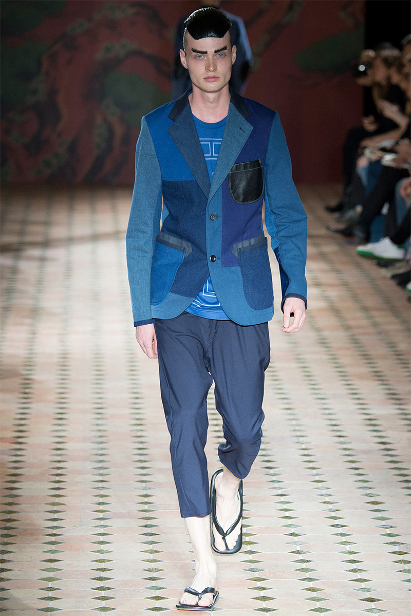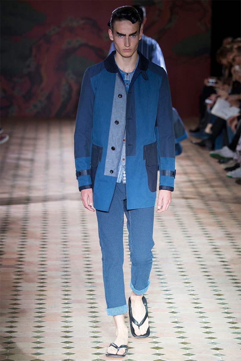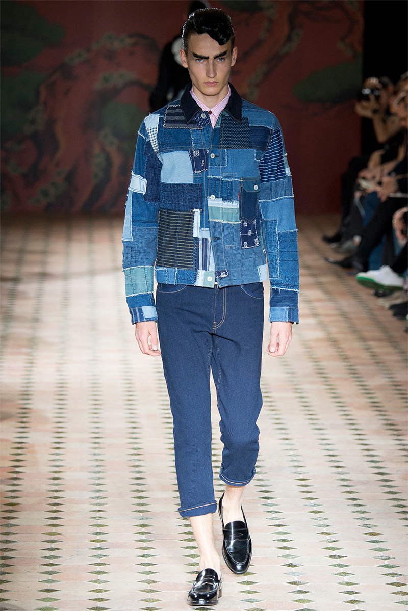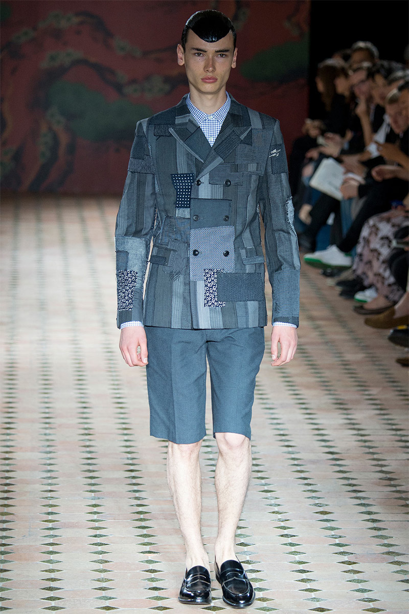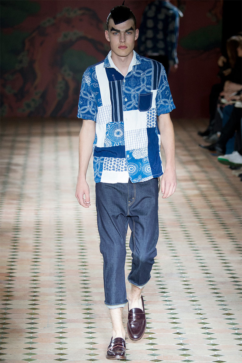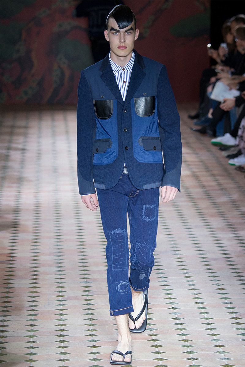 Junya Watanabe Spring/Summer 2015–Embracing denim and blue for spring/summer 2015, Junya Watanabe’s latest collection fit right in with one of the season’s biggest trends. Refocused on simple dress and essentials, the denim trend is one to follow next season. For Junya Watanabe, this met a casual collection that juxtaposed the classic with pieces such as joggers and blazers. One denim jacket was mixed with leather for a luxe finish. Reinterpreted in another fashion, a patch blazer looked great with a relaxed pair of denim jeans. Also embracing stripes, micro dots, zig zags and plaids, Junya Watanabe crafted a charming collection that felt young and fresh. This energy was obvious in the silhouettes of drop crotch pants, cropped trousers and relaxed graphic tees.