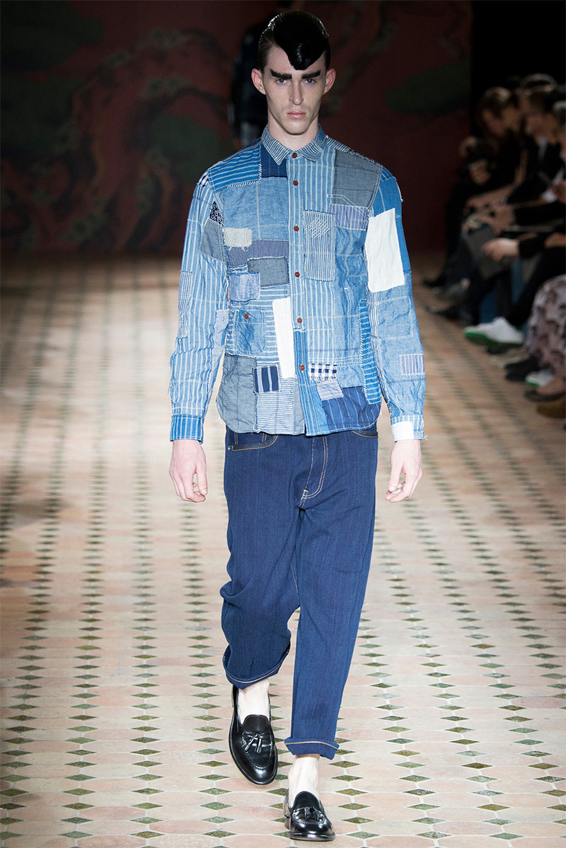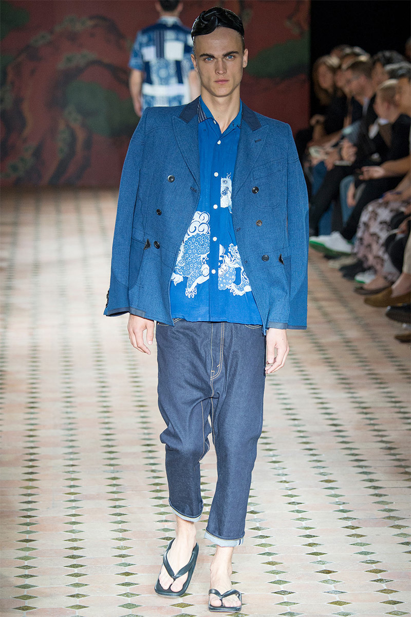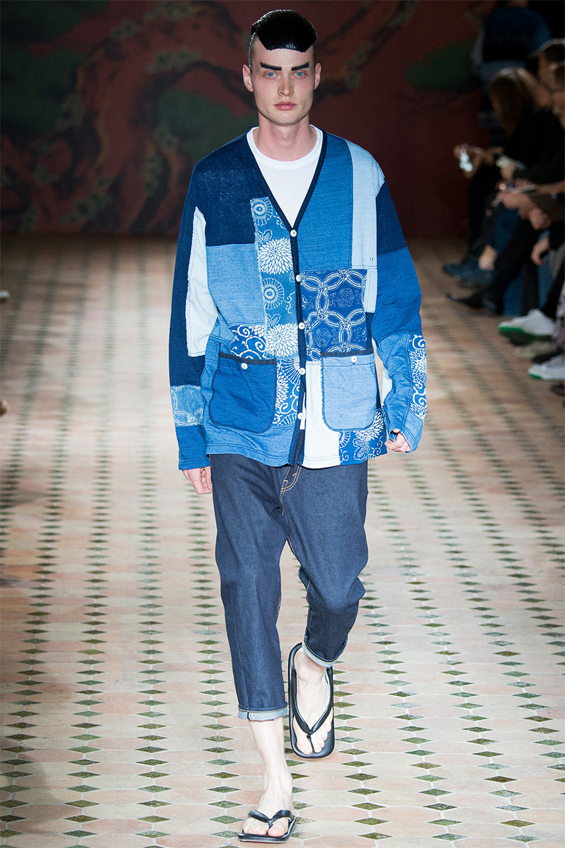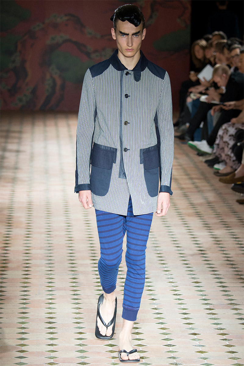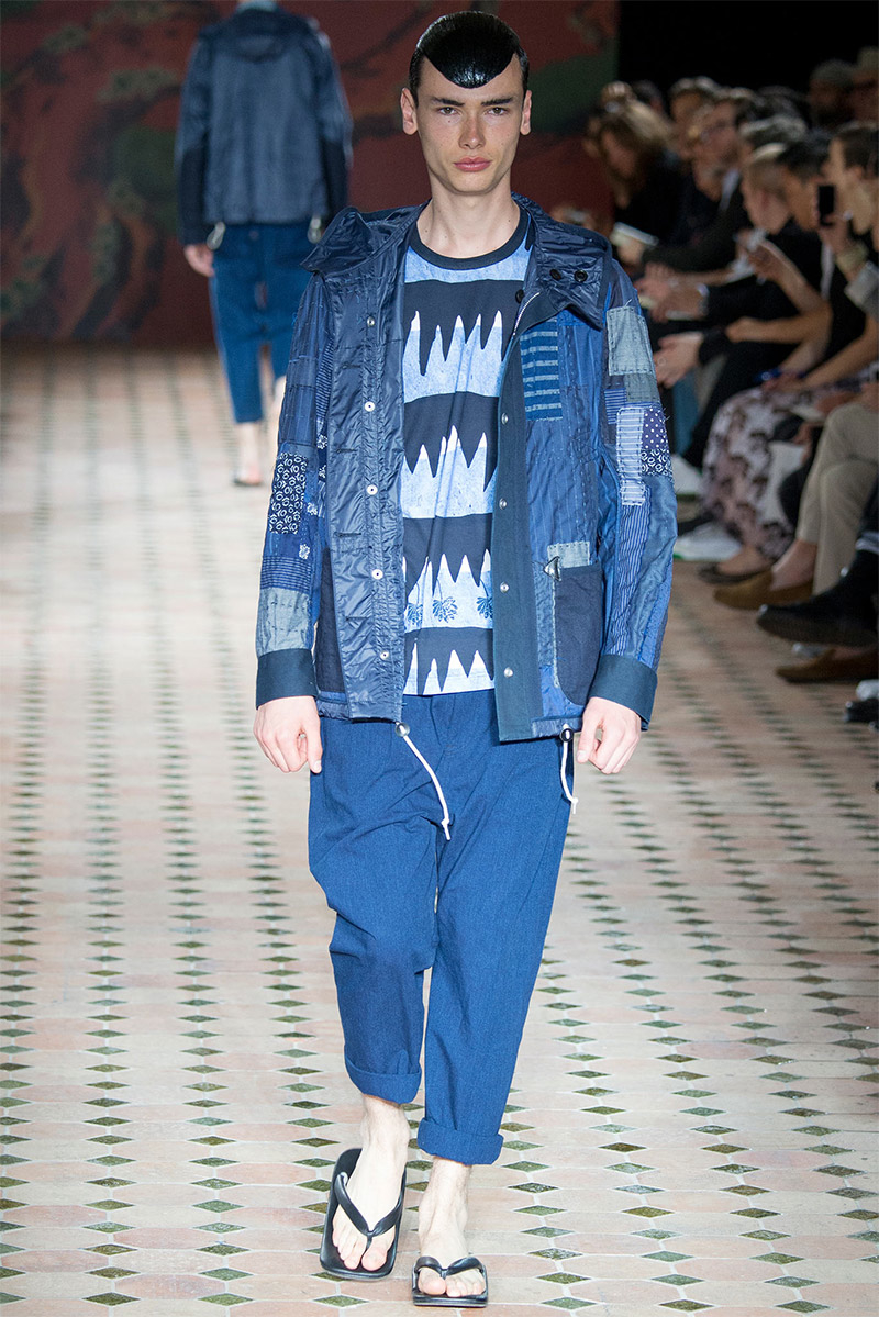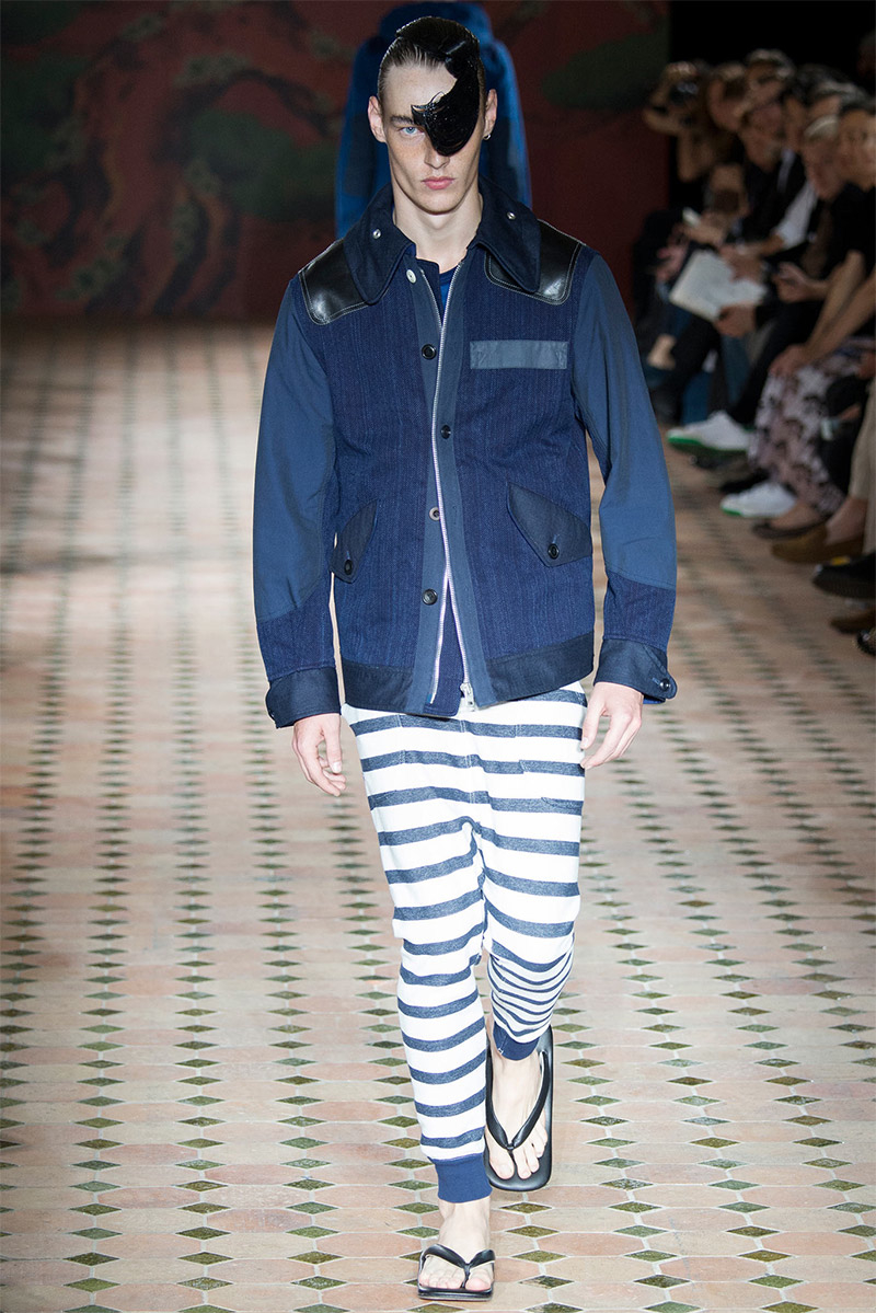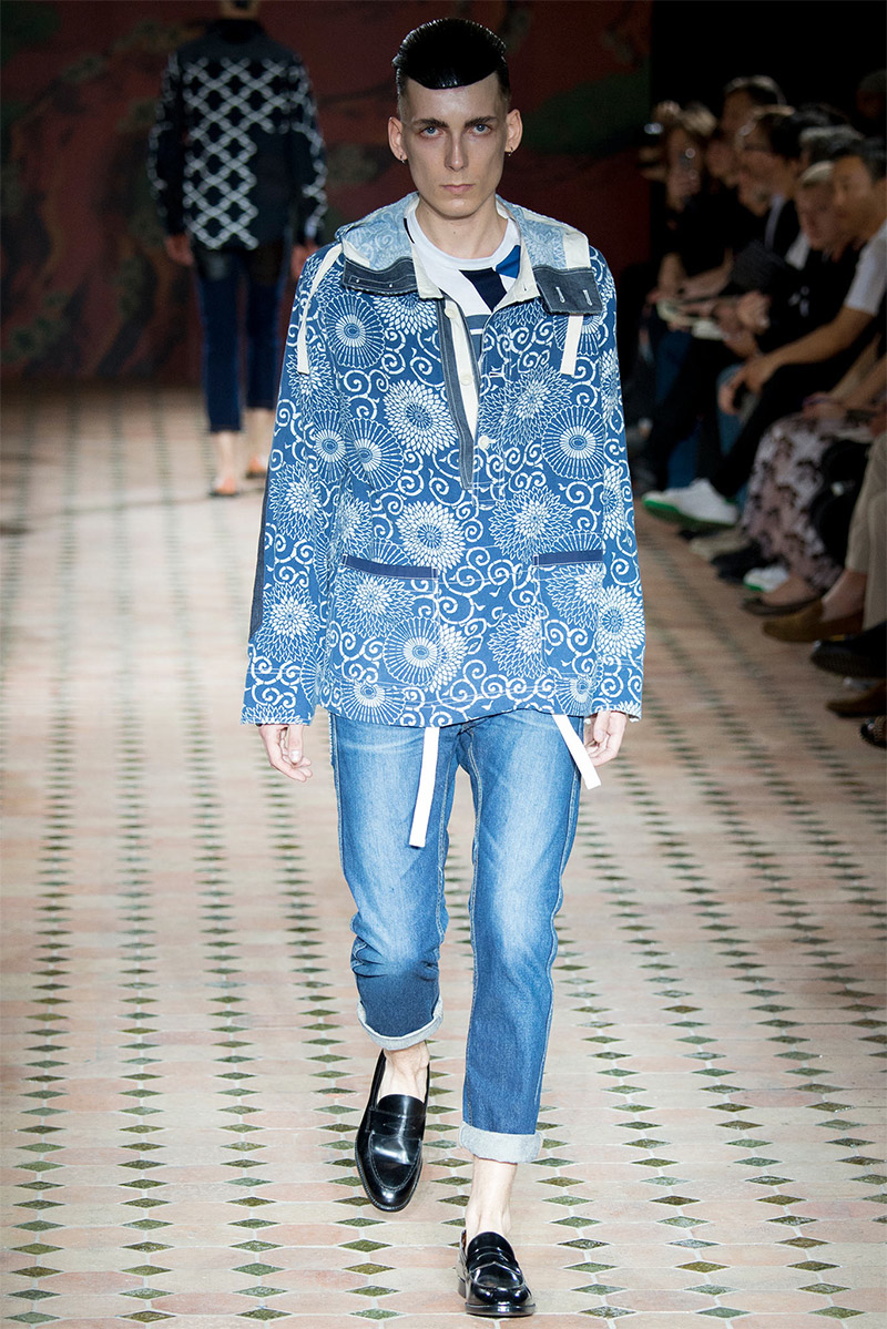 Junya Watanabe Spring/Summer 2015–Embracing denim and blue for spring/summer 2015, Junya Watanabe’s latest collection fit right in with one of the season’s biggest trends. Refocused on simple dress and essentials, the denim trend is one to follow next season. For Junya Watanabe, this met a casual collection that juxtaposed the classic with pieces such as joggers and blazers. One denim jacket was mixed with leather for a luxe finish. Reinterpreted in another fashion, a patch blazer looked great with a relaxed pair of denim jeans. Also embracing stripes, micro dots, zig zags and plaids, Junya Watanabe crafted a charming collection that felt young and fresh. This energy was obvious in the silhouettes of drop crotch pants, cropped trousers and relaxed graphic tees.