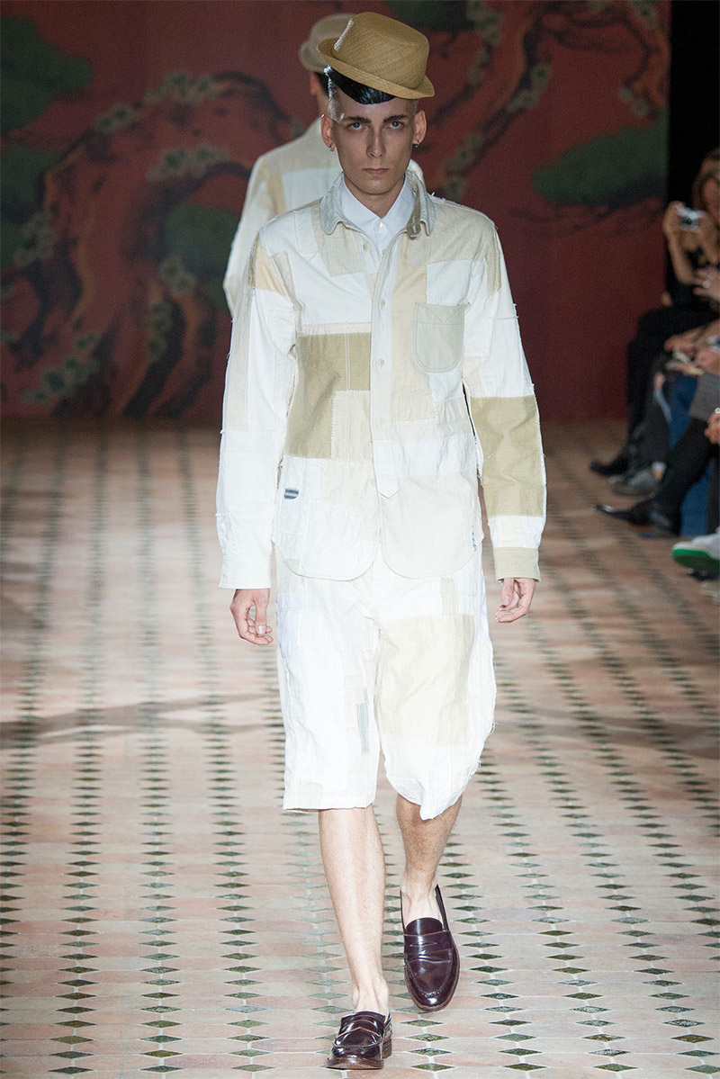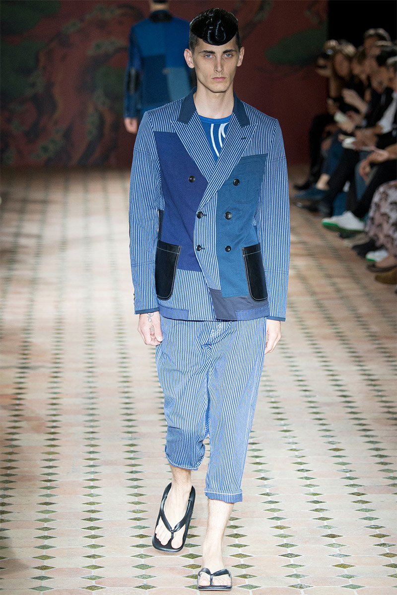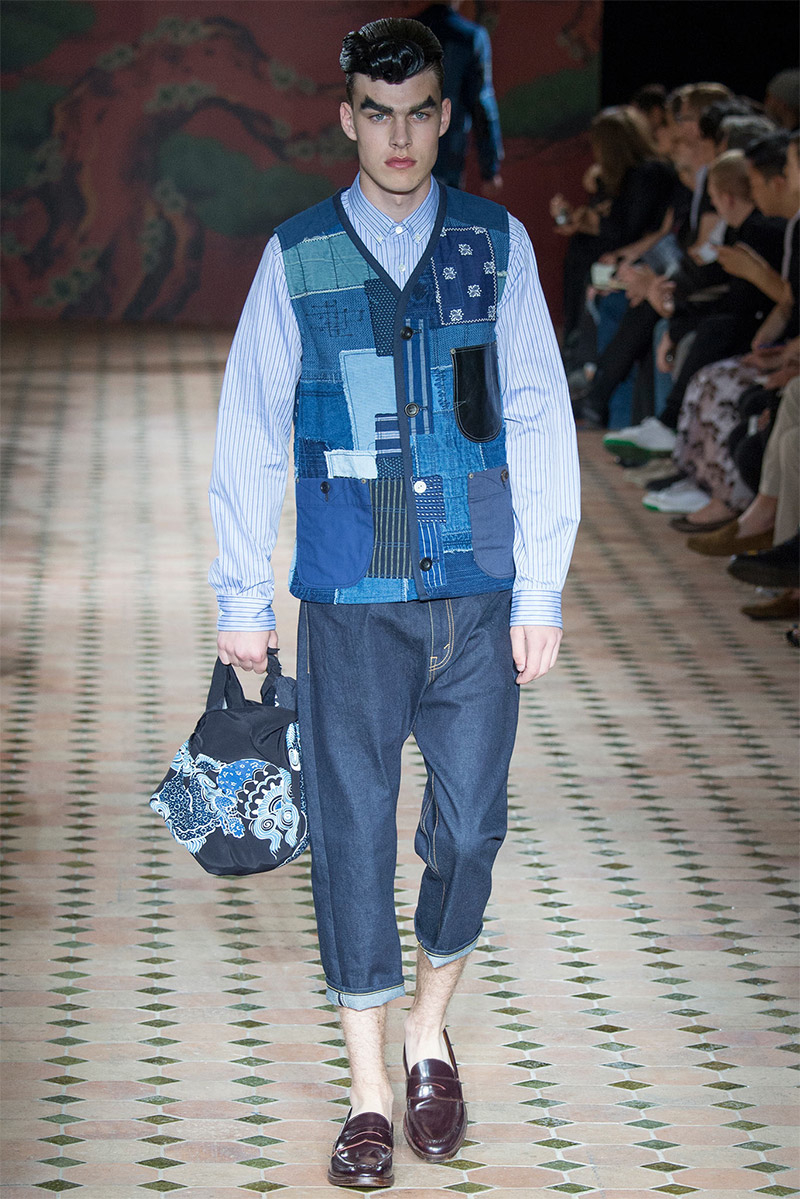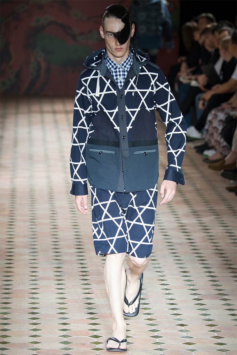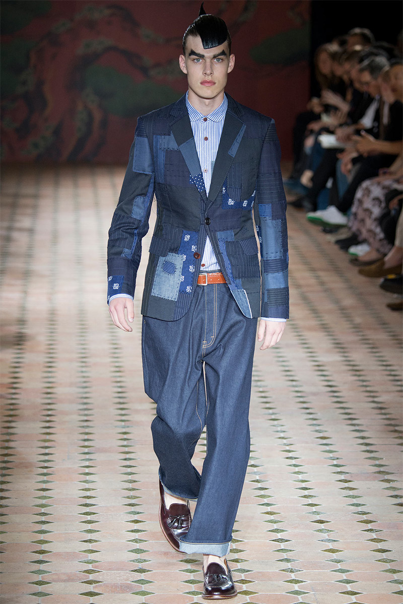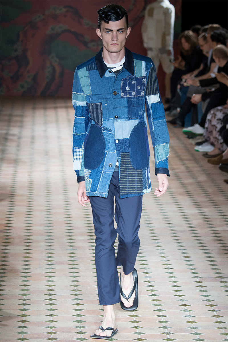 Junya Watanabe Spring/Summer 2015–Embracing denim and blue for spring/summer 2015, Junya Watanabe’s latest collection fit right in with one of the season’s biggest trends. Refocused on simple dress and essentials, the denim trend is one to follow next season. For Junya Watanabe, this met a casual collection that juxtaposed the classic with pieces such as joggers and blazers. One denim jacket was mixed with leather for a luxe finish. Reinterpreted in another fashion, a patch blazer looked great with a relaxed pair of denim jeans. Also embracing stripes, micro dots, zig zags and plaids, Junya Watanabe crafted a charming collection that felt young and fresh. This energy was obvious in the silhouettes of drop crotch pants, cropped trousers and relaxed graphic tees.