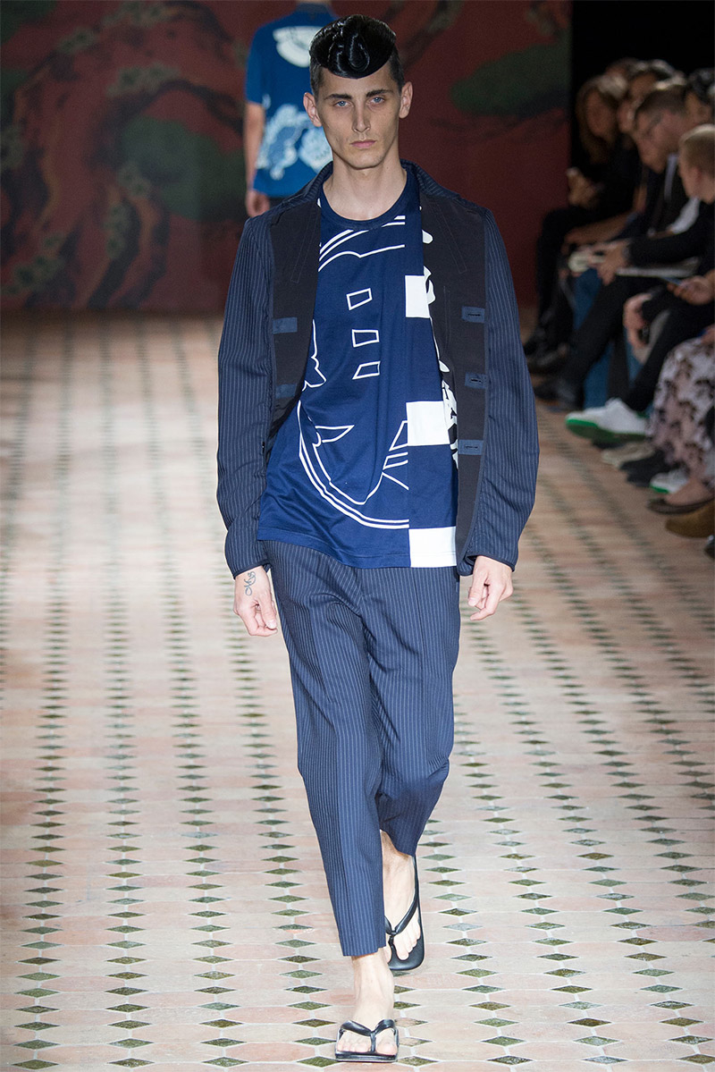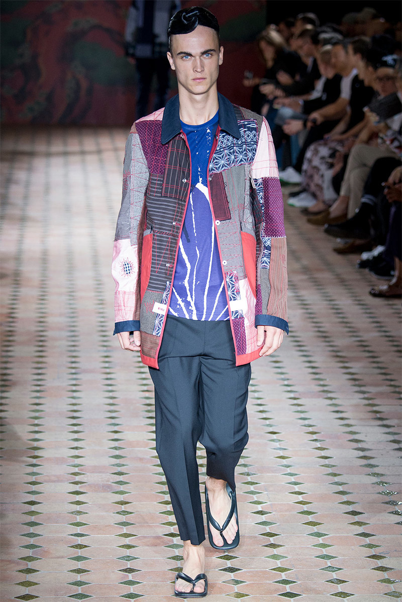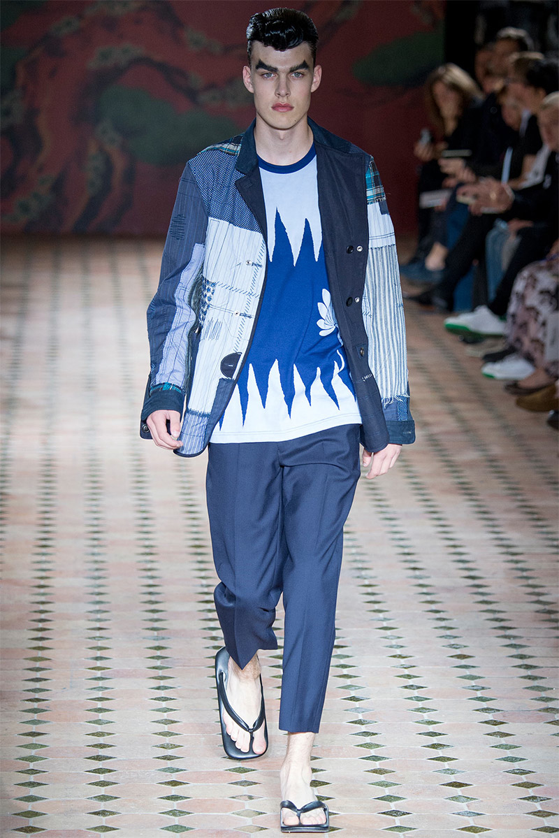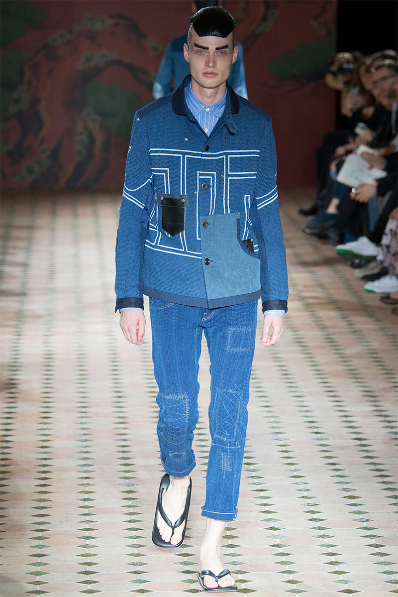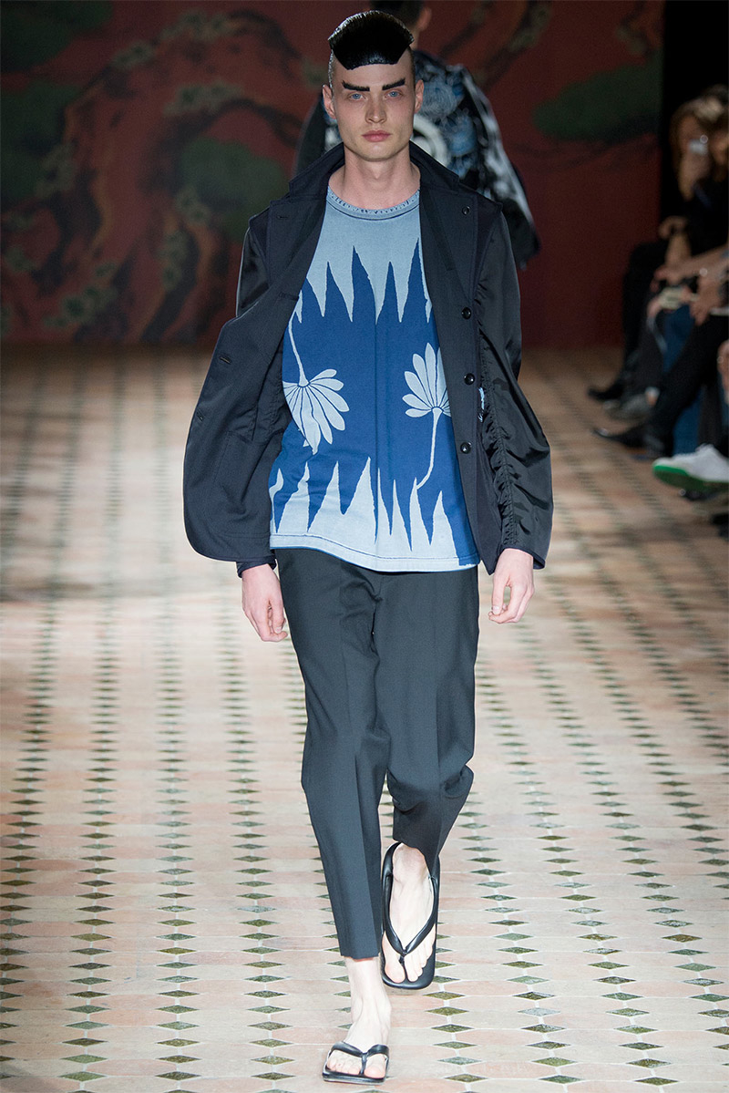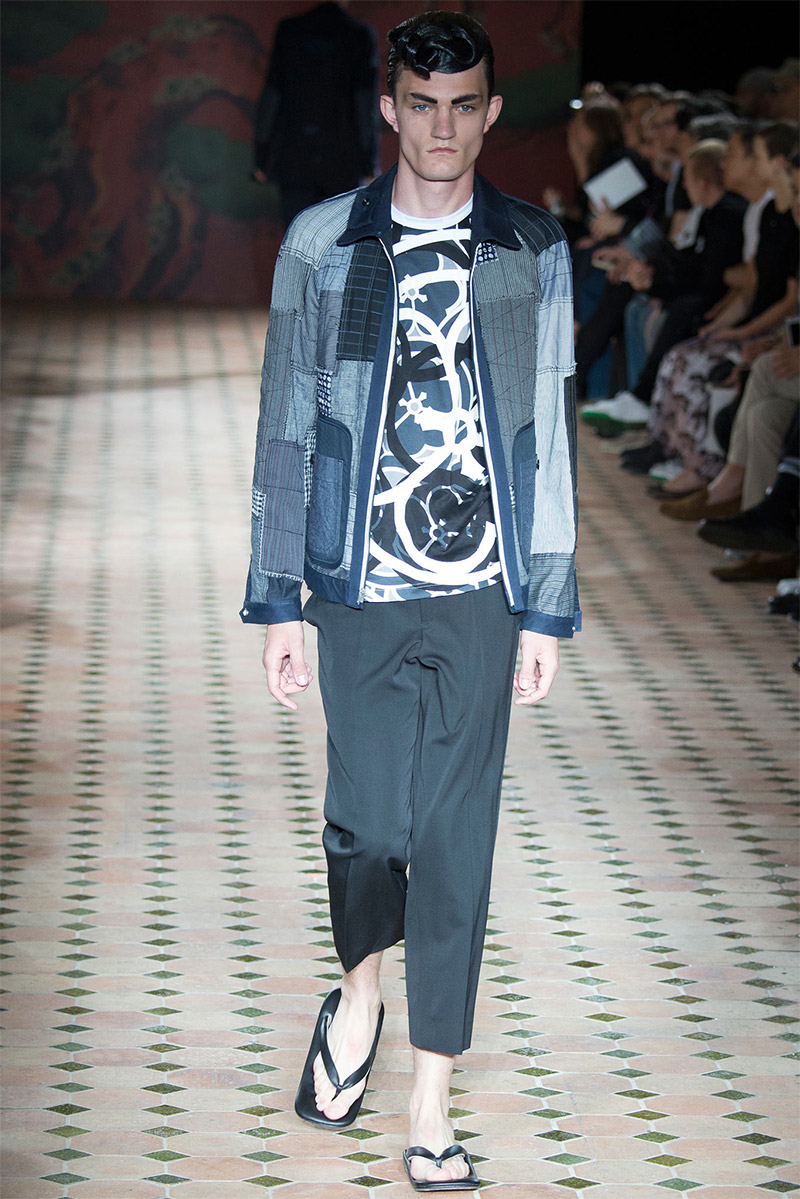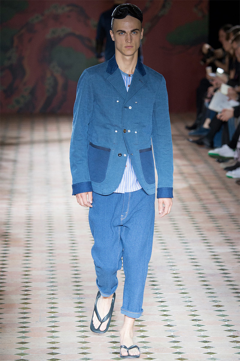 Junya Watanabe Spring/Summer 2015–Embracing denim and blue for spring/summer 2015, Junya Watanabe’s latest collection fit right in with one of the season’s biggest trends. Refocused on simple dress and essentials, the denim trend is one to follow next season. For Junya Watanabe, this met a casual collection that juxtaposed the classic with pieces such as joggers and blazers. One denim jacket was mixed with leather for a luxe finish. Reinterpreted in another fashion, a patch blazer looked great with a relaxed pair of denim jeans. Also embracing stripes, micro dots, zig zags and plaids, Junya Watanabe crafted a charming collection that felt young and fresh. This energy was obvious in the silhouettes of drop crotch pants, cropped trousers and relaxed graphic tees.