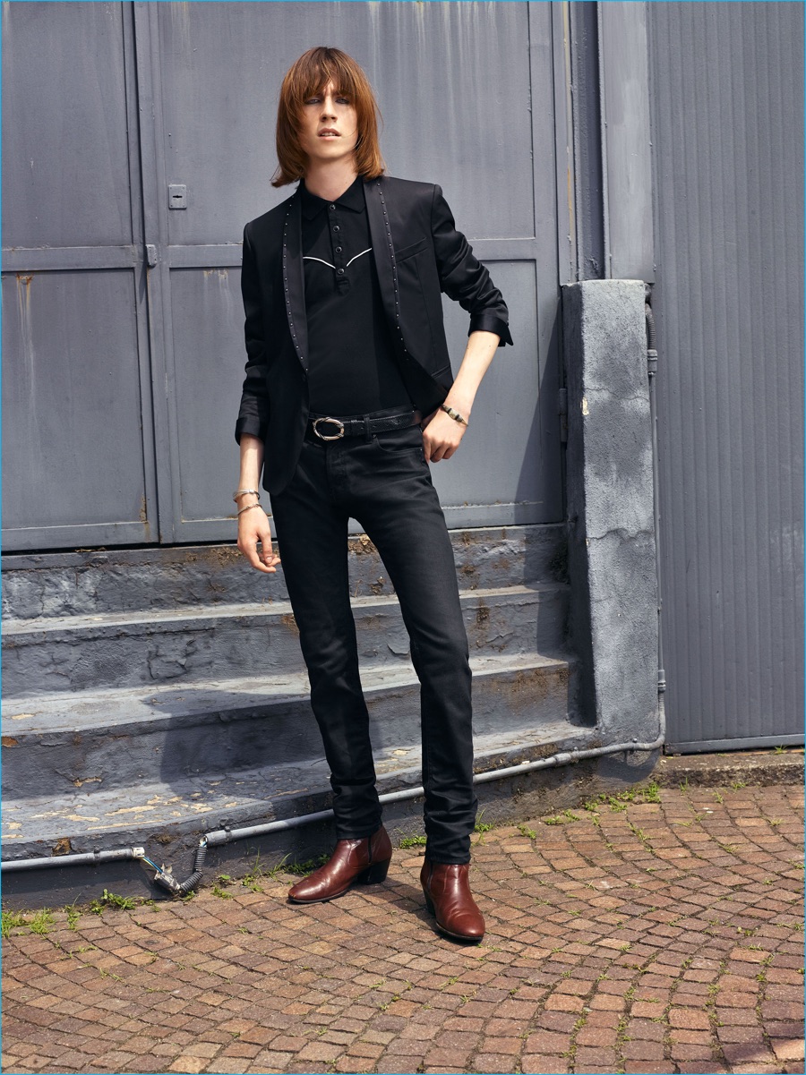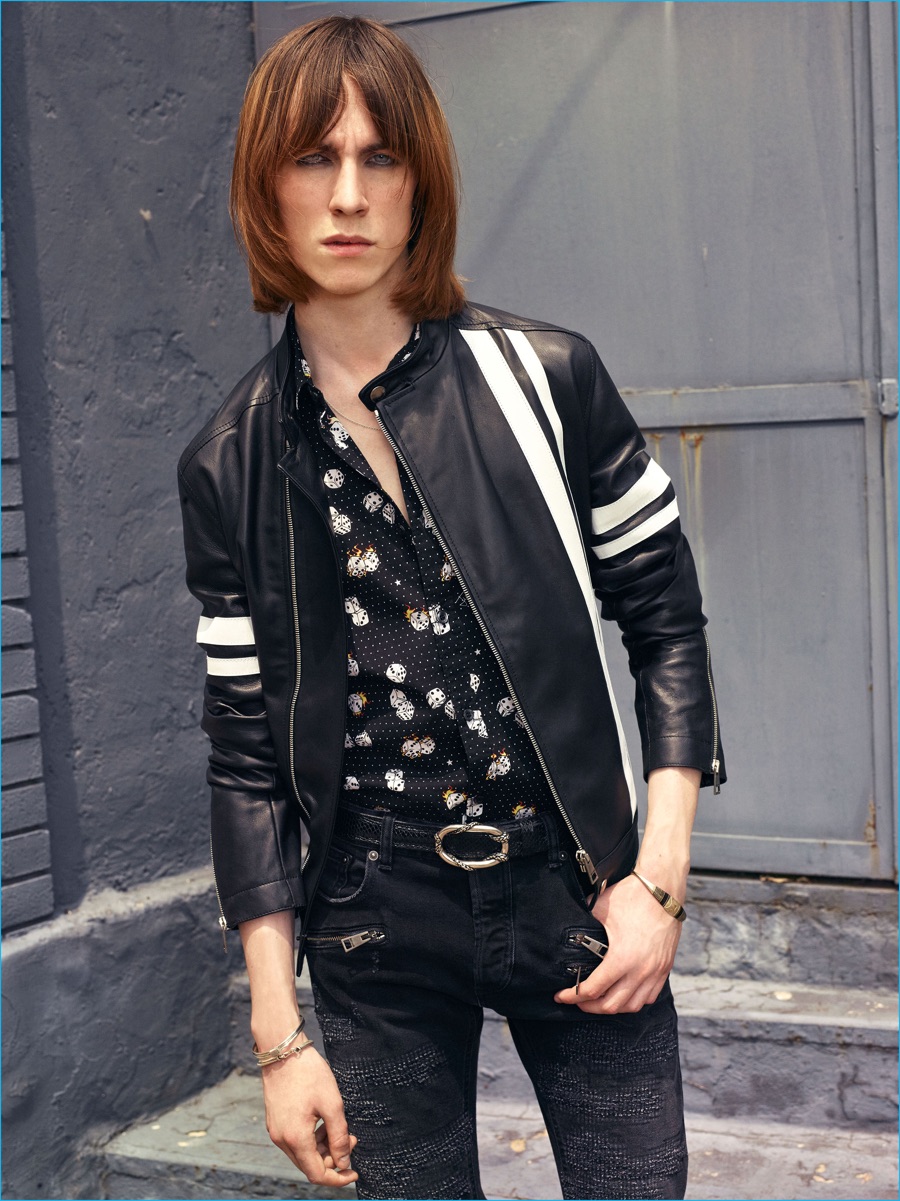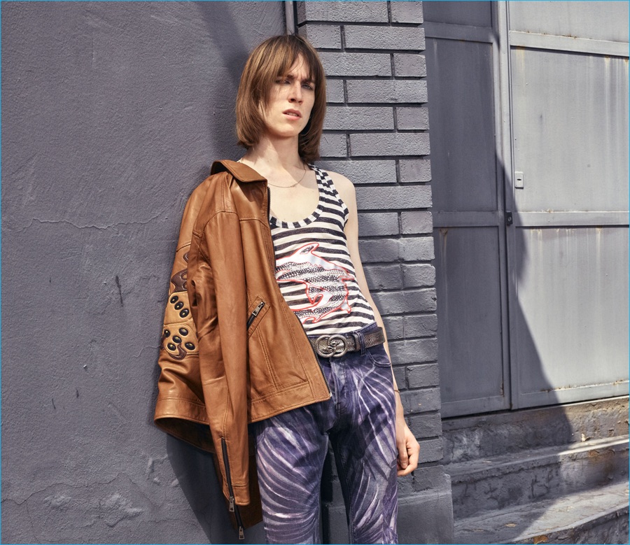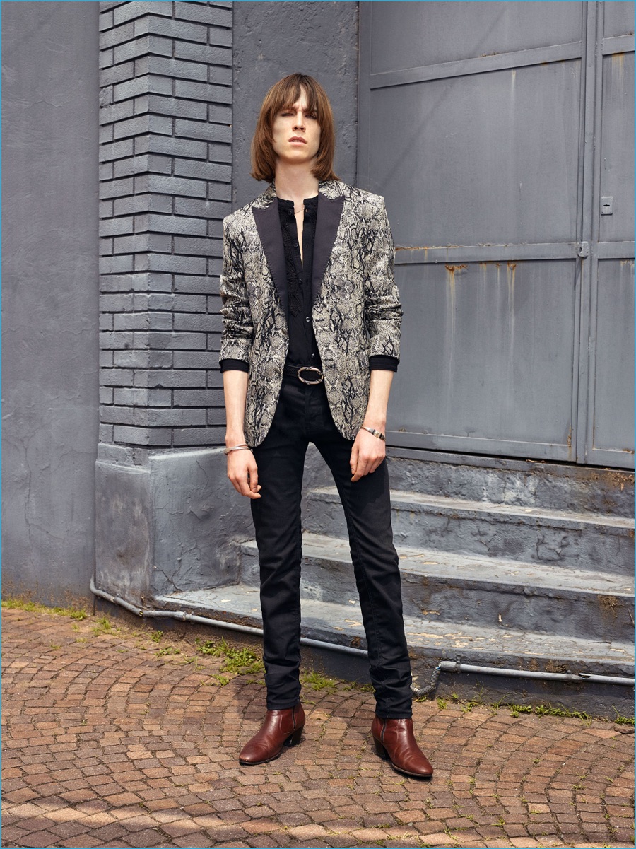 On the heels of the unveil of Roberto Cavalli’s spring-summer 2017 collection, Just Cavalli prepares for resort season with its latest menswear designs. Peter Dundas champions rocker boys as he taps into the styles of the late 1970s and early 80s for inspiration. The season’s color palette takes on a bright attitude with a rainbow motif dressing jacquard knits. Paired with skinny jeans and leather ankle boots, the knits join a lineup of structured jackets and fitted shirts. Injecting the collection with a bold personality, floral, palm and snake patterns accent Dundas’ nostalgic designs. Rounding out the range, the leather jacket is front and center with a moto style dominating.