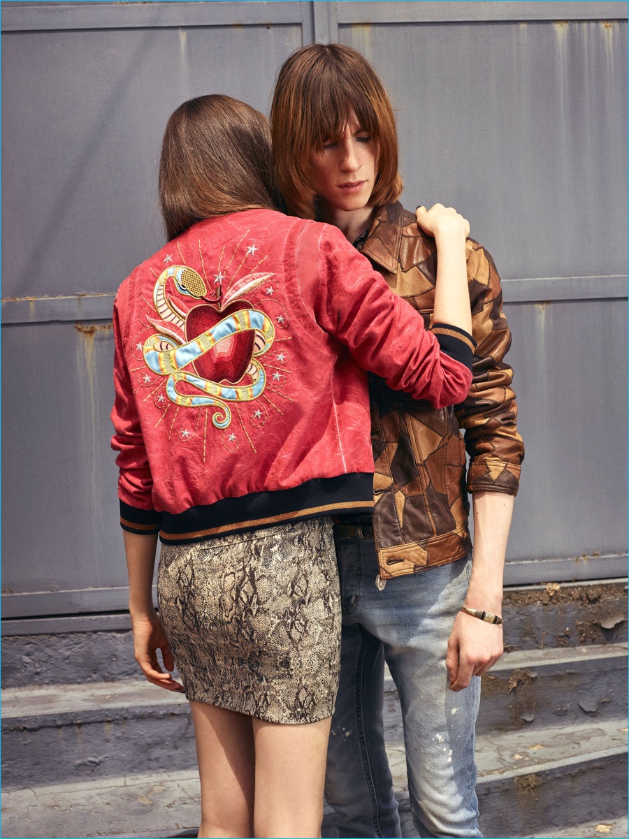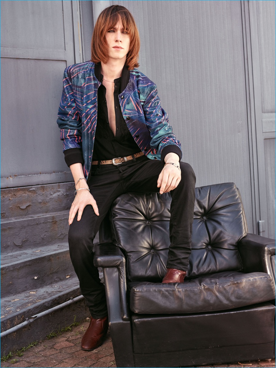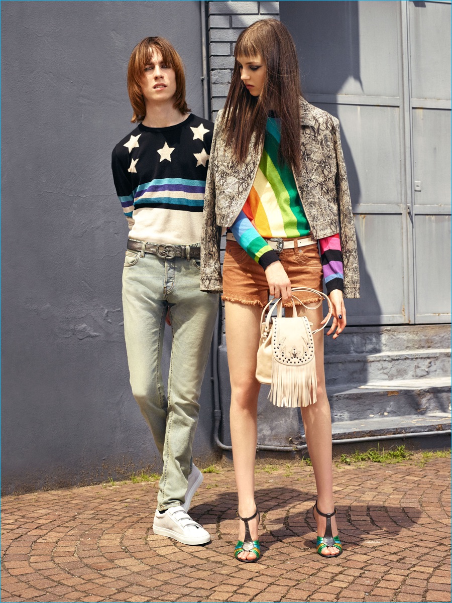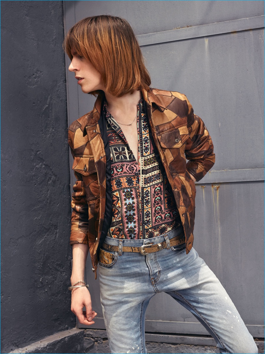 On the heels of the unveil of Roberto Cavalli’s spring-summer 2017 collection, Just Cavalli prepares for resort season with its latest menswear designs. Peter Dundas champions rocker boys as he taps into the styles of the late 1970s and early 80s for inspiration. The season’s color palette takes on a bright attitude with a rainbow motif dressing jacquard knits. Paired with skinny jeans and leather ankle boots, the knits join a lineup of structured jackets and fitted shirts. Injecting the collection with a bold personality, floral, palm and snake patterns accent Dundas’ nostalgic designs. Rounding out the range, the leather jacket is front and center with a moto style dominating.