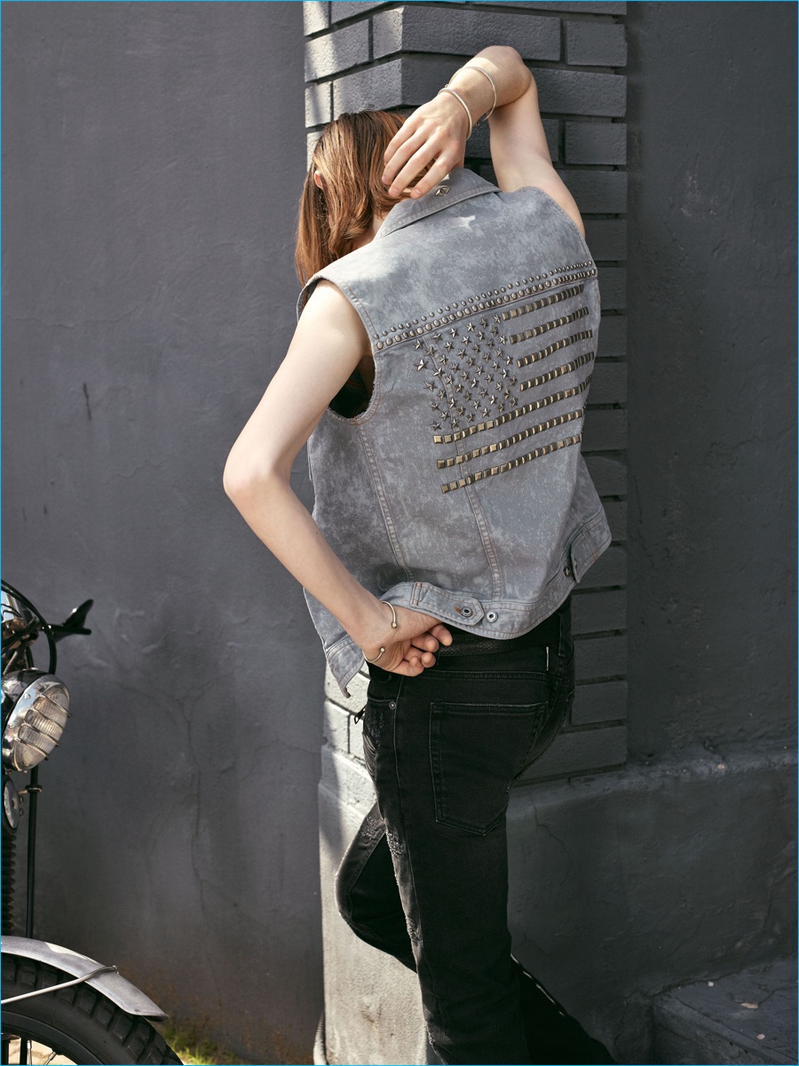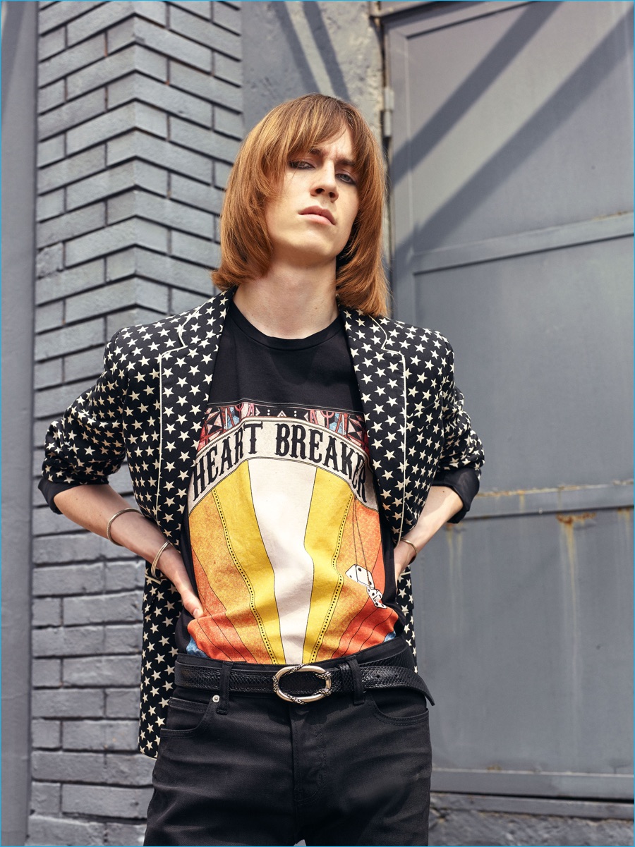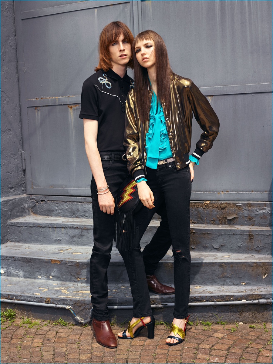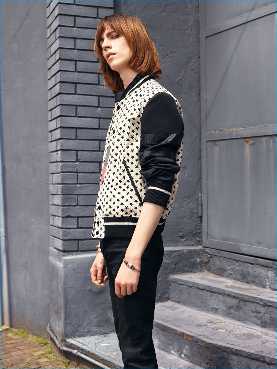 On the heels of the unveil of Roberto Cavalli’s spring-summer 2017 collection, Just Cavalli prepares for resort season with its latest menswear designs. Peter Dundas champions rocker boys as he taps into the styles of the late 1970s and early 80s for inspiration. The season’s color palette takes on a bright attitude with a rainbow motif dressing jacquard knits. Paired with skinny jeans and leather ankle boots, the knits join a lineup of structured jackets and fitted shirts. Injecting the collection with a bold personality, floral, palm and snake patterns accent Dundas’ nostalgic designs. Rounding out the range, the leather jacket is front and center with a moto style dominating.