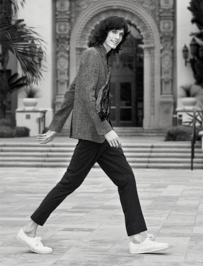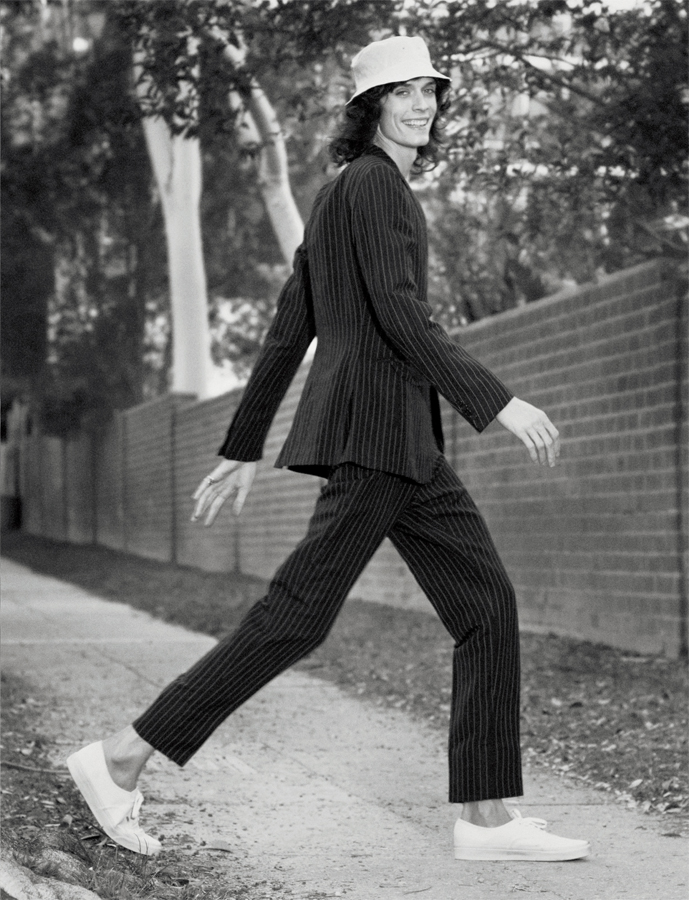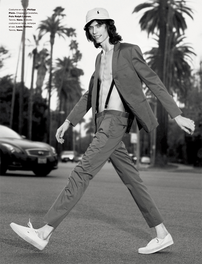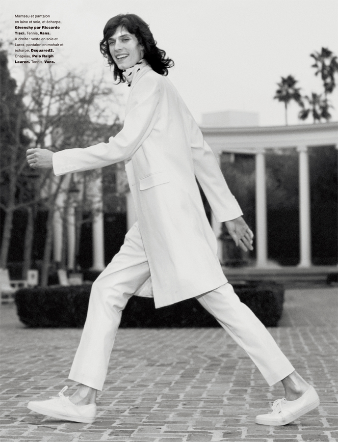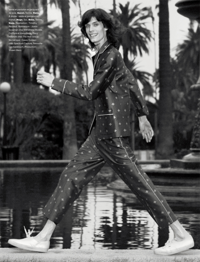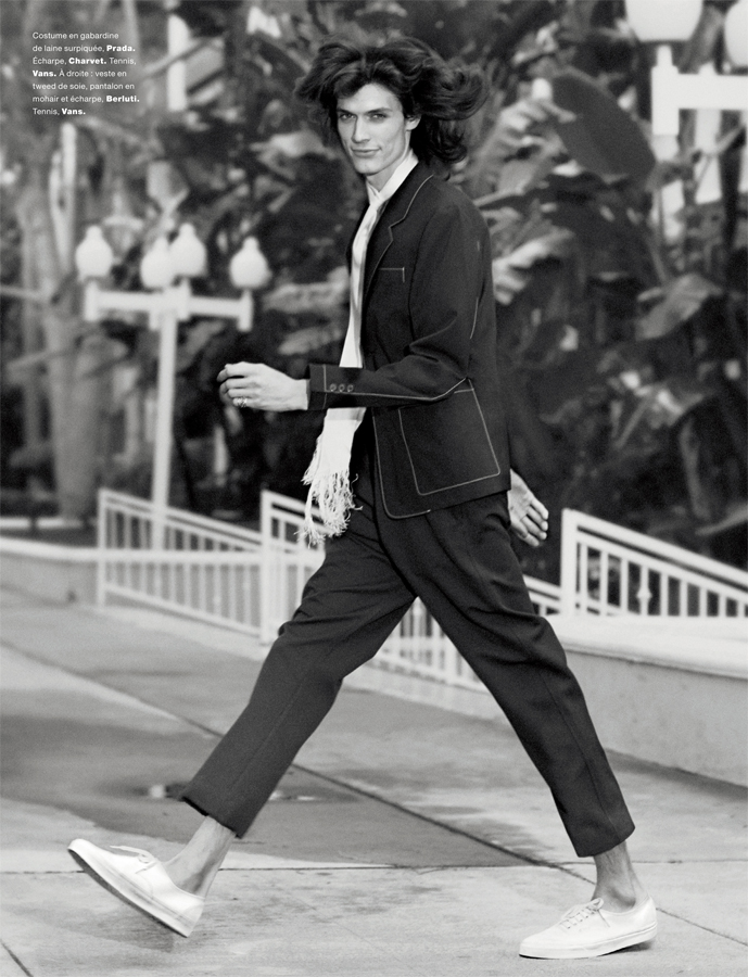 Justin Gossman stars in a cheeky editorial that brings to mind the iconic work of legendary Swiss photographer Hans Feurer. Captured in black & white images by Matthias Vriens-McGrath, Justin showcases designer tailoring from the spring-summer 2016 collections. Styled by Timothy Reukauf, Justin struts his stuff in trim suiting and white Vans sneakers. Featured labels for the lighthearted outing include Hermes, Givenchy and Gucci.