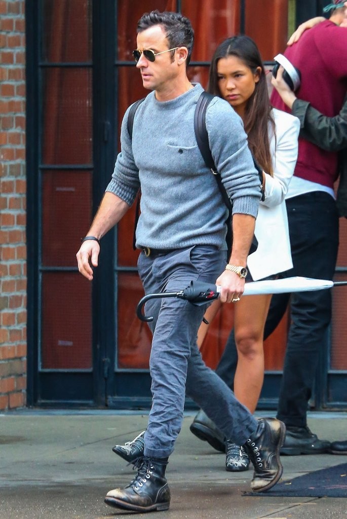 PinCaptured out and about in New York City on October 16, 2014, actor Justin Theroux enjoyed the day’s cool weather in Acne Studios’ grey wool chet sweater, complete with a breast pocket featuring a button closure. The ‘Leftovers’ actor completed his look with worn leather boots, charcoal pants and classic aviators.
