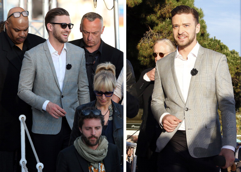 Timberlake in Dior–Mirrors singer Justin Timberlake attends the 66th Annual Cannes Film Festival, doing promo at a special edition of Le Grand Journal. Wearing Dior Homme for the occasion, Timberlake was spotted in a gray wool Prince of Wales check two-button notch lapel sport jacket and black wool trousers with a white cotton shirt and black leather derbies.