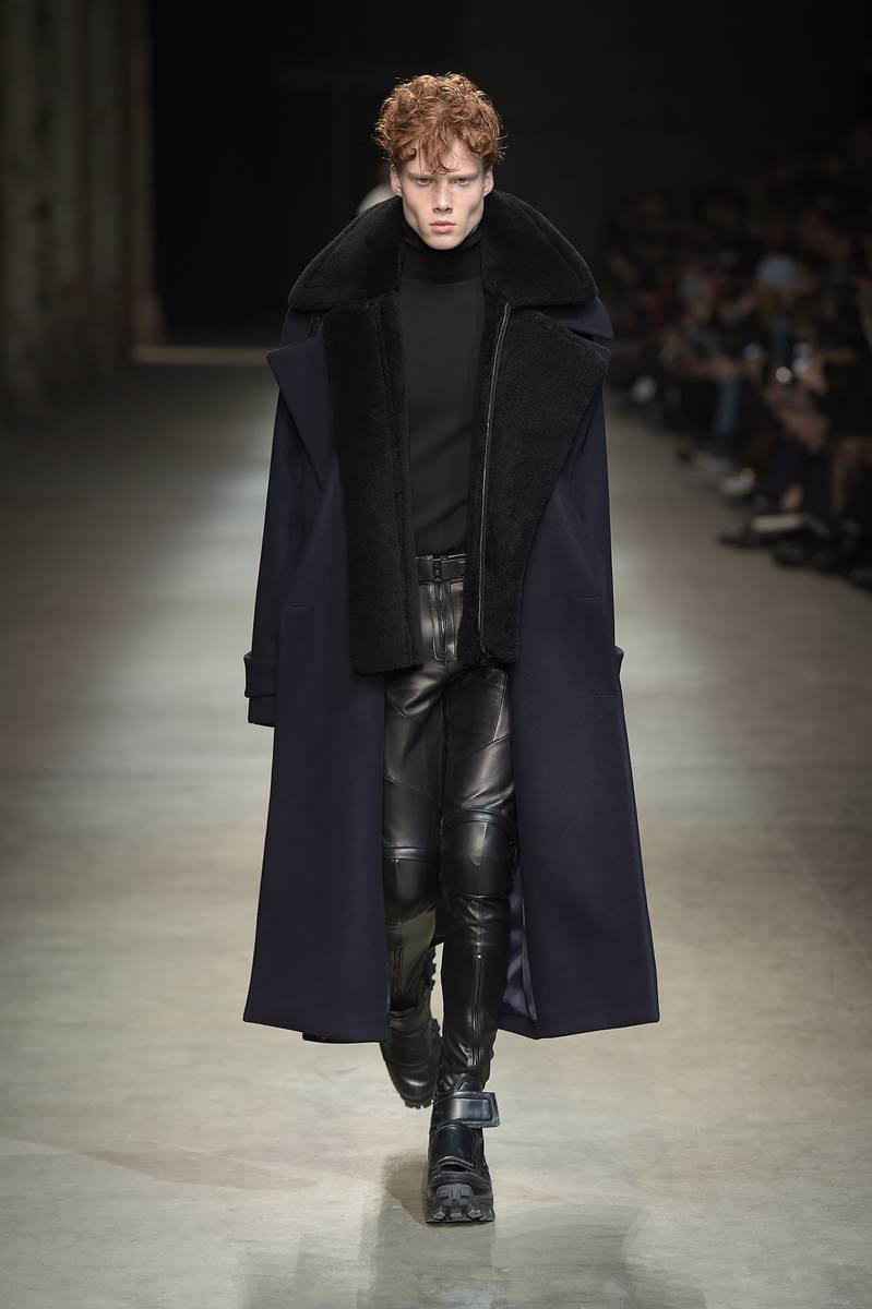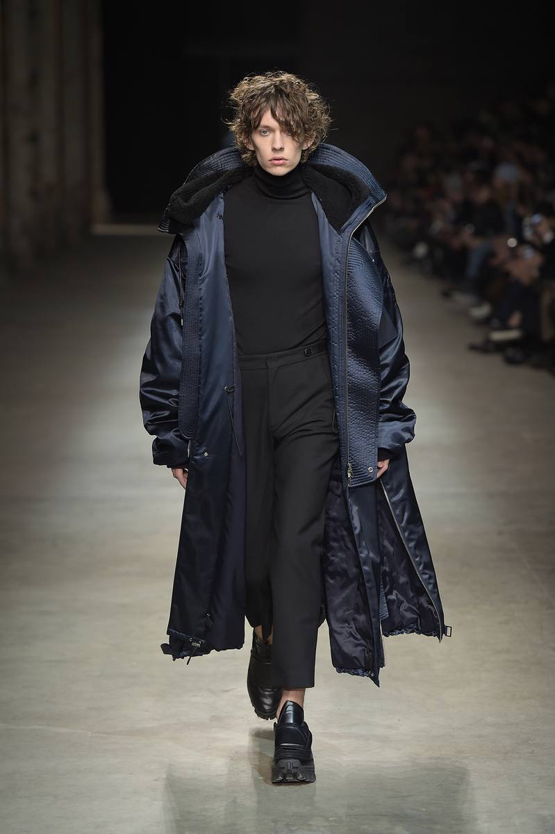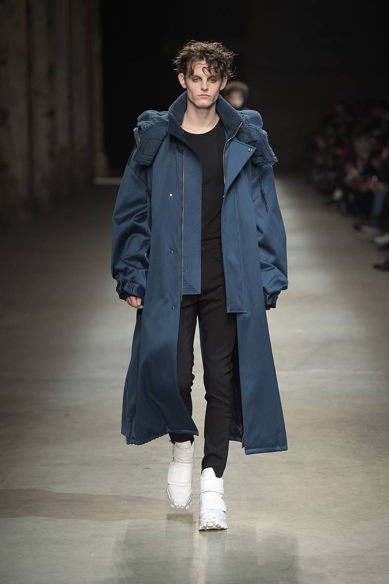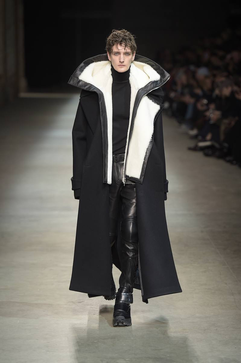 Pitti Uomo’s guest designer for fall-winter 2016, JUUN.J brought its oversized collection to Florence with a loosely tailored rift on futuristic style. Kicking off the show and garnering great interest, models took to the enormous catwalk in black and white shearling coats that made quite the dramatic impression.