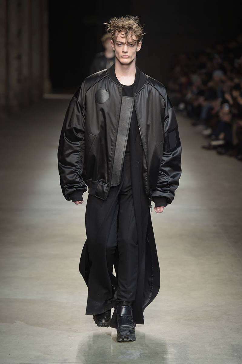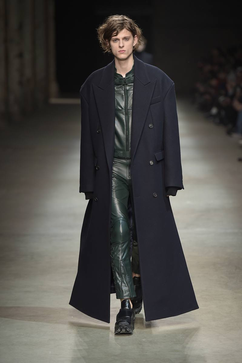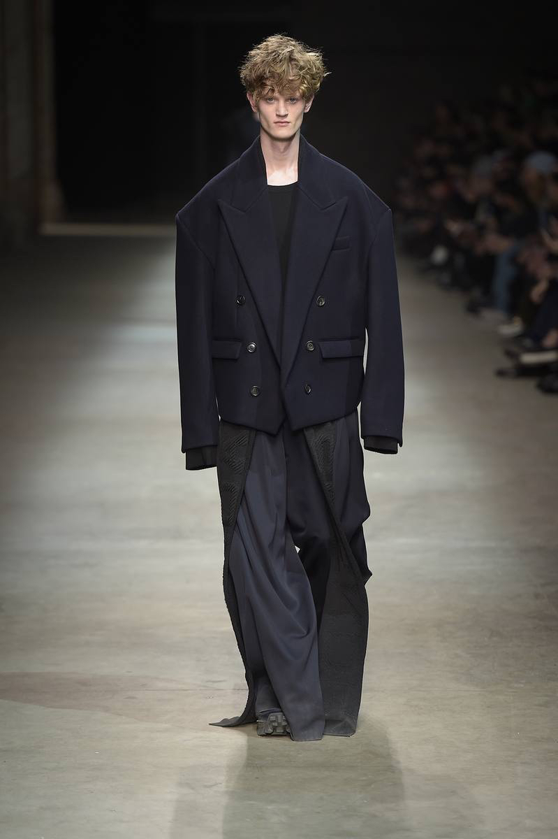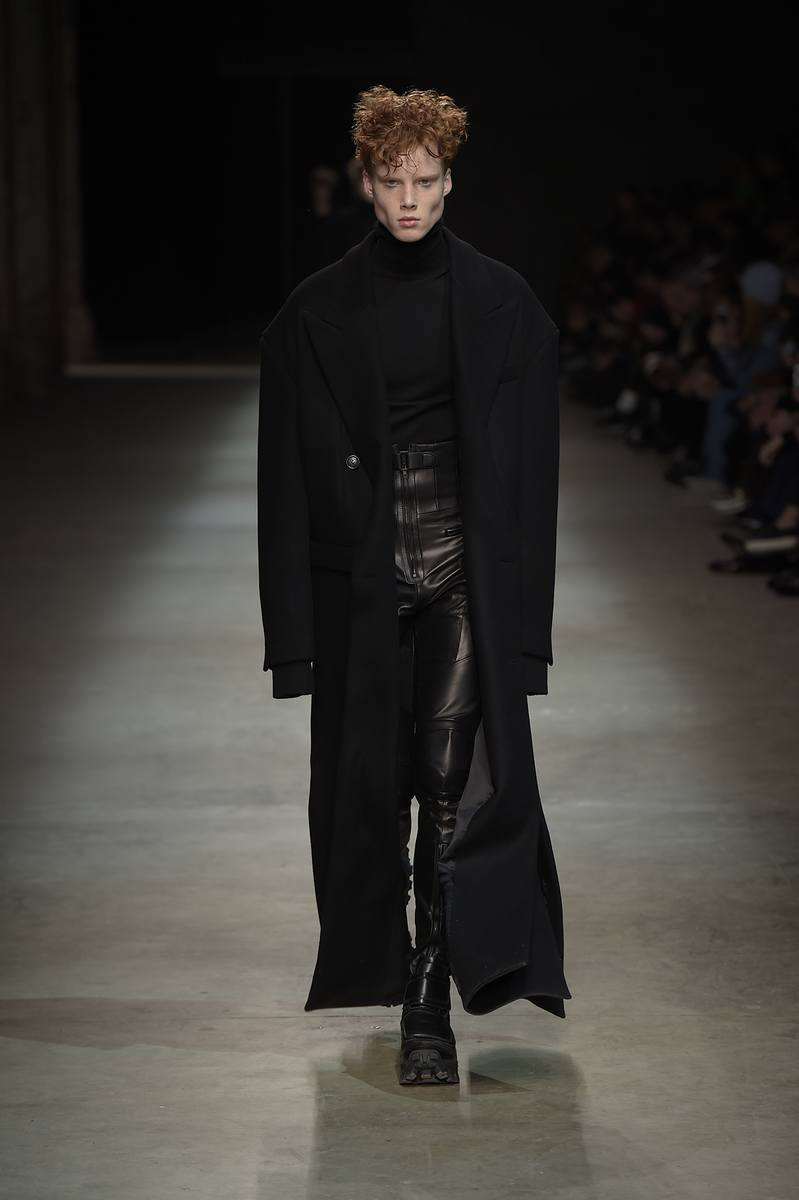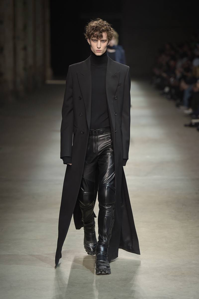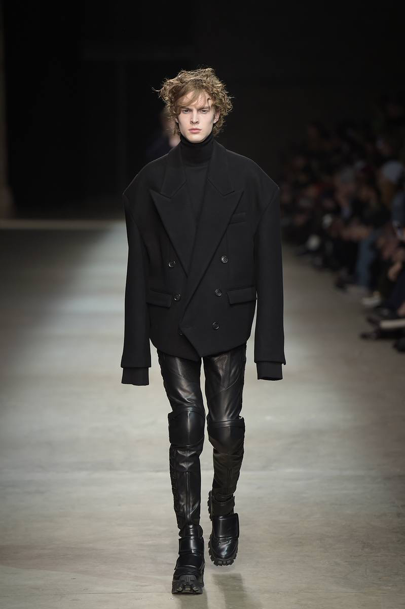 Embracing a post-apocalyptic theme, black was the running theme of the show as leather pants and sculpted leather jackets brought to mind the iconic costume of Mel Gibson in Mad Max. Draping voluminous parkas, single-breasted jackets and bomber jackets, JUUN.J also approached suiting with the same generous proportions. Rounding out the occasion, wide-cut trousers were paired with floor-length coats and paired with fashion-forward footwear of a combative nature.