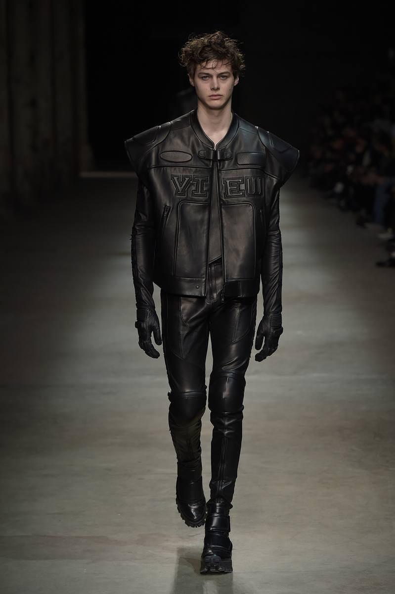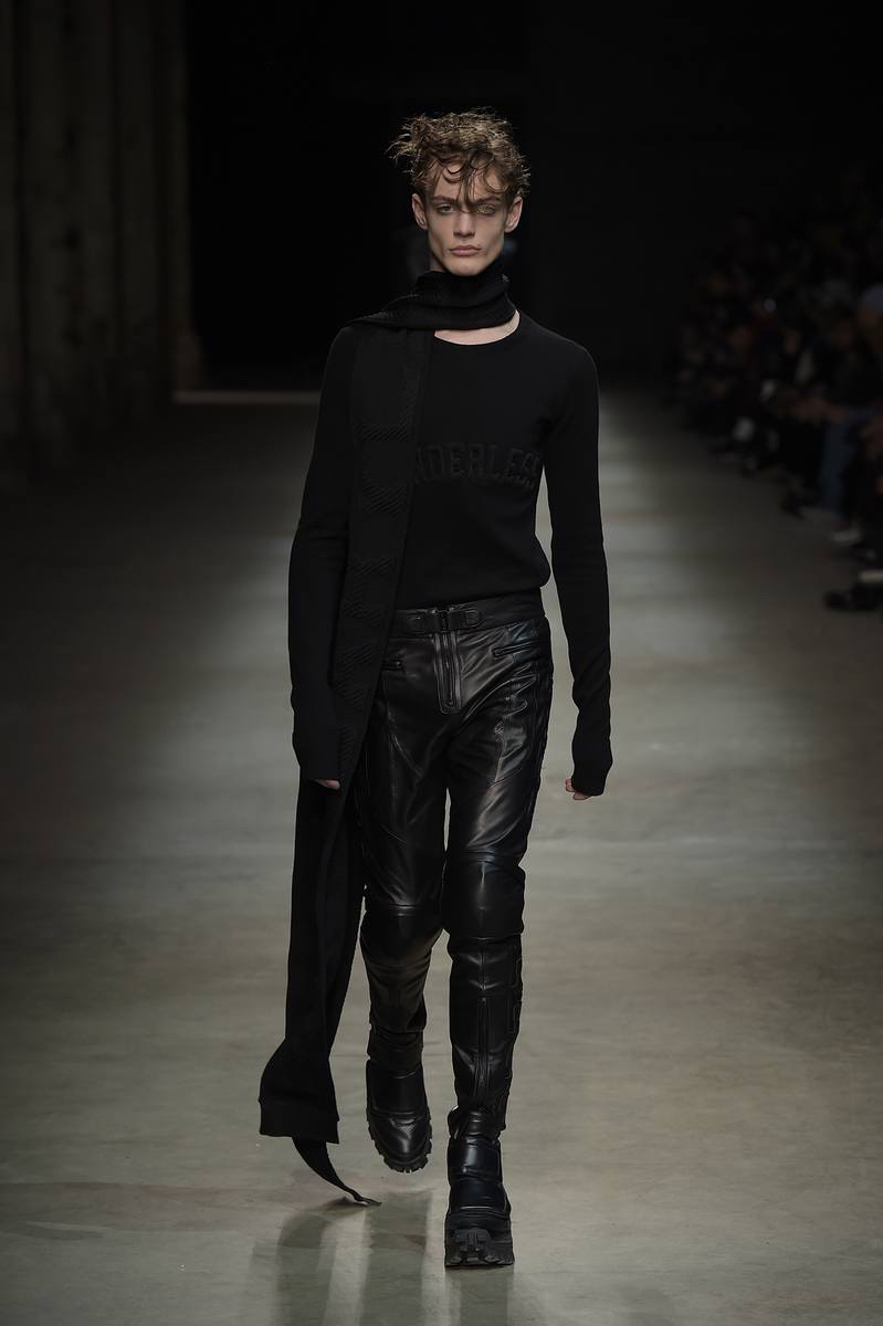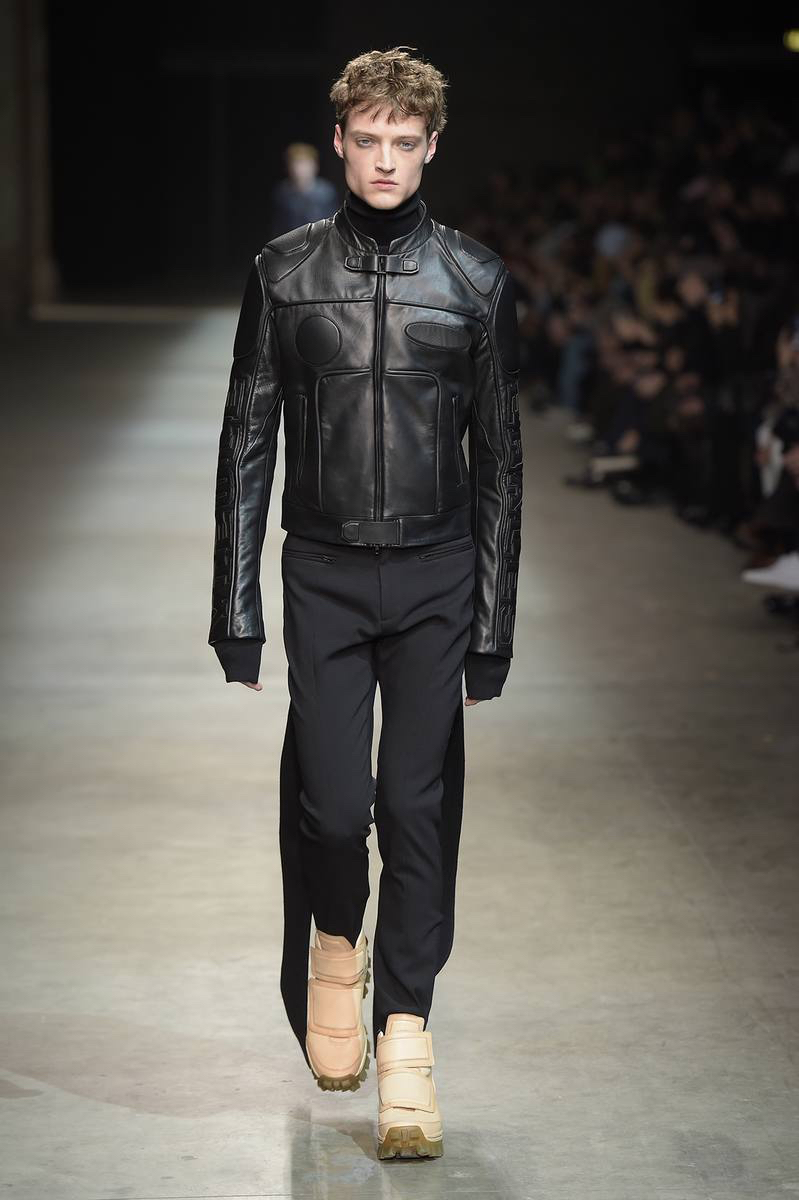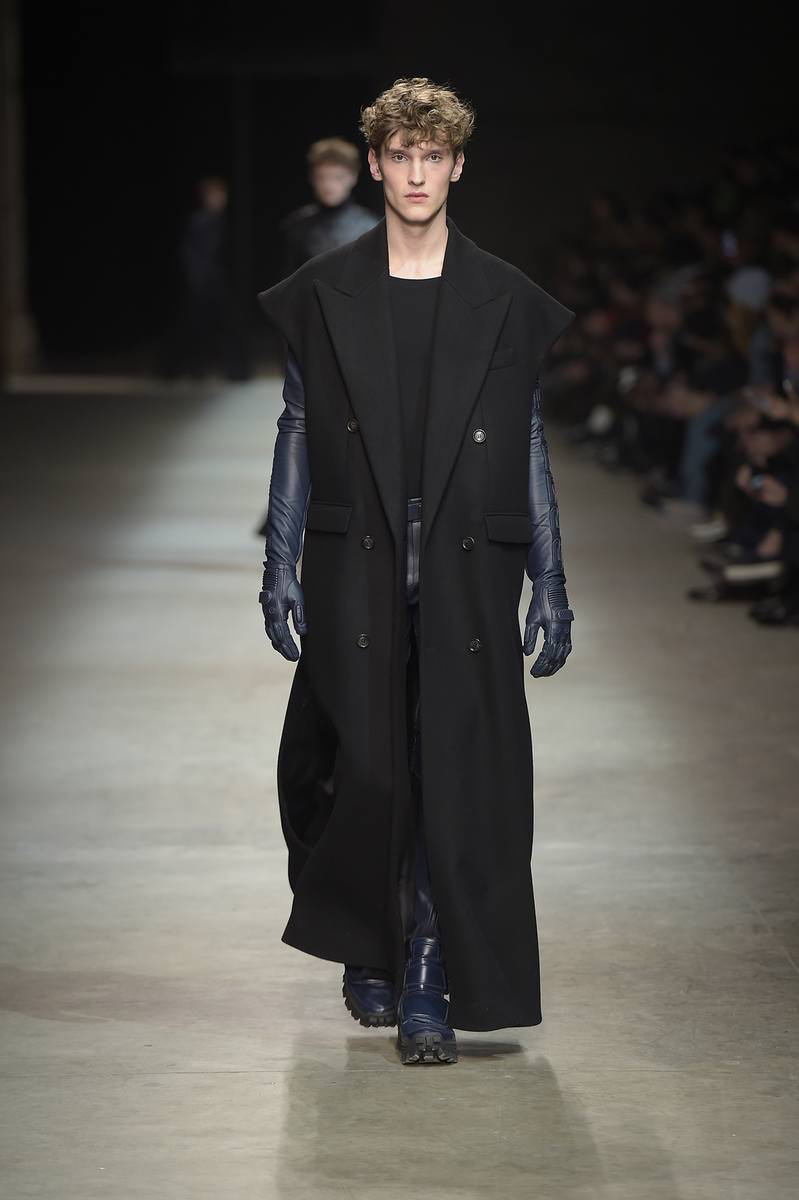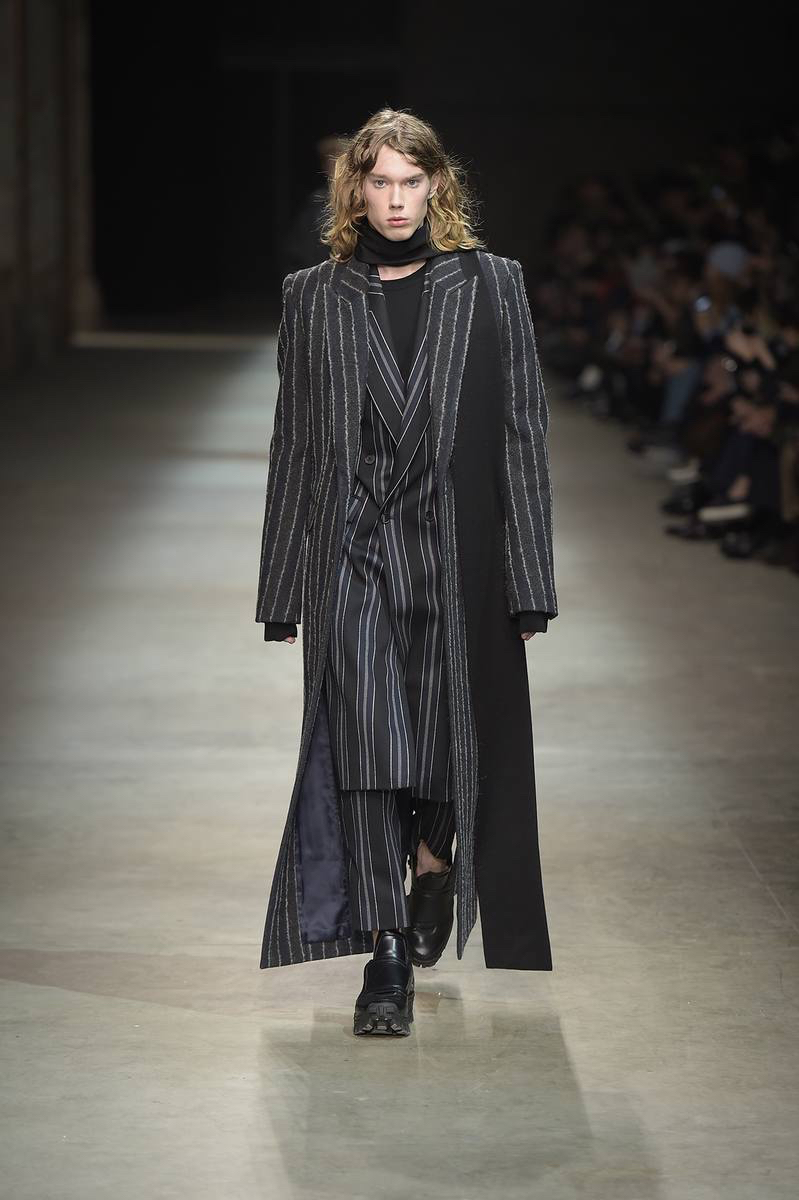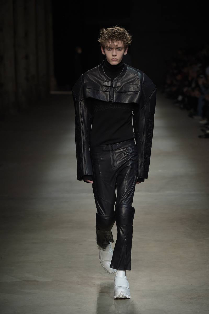 Embracing a post-apocalyptic theme, black was the running theme of the show as leather pants and sculpted leather jackets brought to mind the iconic costume of Mel Gibson in Mad Max. Draping voluminous parkas, single-breasted jackets and bomber jackets, JUUN.J also approached suiting with the same generous proportions. Rounding out the occasion, wide-cut trousers were paired with floor-length coats and paired with fashion-forward footwear of a combative nature.