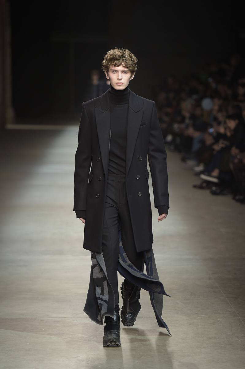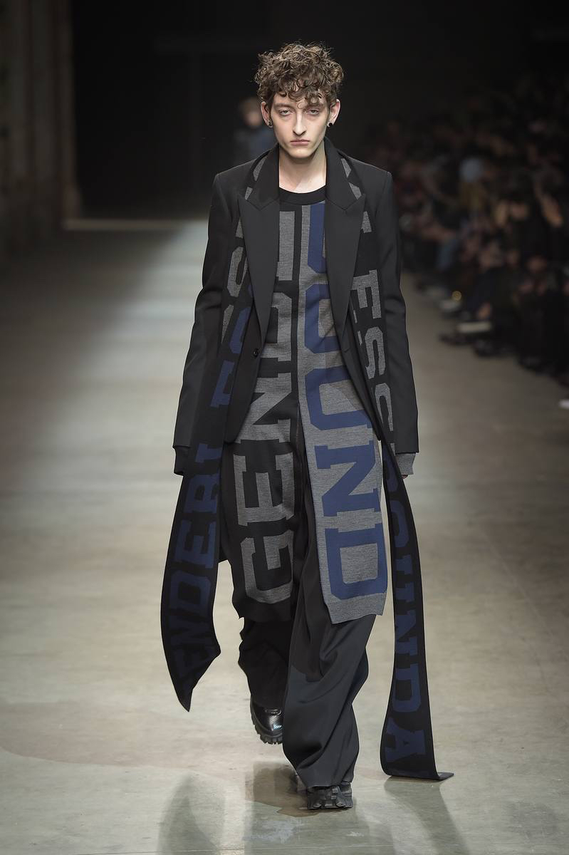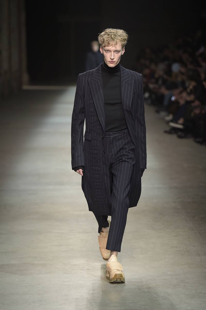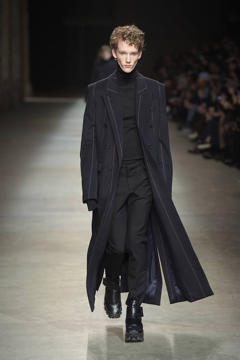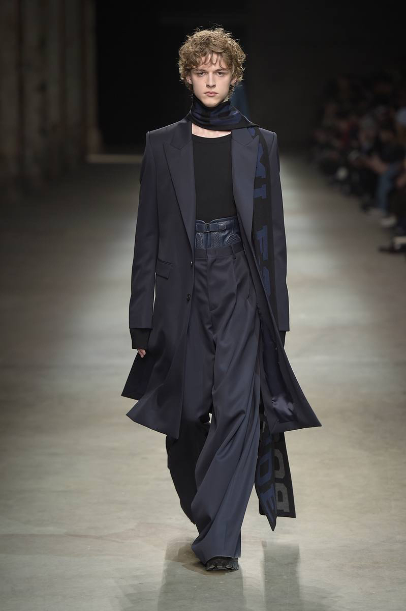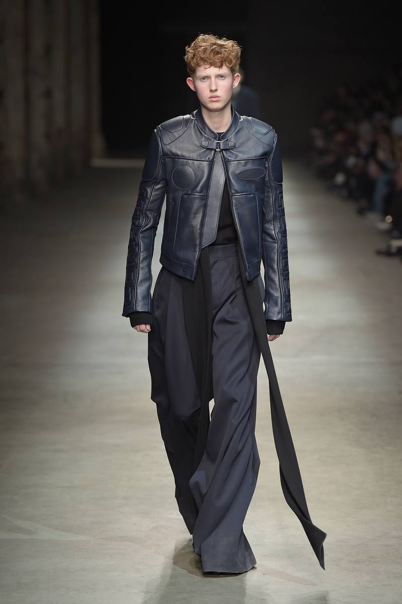 Embracing a post-apocalyptic theme, black was the running theme of the show as leather pants and sculpted leather jackets brought to mind the iconic costume of Mel Gibson in Mad Max. Draping voluminous parkas, single-breasted jackets and bomber jackets, JUUN.J also approached suiting with the same generous proportions. Rounding out the occasion, wide-cut trousers were paired with floor-length coats and paired with fashion-forward footwear of a combative nature.