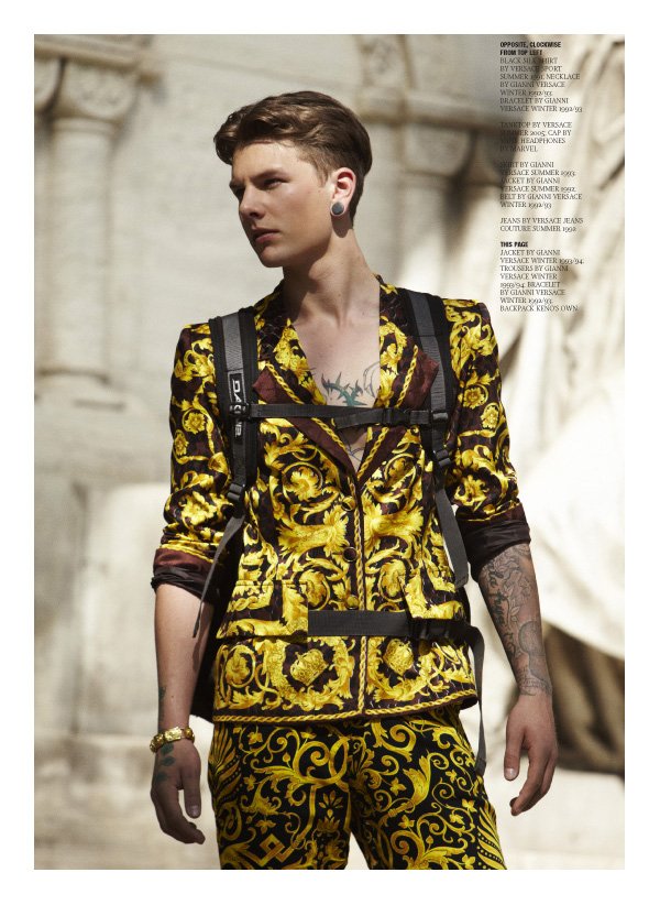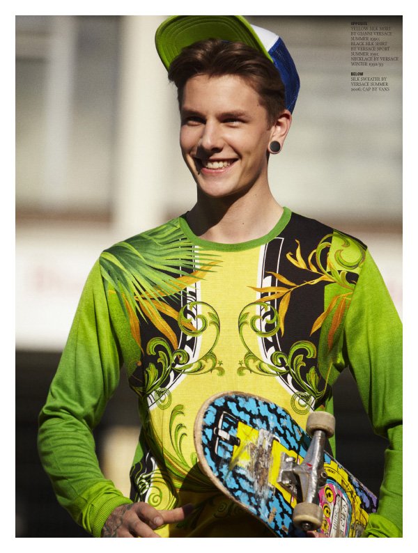 Stylist Ingo Nahrwold raids the Versace archives for a special story in the latest issue of Hero magazine. Featuring Keno photographed by Stefan Heinrichs as the nostalgic skateboarder, the model dons a mix of the label’s finest dating back to the early 90’s and time of Gianni Versace.