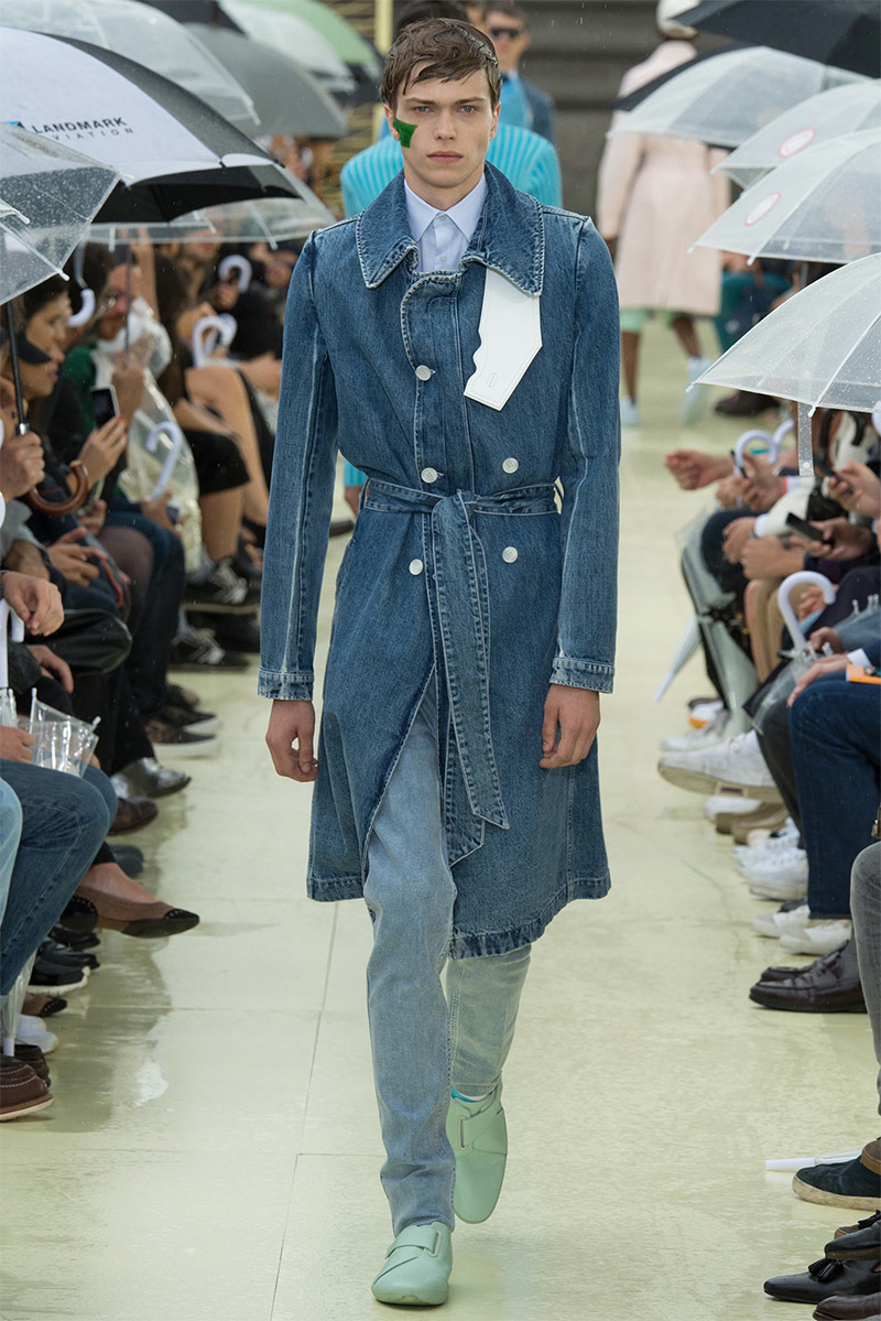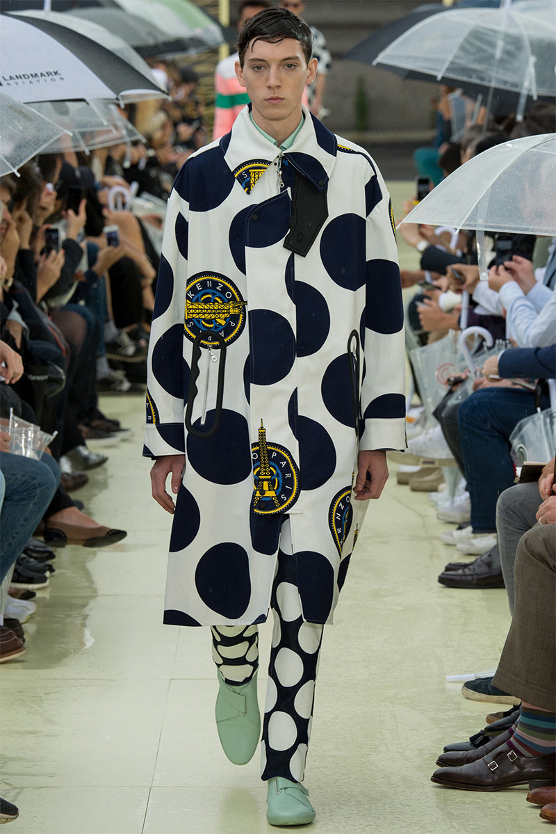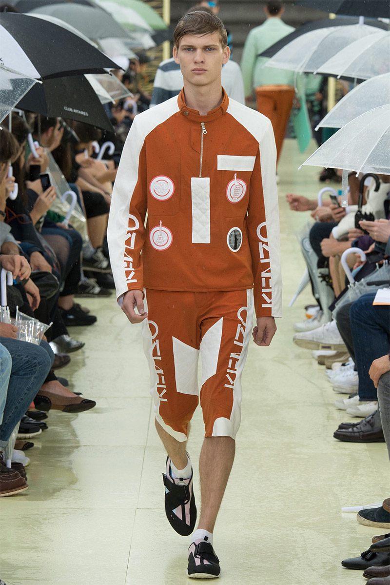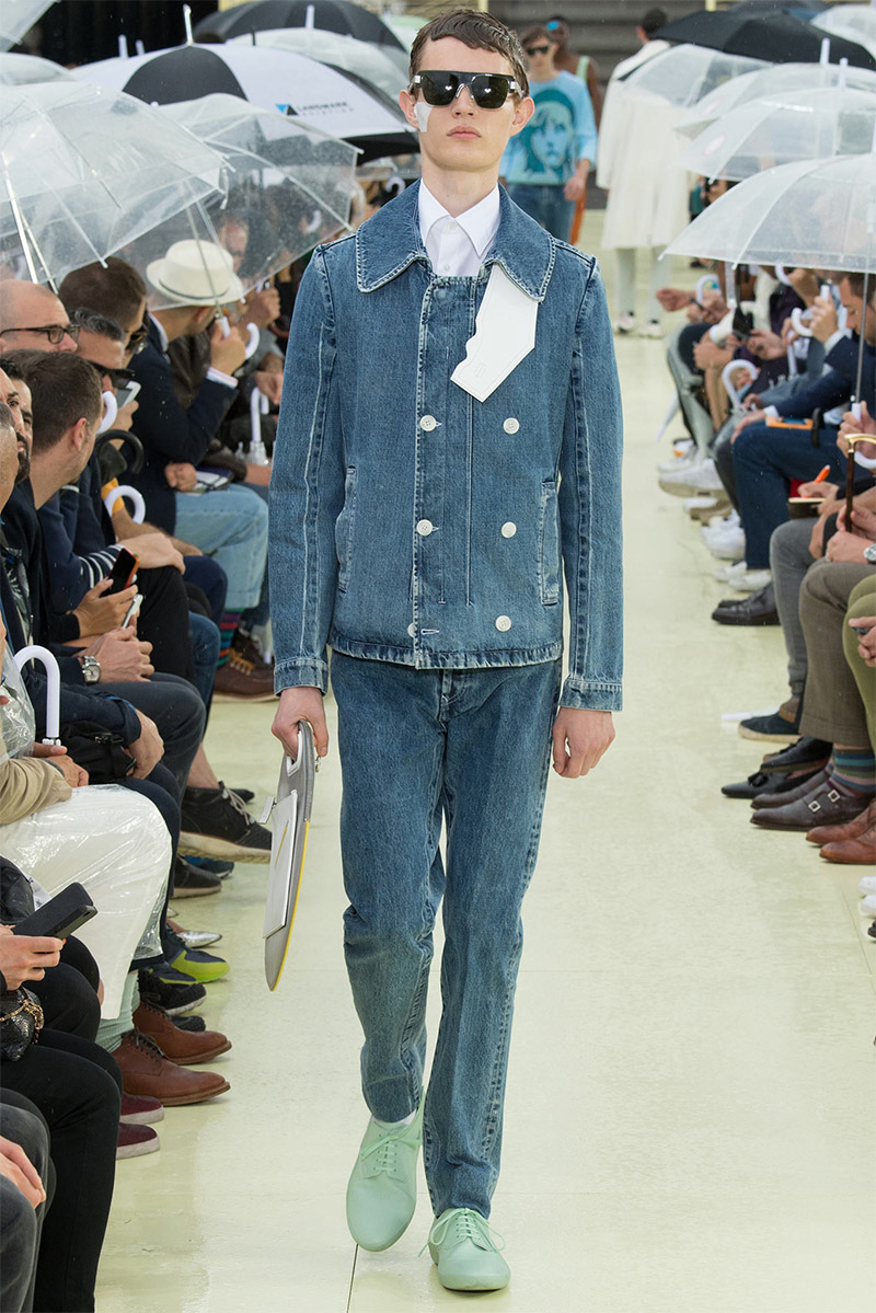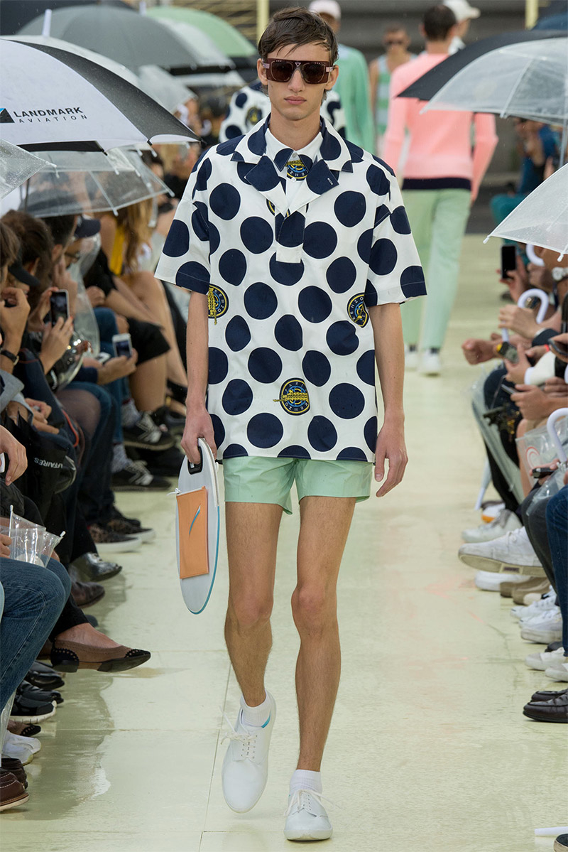 Kenzo Spring/Summer 2015–Kenzo creative directors Carol Lim and Humberto Leon were inspired by Parisian style and men from abroad who imitate it. Comparative to their own experiences and seeing the Kenzo man as an American in Paris, Lim and Leon set out to weave a tourist’s narrative into their spring/summer 2015 collection. Here, on a rainy Parisian day, they presented a youthful collection, complete with bright pops of color and bold prints. While giant polka dots covered sporty looks executed with elegant lines, green was a major note of the collection, inspired by the French gift of the Statue of Liberty to the United States in 1886 to celebrate its independence. The Statue of Liberty even made an appearance on tanks and pullovers. Lim and Leon even touched upon the denim trend, crafting classics such as the double-breasted coat and bomber jacket out of the fabric.
