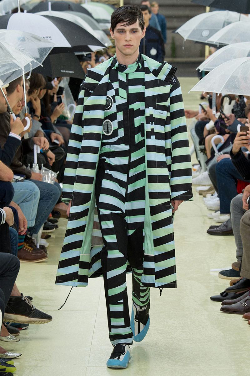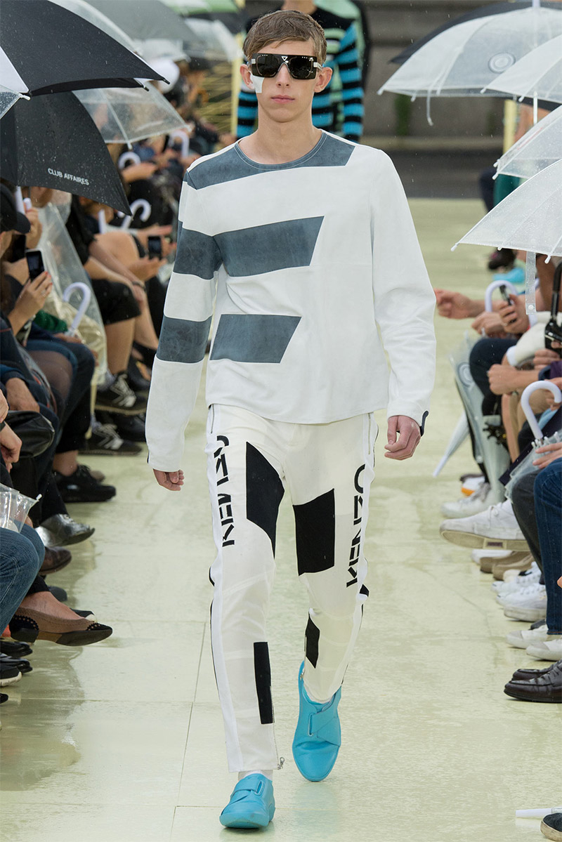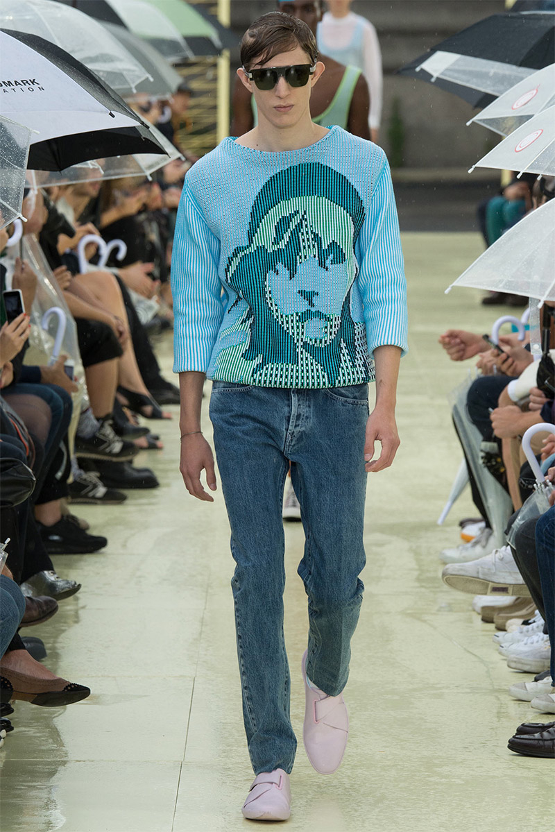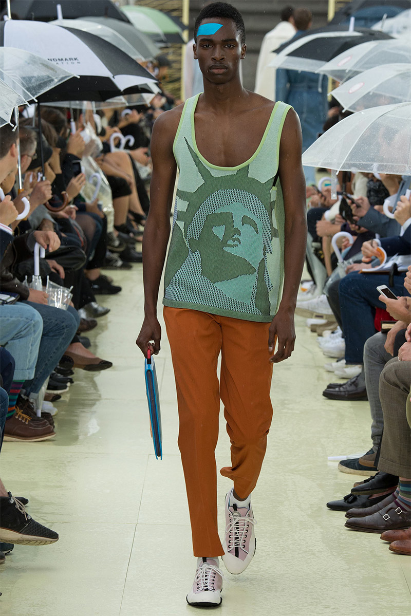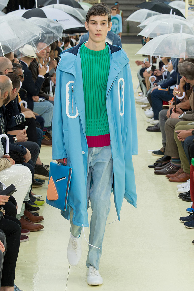 Kenzo Spring/Summer 2015–Kenzo creative directors Carol Lim and Humberto Leon were inspired by Parisian style and men from abroad who imitate it. Comparative to their own experiences and seeing the Kenzo man as an American in Paris, Lim and Leon set out to weave a tourist’s narrative into their spring/summer 2015 collection. Here, on a rainy Parisian day, they presented a youthful collection, complete with bright pops of color and bold prints. While giant polka dots covered sporty looks executed with elegant lines, green was a major note of the collection, inspired by the French gift of the Statue of Liberty to the United States in 1886 to celebrate its independence. The Statue of Liberty even made an appearance on tanks and pullovers. Lim and Leon even touched upon the denim trend, crafting classics such as the double-breasted coat and bomber jacket out of the fabric.