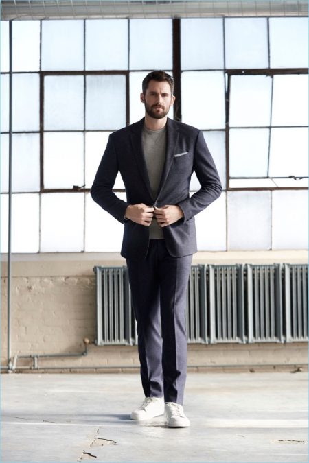 Embracing a contemporary look, Kevin Love wears a Banana Republic suit with sneakers and a sweatshirt.
